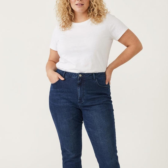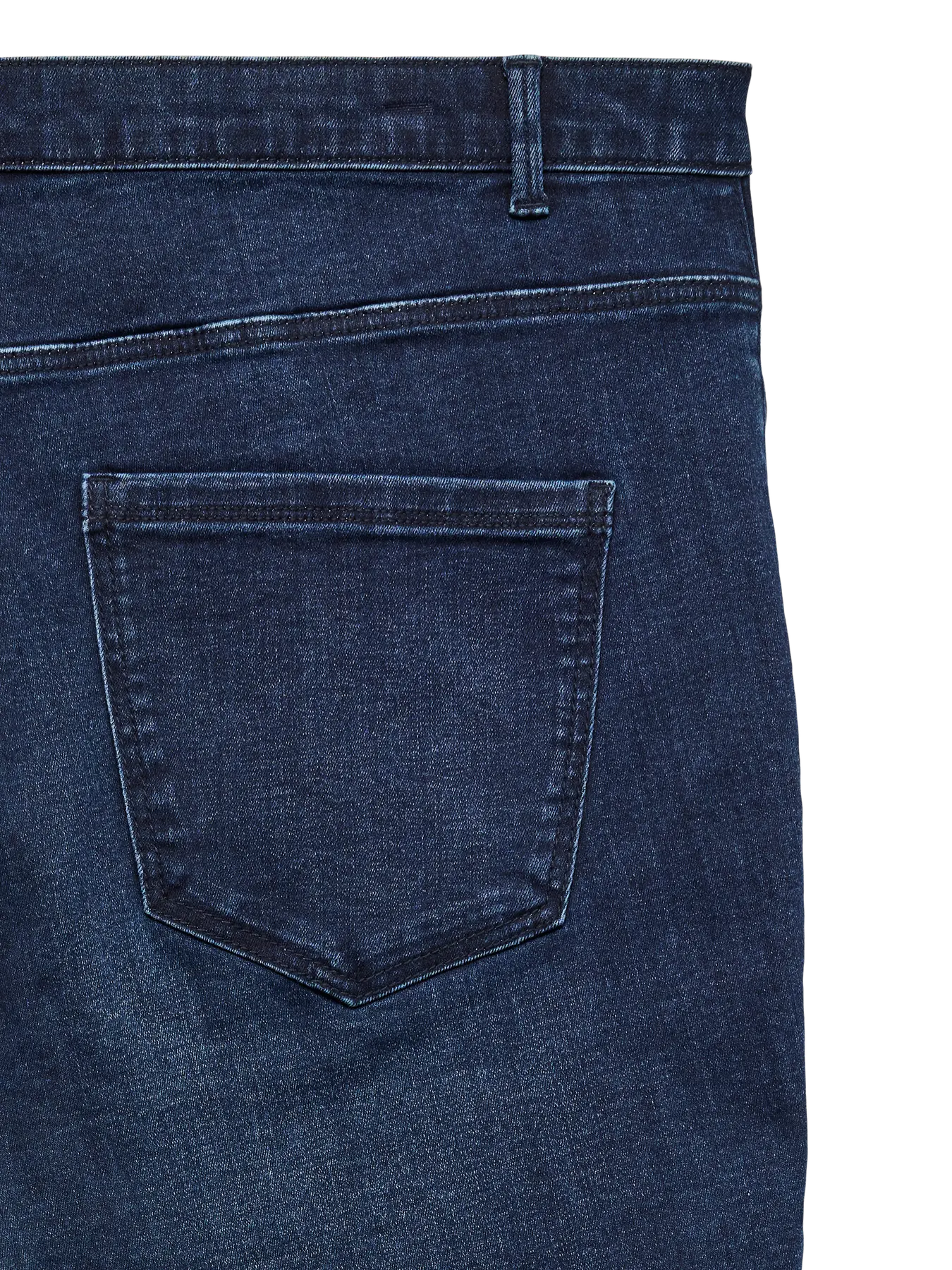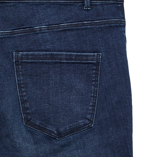 Skab en flot silhuet med disse alsidige plus size jeans, der smyger sig perfekt om kroppens former. Bukserne præsenterer sig i en dyb mørkeblå nuance med pæne, lysere slidte detaljer langs lårene, som giver et flot og levende udtryk. Den klassiske front byder på en synlig metalknap, solide bæltestropper samt praktiske forlommer og en lille møntlomme. Det er et fantastisk valg, hvis du leder efter ægte komfort kombineret med et tidløst denimdesign fra vores udvalg af Vero Moda Curve jeans.