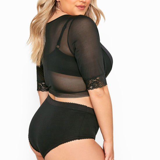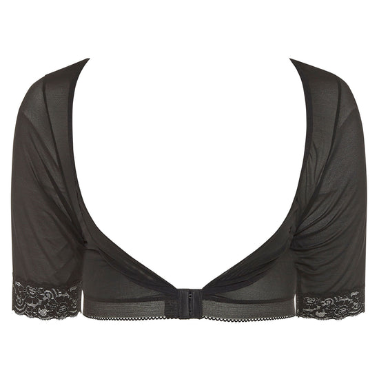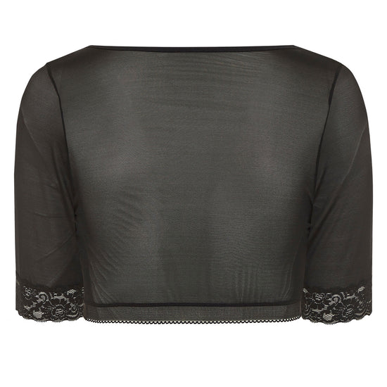Blusen er lavet af et gennemsigtigt mesh-stof, bestående af 90% polyamid og 10% elastan, hvilket giver et let og åndbart materiale. Den delikate blonde er ligeledes lavet af 90% polyamid og 10% elastan. Med en samlet længde på cirka 39 cm, er denne bluse ideel til lag-på-lag styling.