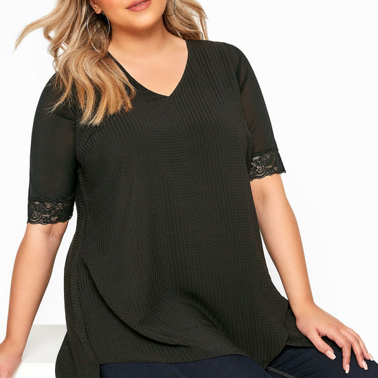 Oplev den perfekte kombination af stil og komfort med denne bluse fra Yours. Blusen er designet med hægte foran, der gør den nem at tage på og af. De korte ærmer med blondekant tilføjer et feminint touch til dit look.