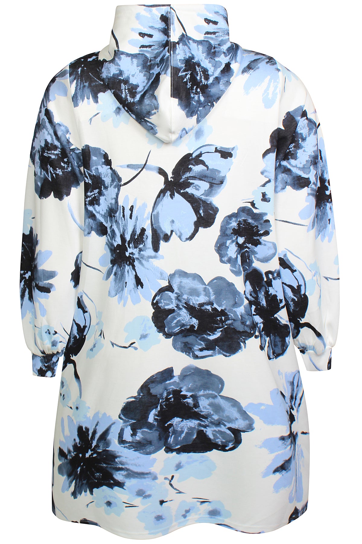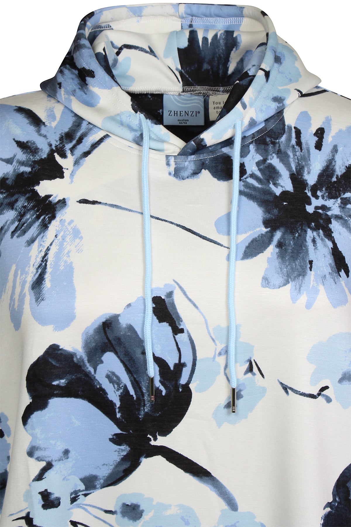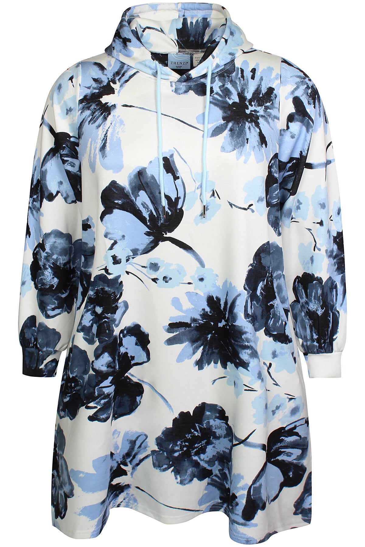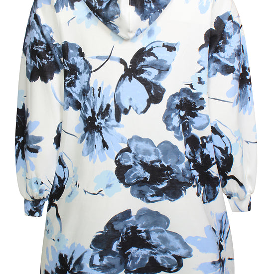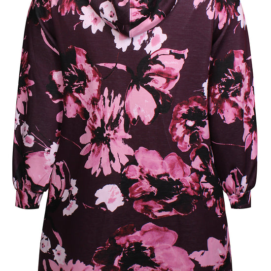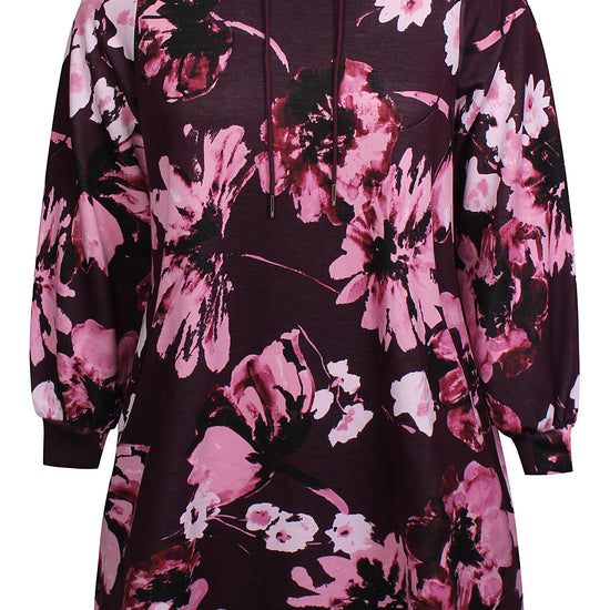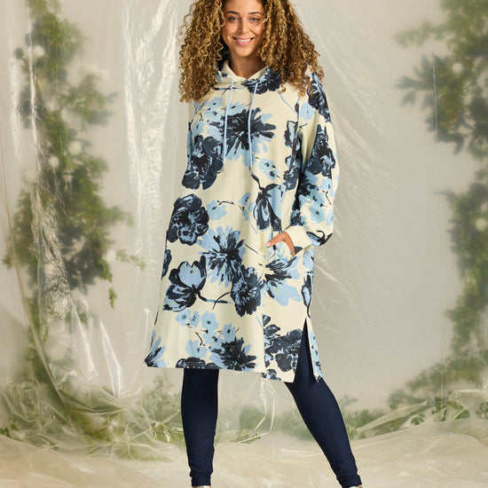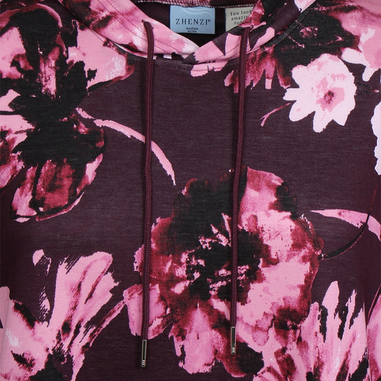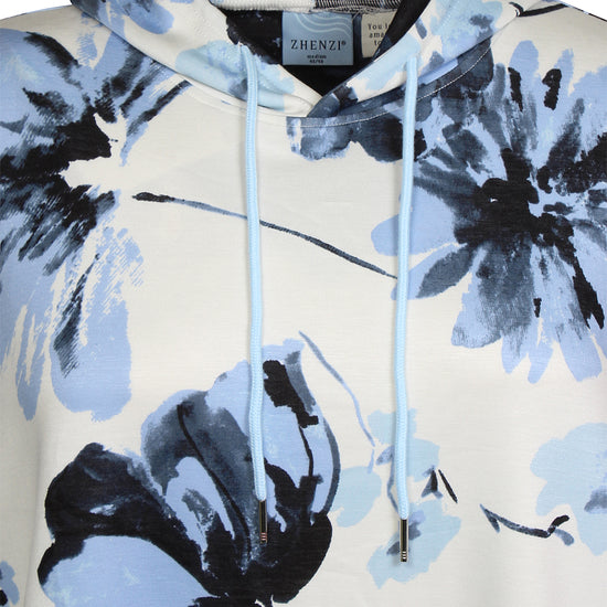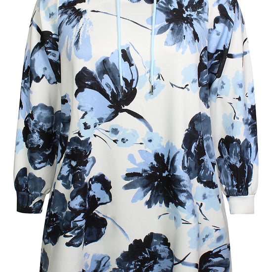 Denne afslappede model fra Zhenzi forener høj komfort med et moderne design, der passer perfekt til hverdagen. Den er udformet som en lang hættetrøje med snøre ved halsen og et iøjnefaldende grafisk blomsterprint, der giver kant til det ellers enkle snit.