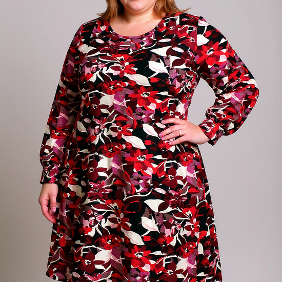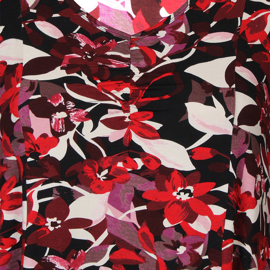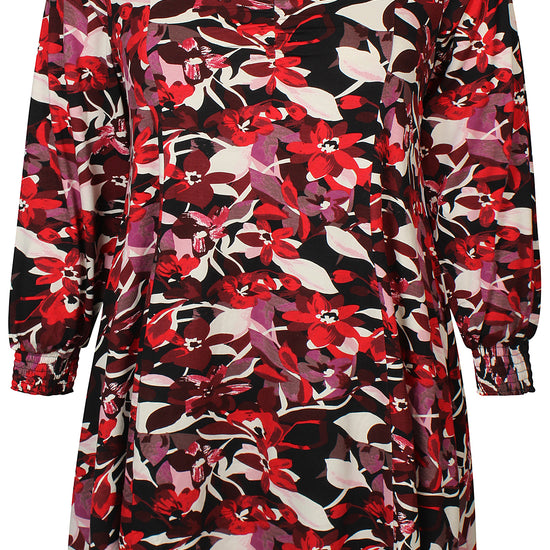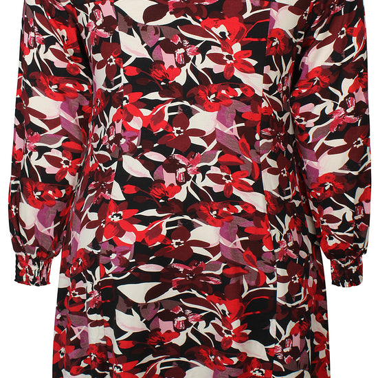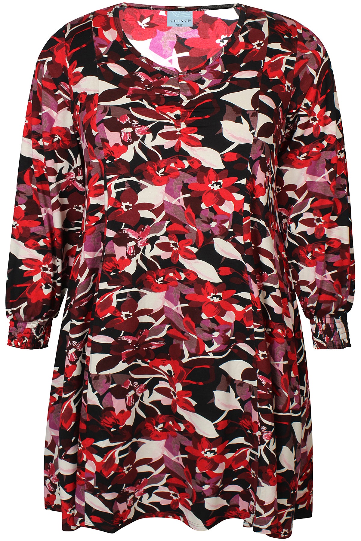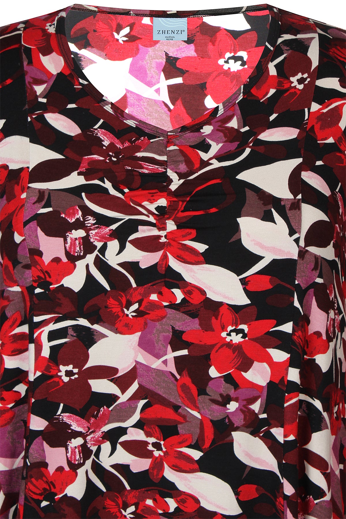 Skab et iøjnefaldende look med denne smukke tunika-kjole fra Zhenzi. Den er perfekt til dig, der ønsker både komfort og et feminint udtryk. Kjolen har et levende blomstermønster i røde, bordeaux og lilla nuancer, og byder på: