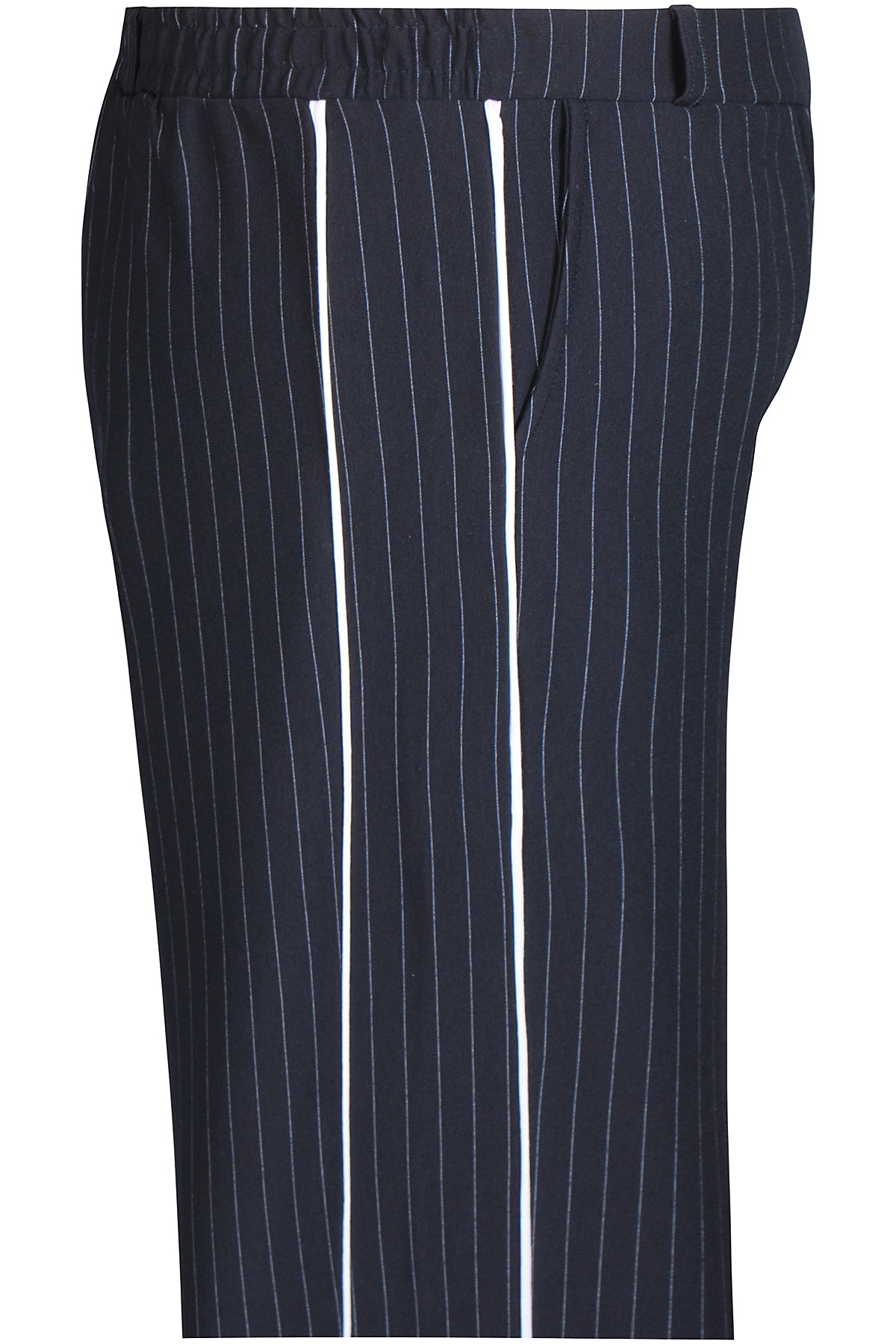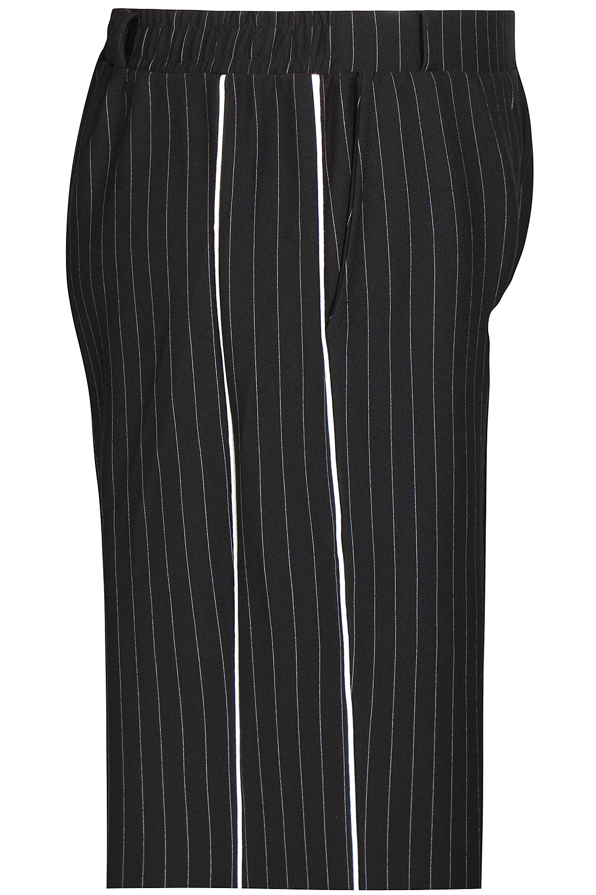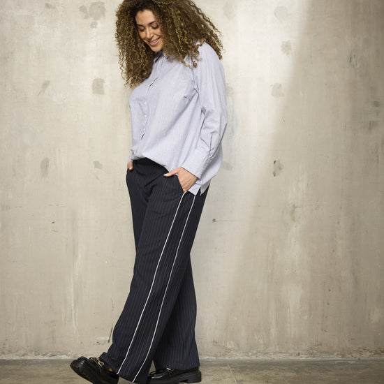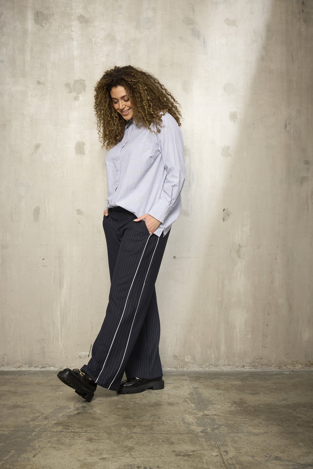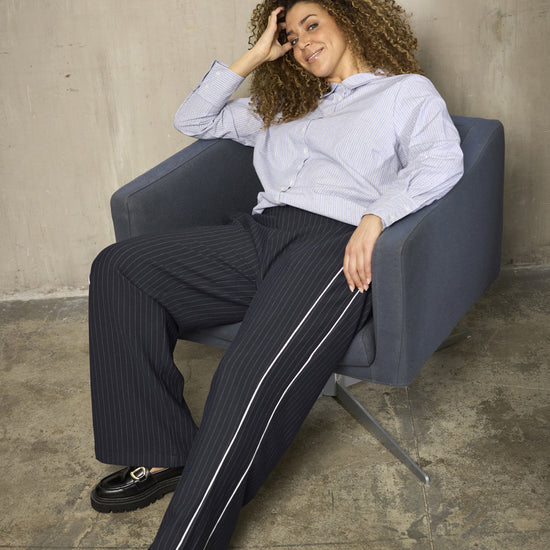 Bukserne har et alsidigt look, der gør dem ideelle til både afslappede og mere formelle anledninger. Den brede pasform og diskrete stribeeffekt giver et slankende og sofistikeret udtryk, mens piping-detaljen tilfører et sporty twist. Match dem med en skjorte eller en plus size top for et elegant hverdagsoutfit, eller style dem med en plus size blazer til kontoret.