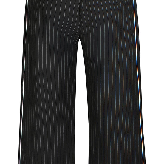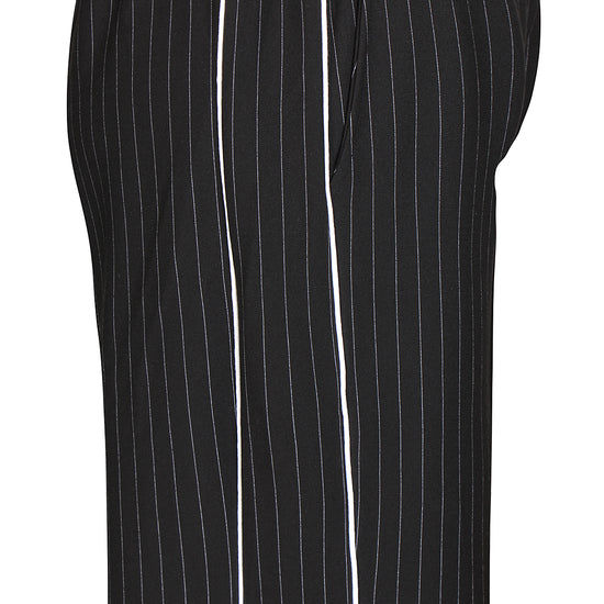 - Design: Løse, brede ben med lodrette striber og hvid piping-detalje langs benene