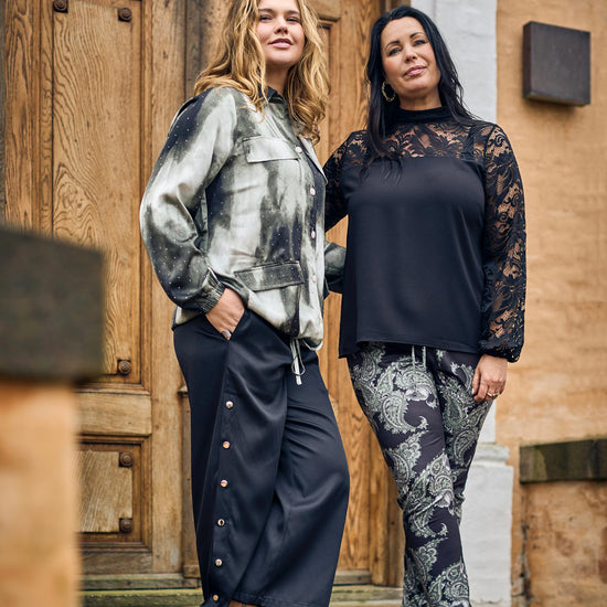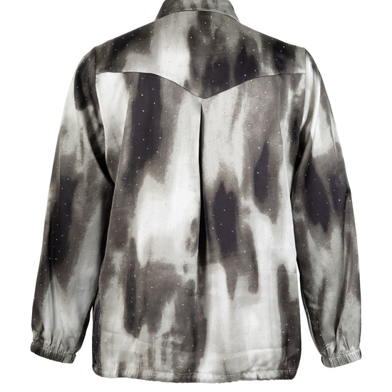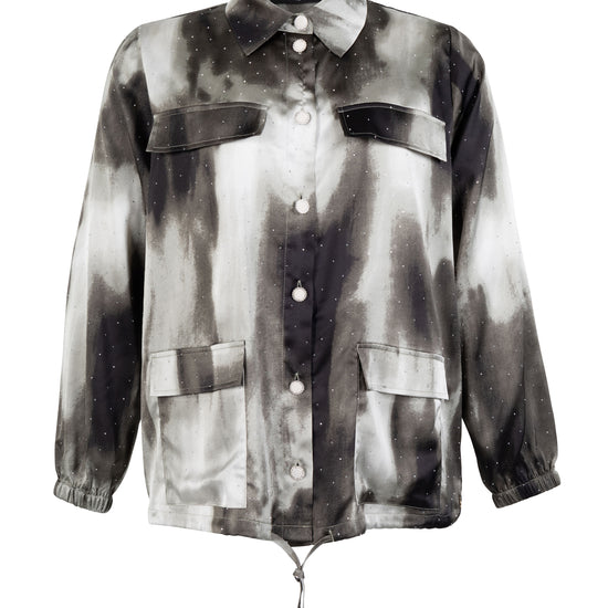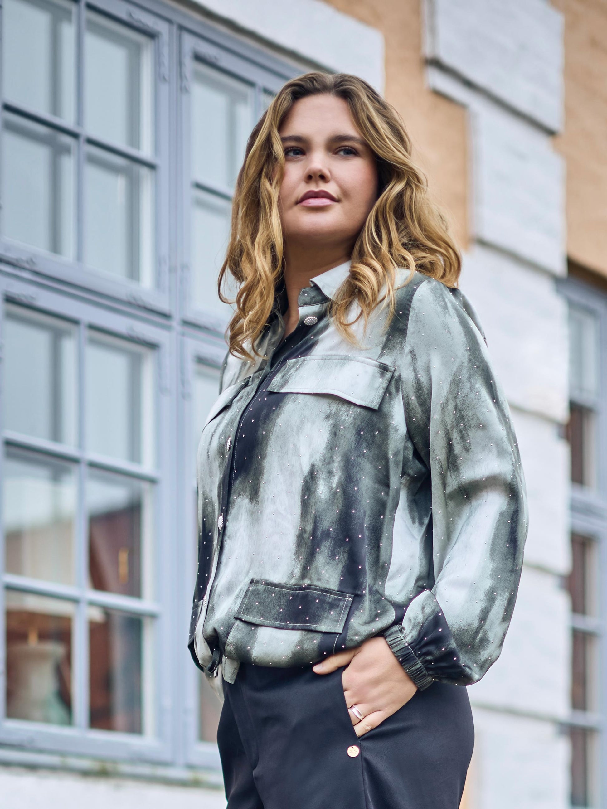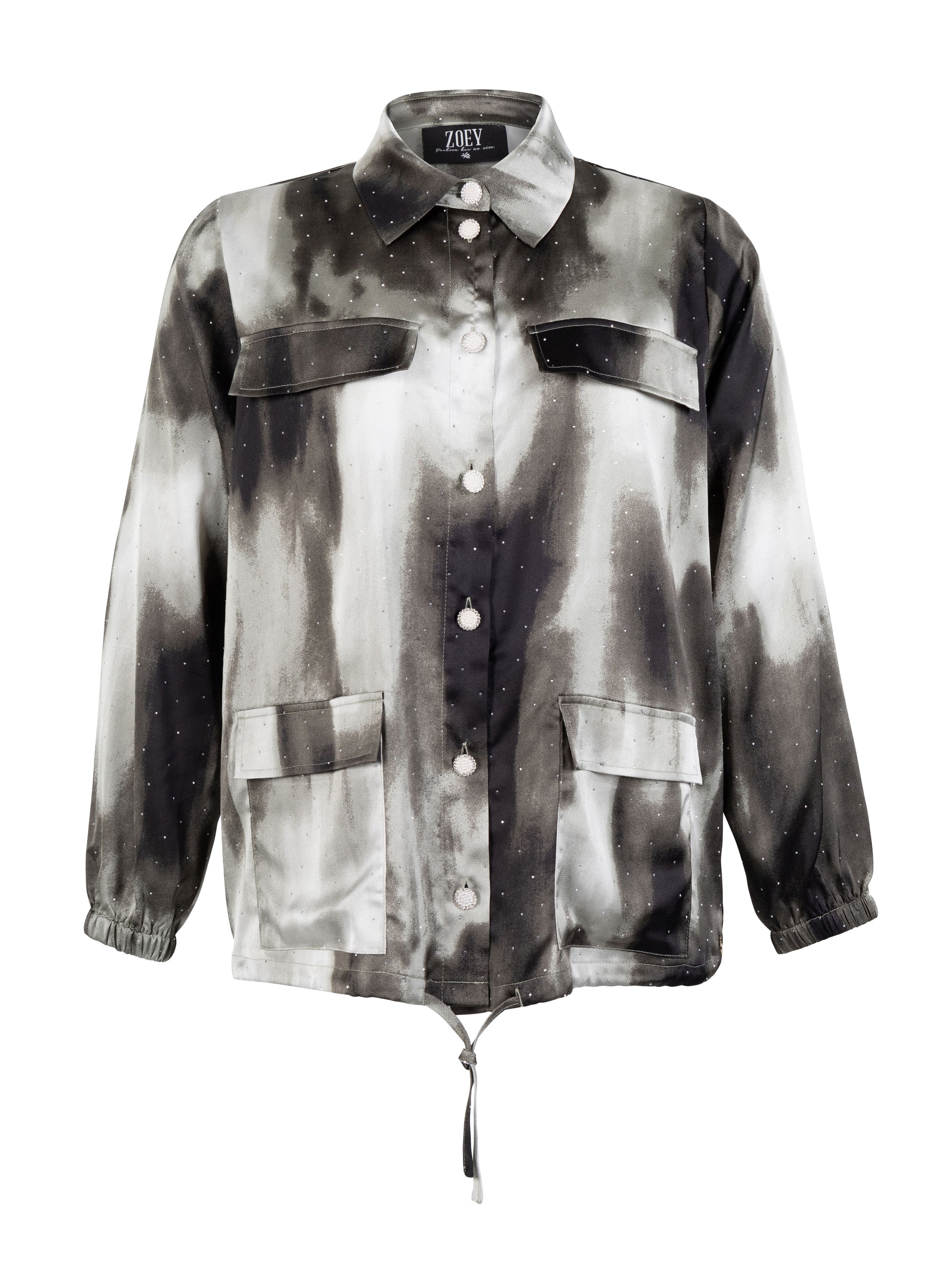 Denne skjorte fra ZOEY kombinerer et moderne marmoreret print i smukke nuancer af mørkegrøn og grå med klassiske skjortedetaljer. Skjorten er fremstillet i 100 % polyester, hvilket gør den let og behagelig at have på – uanset om du bruger den til hverdag eller til et mere formelt look.