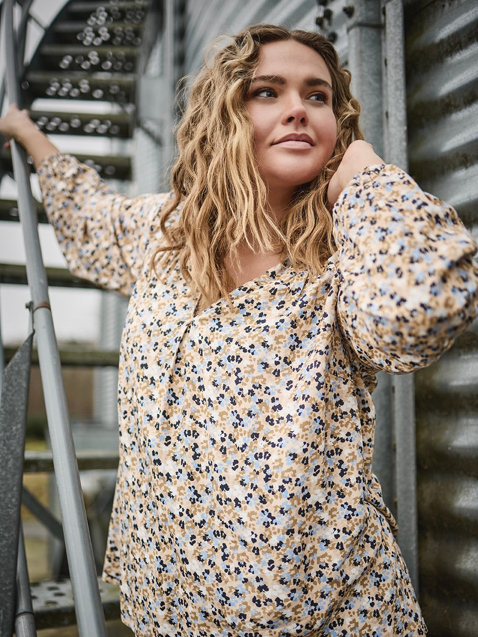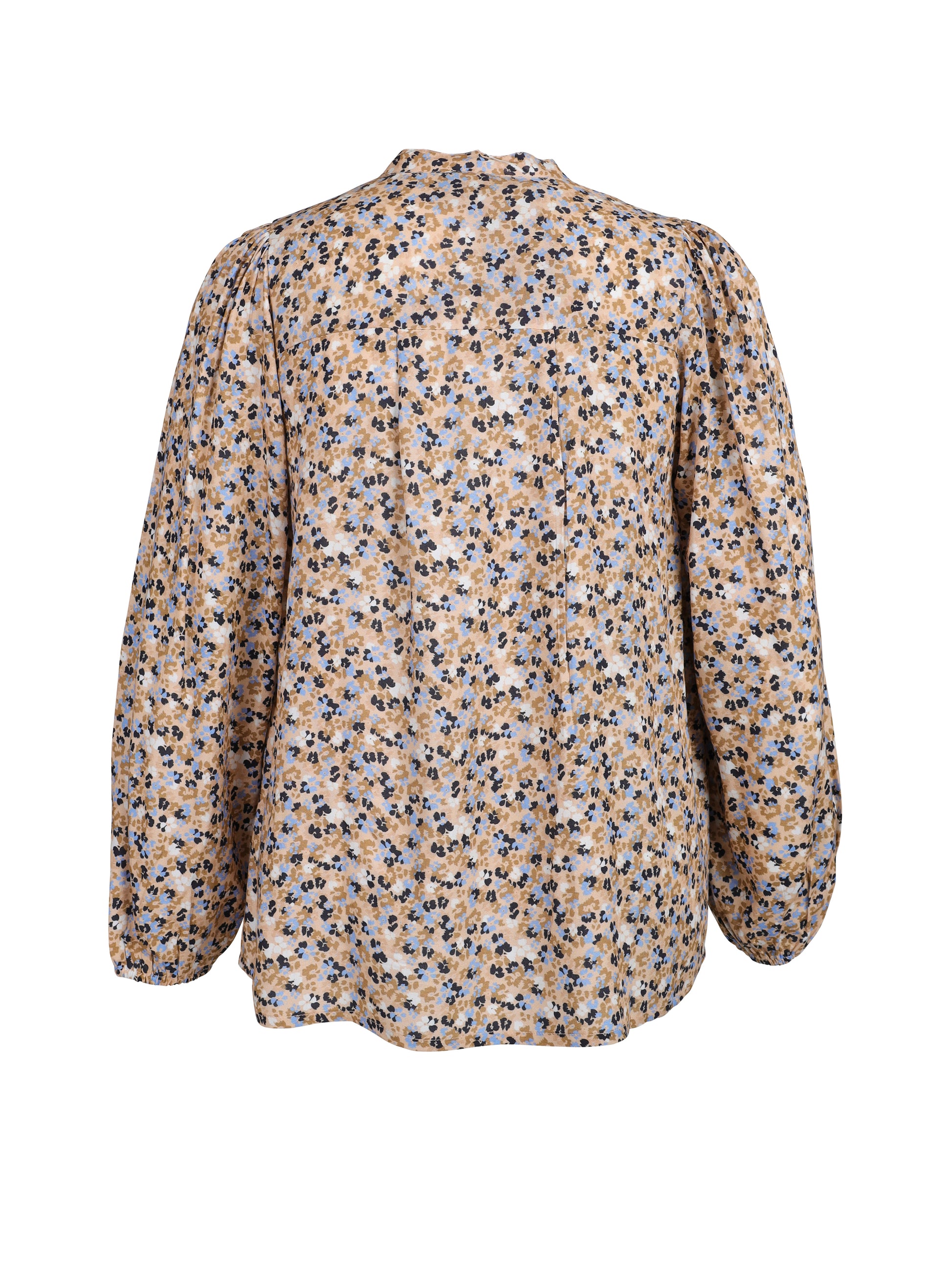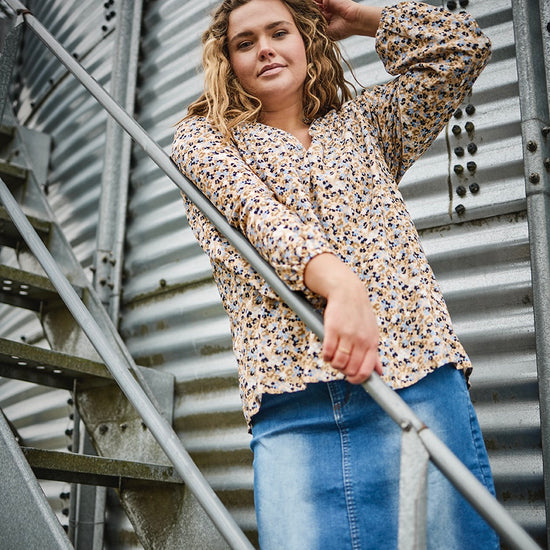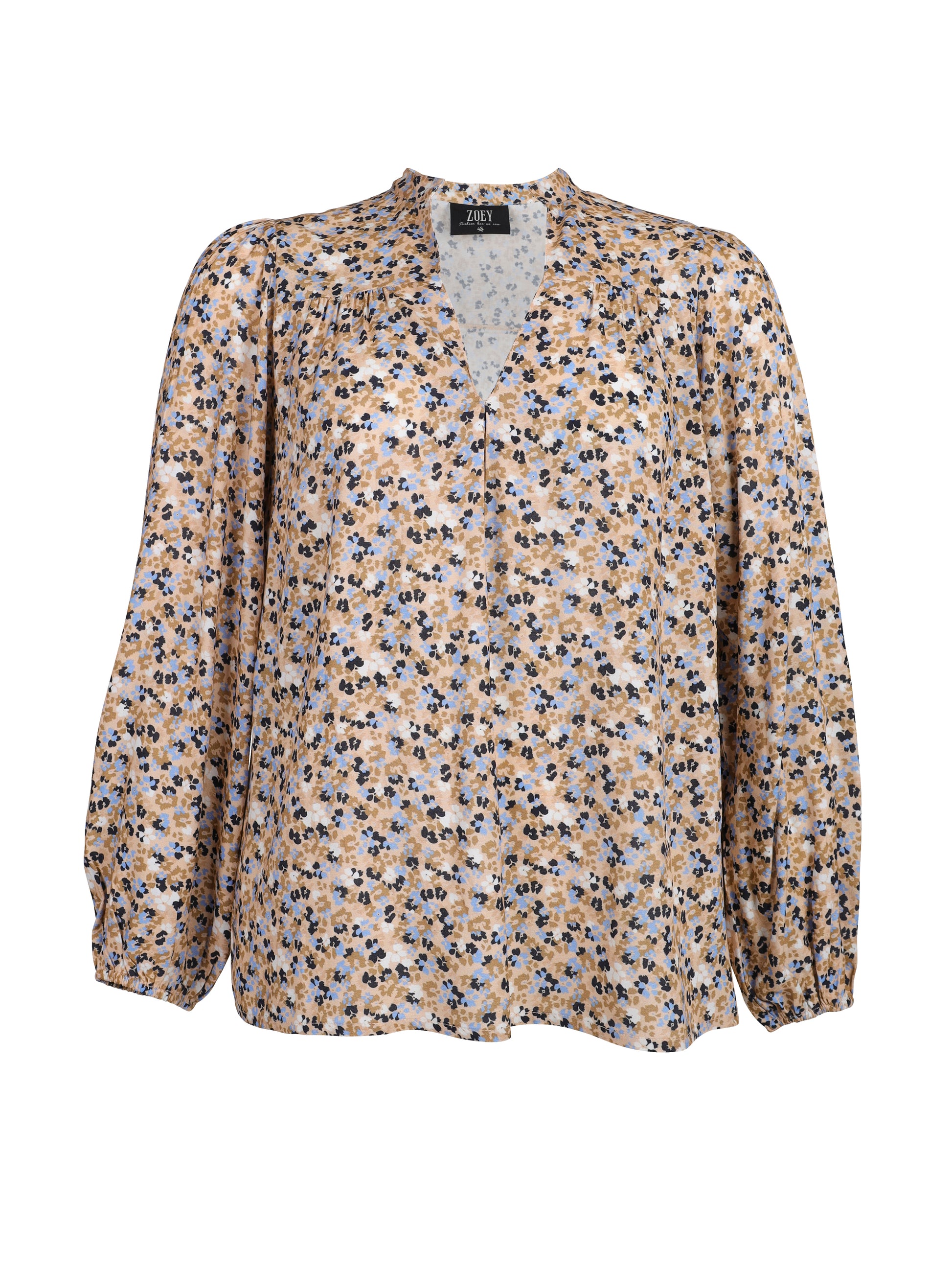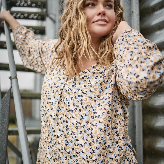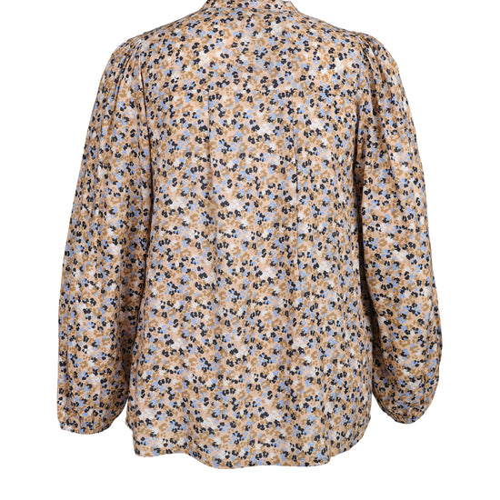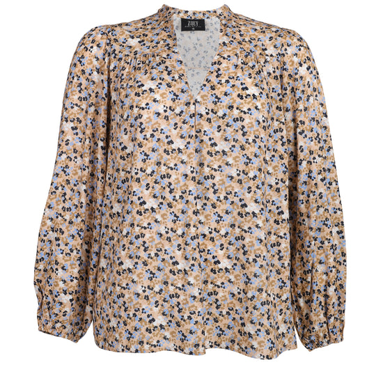 Giv din garderobe et frisk pust med denne skønne bluse fra ZOEY. Det småblomstrede mønster i blå, sort og beige på sandfarvet bund giver et feminint udtryk, mens den løse pasform sikrer maksimal komfort. Blusen er fremstillet i 100% viskose, som føles let og behagelig mod huden.