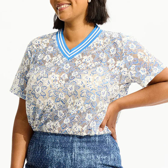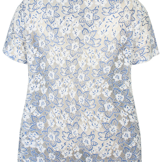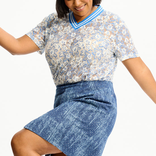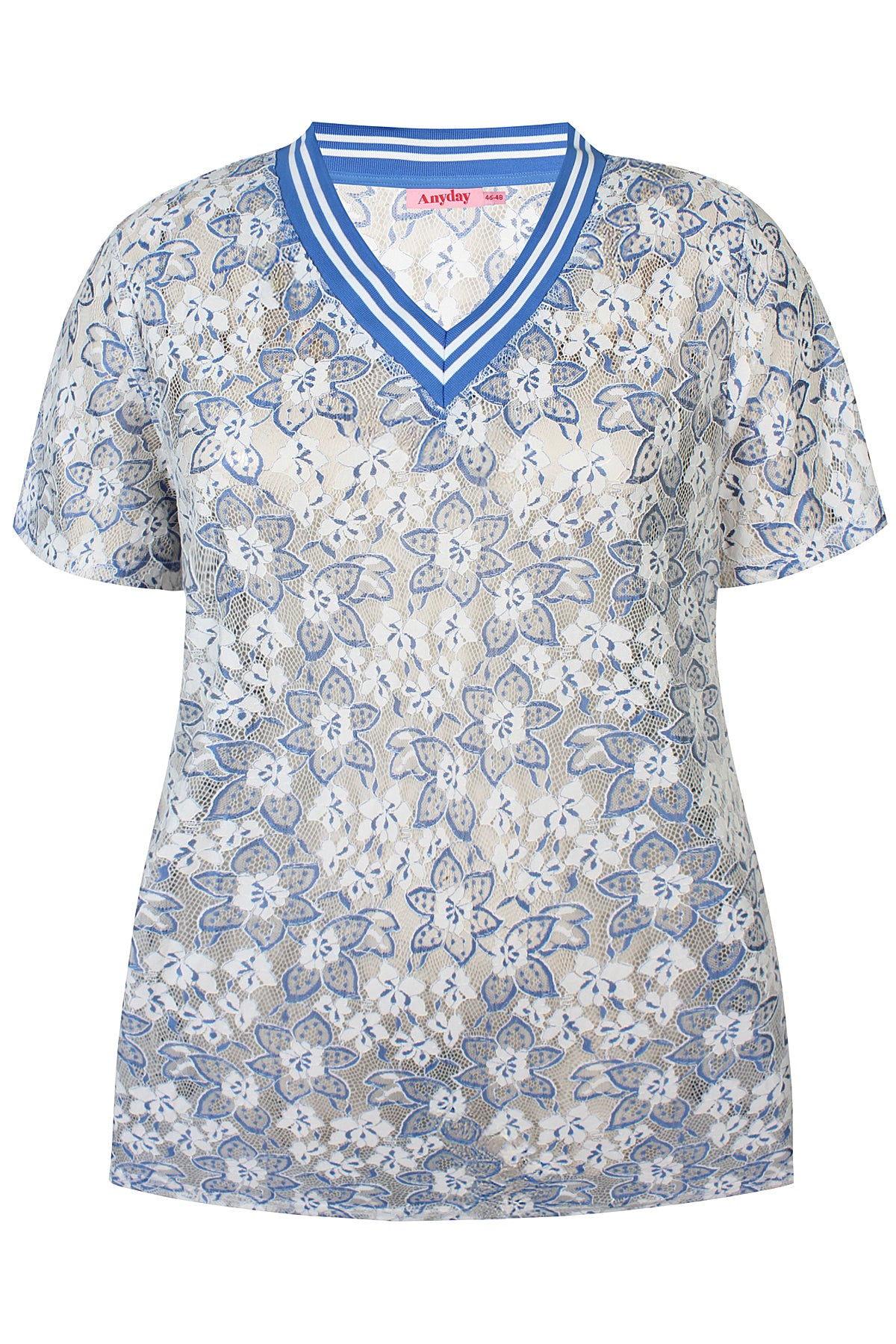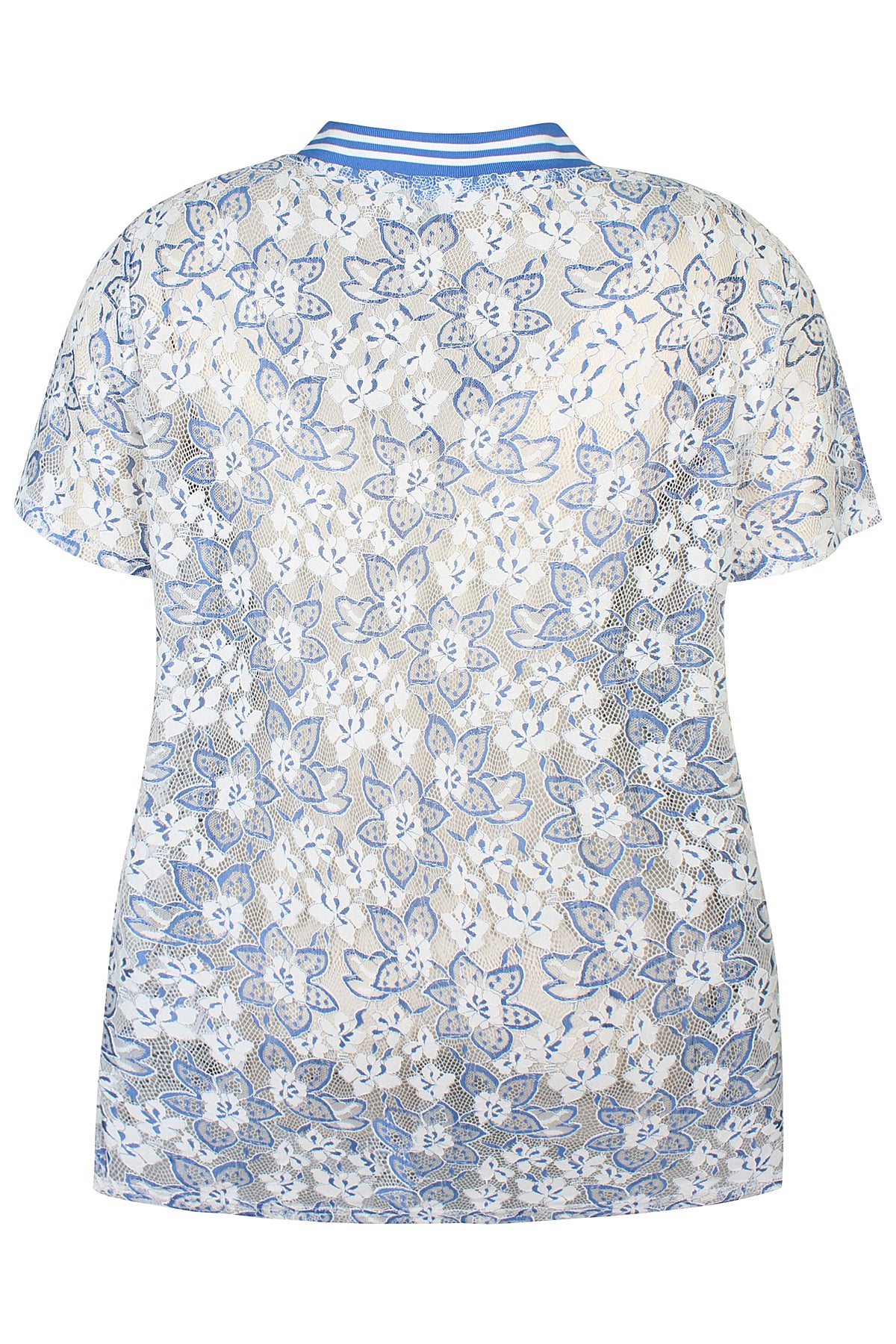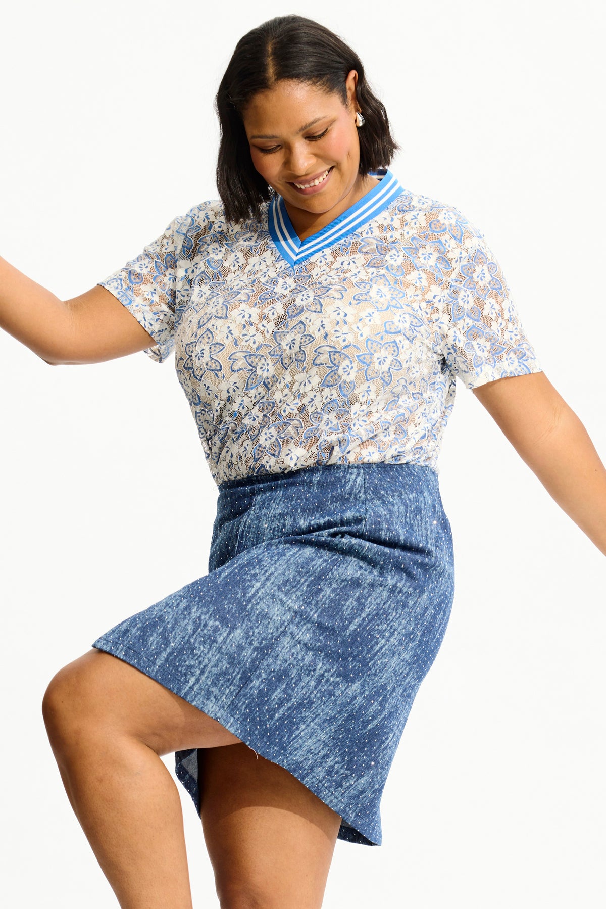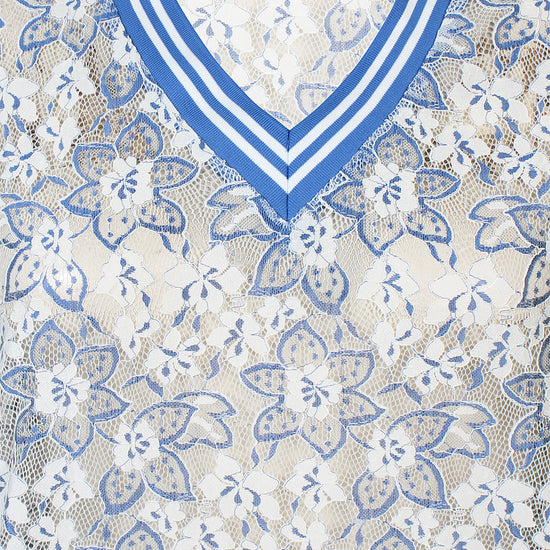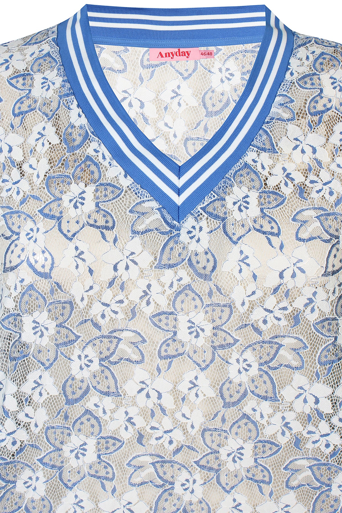 Skap en unik og personlig look med denne stilige overdelen, som kombinerer det feminine med det sporty på en fin måte. Modellen har et vakkert, transparent blondemønster med blå blomster, som brytes av en markant ribbekant i halsen med sportsstriper. Du kan se flere flotte styles fra merket Anyday her.