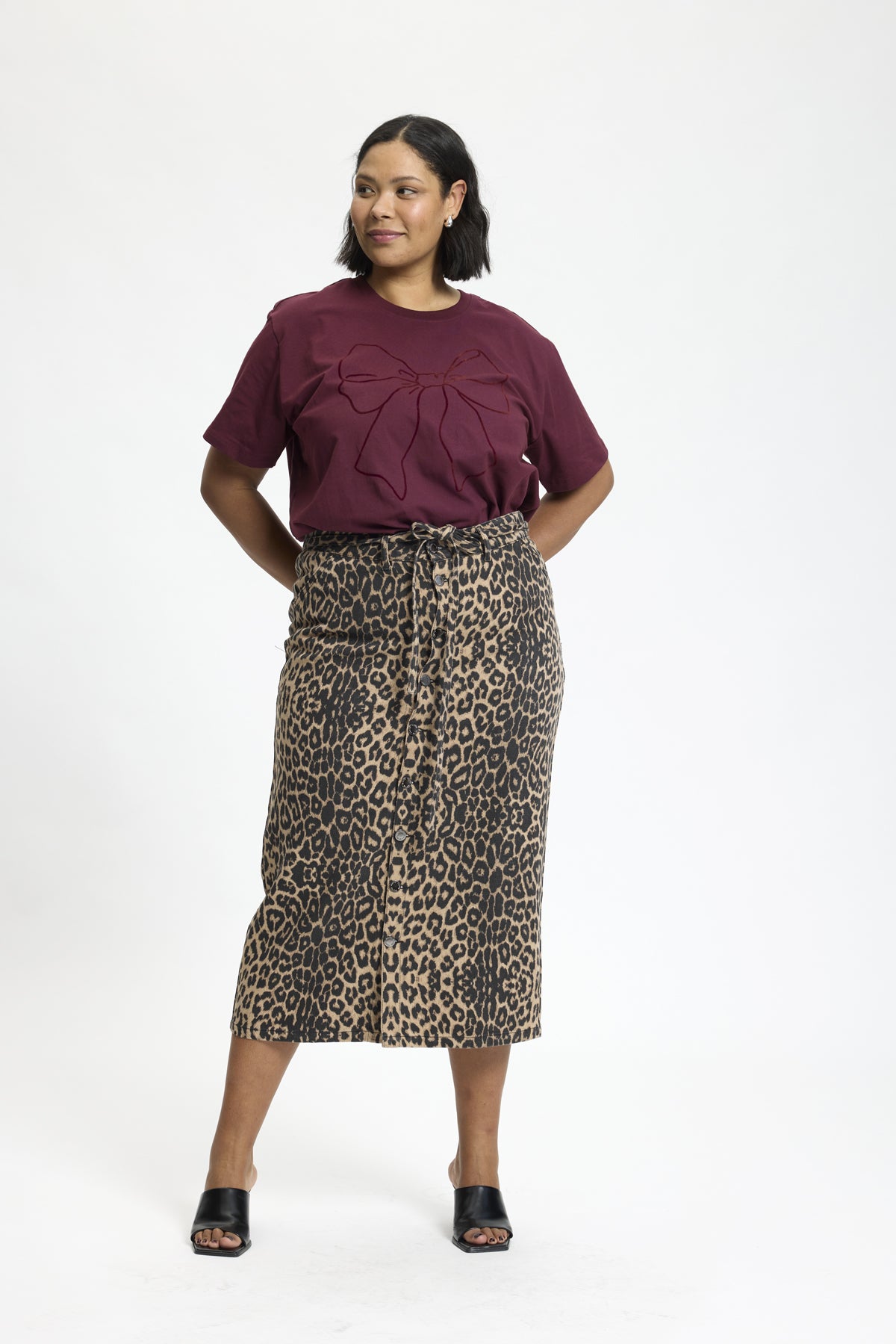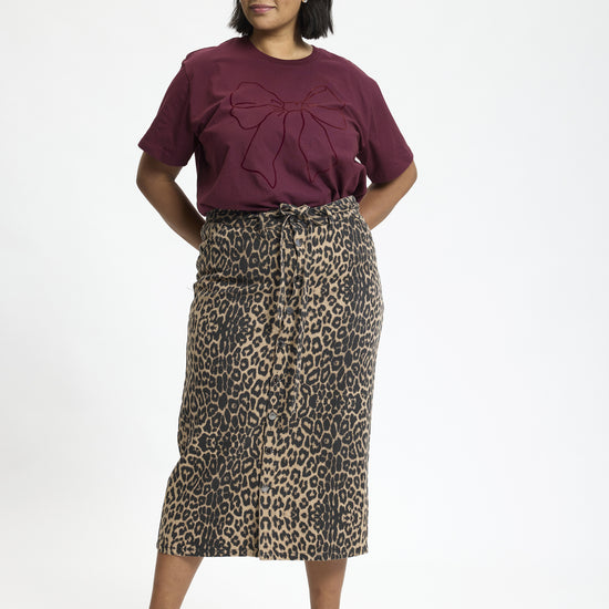 Gi garderoben din et feminint løft med denne T-skjorten fra Anyday. Den har et eksklusivt velourtrykk med sløyfe på fronten, og den dype bordeauxfargen gir et sofistikert preg til ethvert antrekk. Med sitt myke bomullsmateriale og tilsatt stretch får du en behagelig og flatterende passform hele dagen.