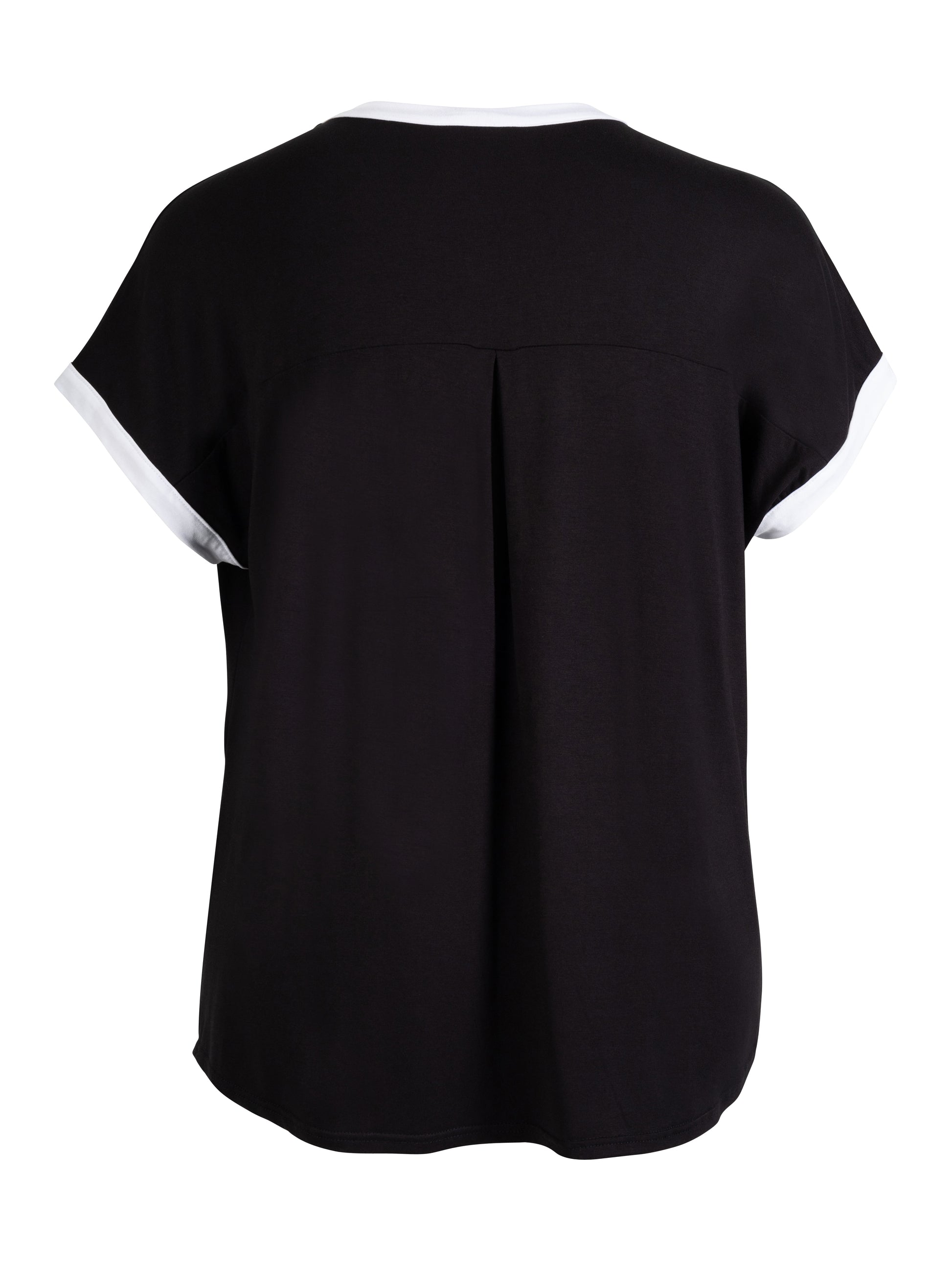 Med sin bløde viskoseblanding og strækbare kvalitet er denne T-shirt et oplagt valg til dig, der sætter pris på både komfort og stil. Det karakteristiske print tilfører personlighed til dit outfit, uanset om du bruger T-shirten alene eller under en cardigan. Se flere flotte overdele fra Zoey eller opdag andre trendy plus size T-shirts til garderoben.