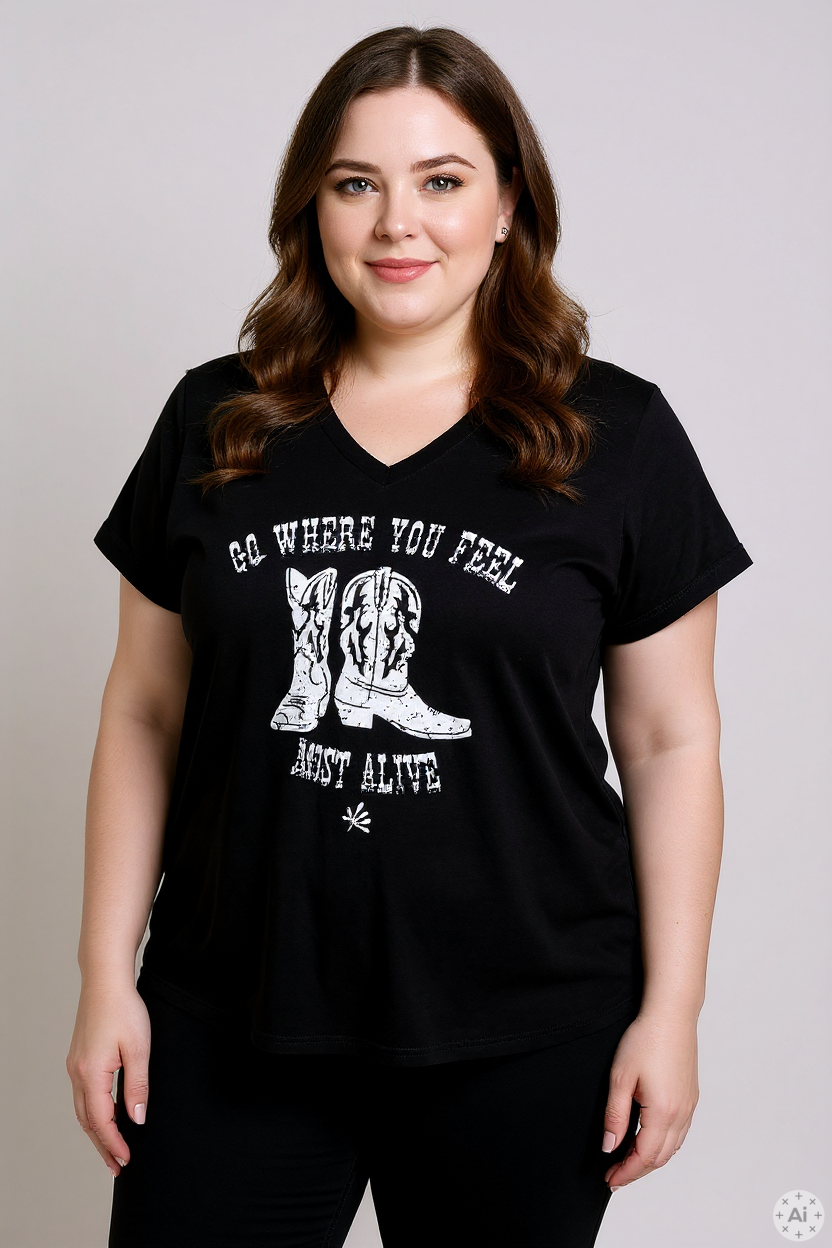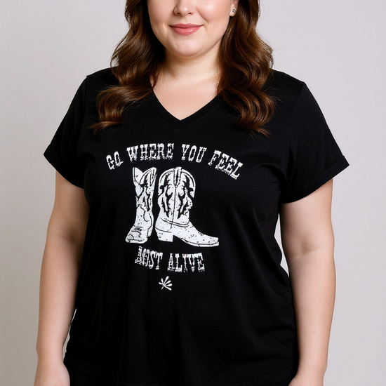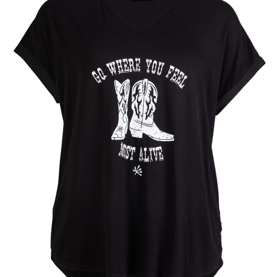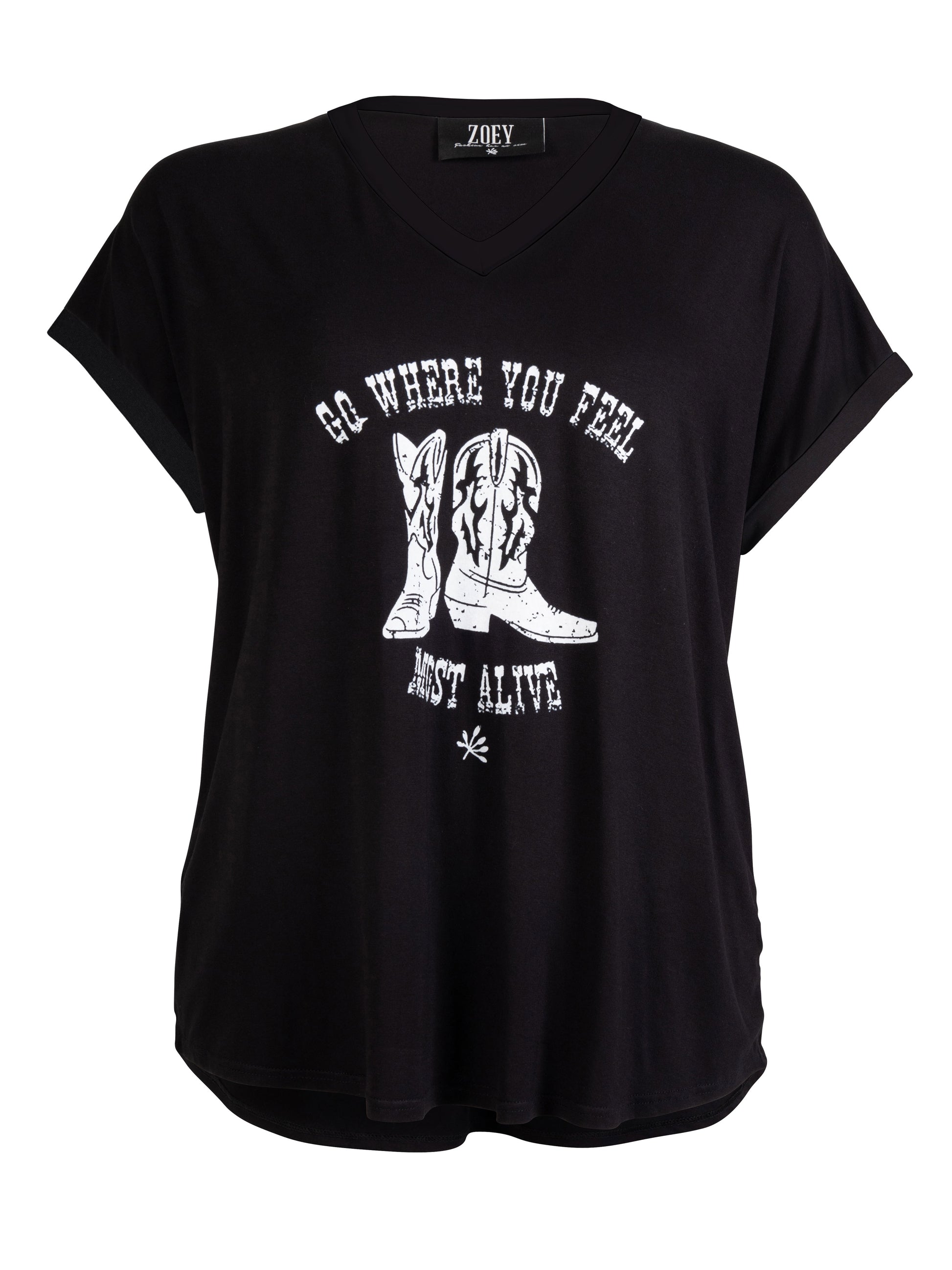 Giv dit hverdagslook et personligt twist med denne sorte T-shirt fra ZOEY. Modellen har et iøjnefaldende hvidt print foran med teksten "GO WHERE YOU FEEL MOST ALIVE" og et par cowboystøvler, som giver et råt og inspirerende udtryk. T-shirten har V-udskæring, opsmøg på ærmerne og en blød, strækbar kvalitet, der sikrer god komfort hele dagen.
