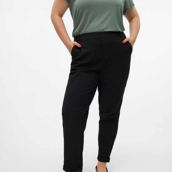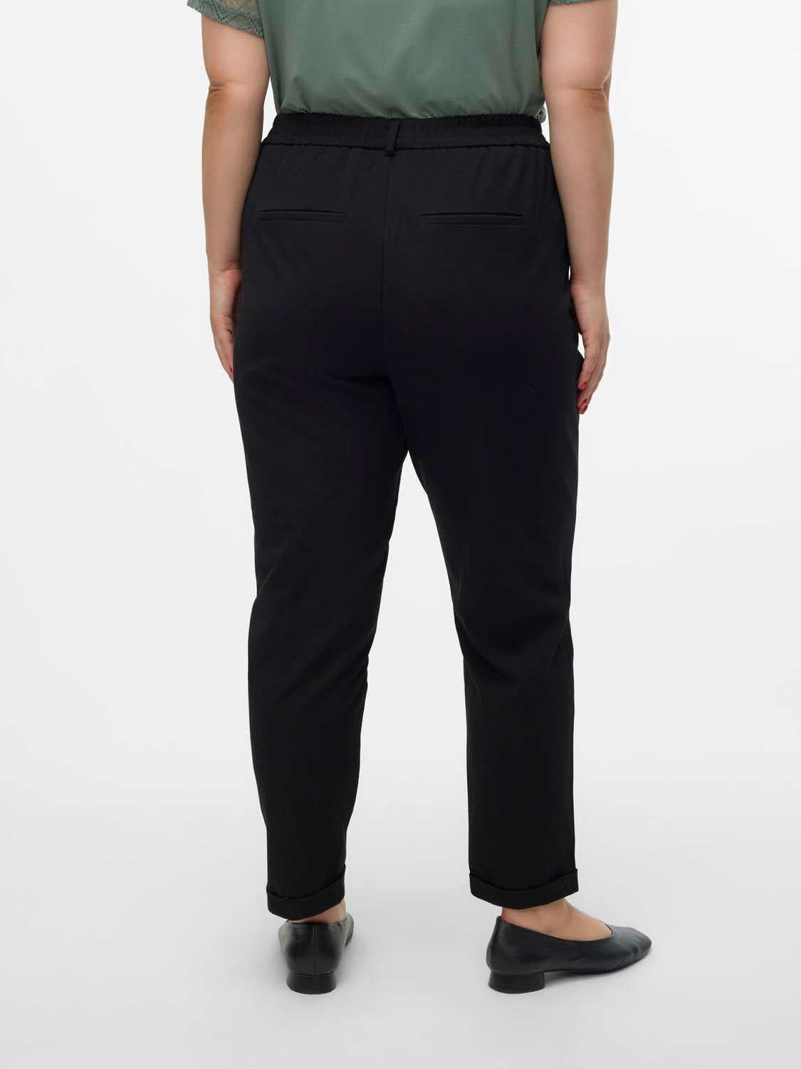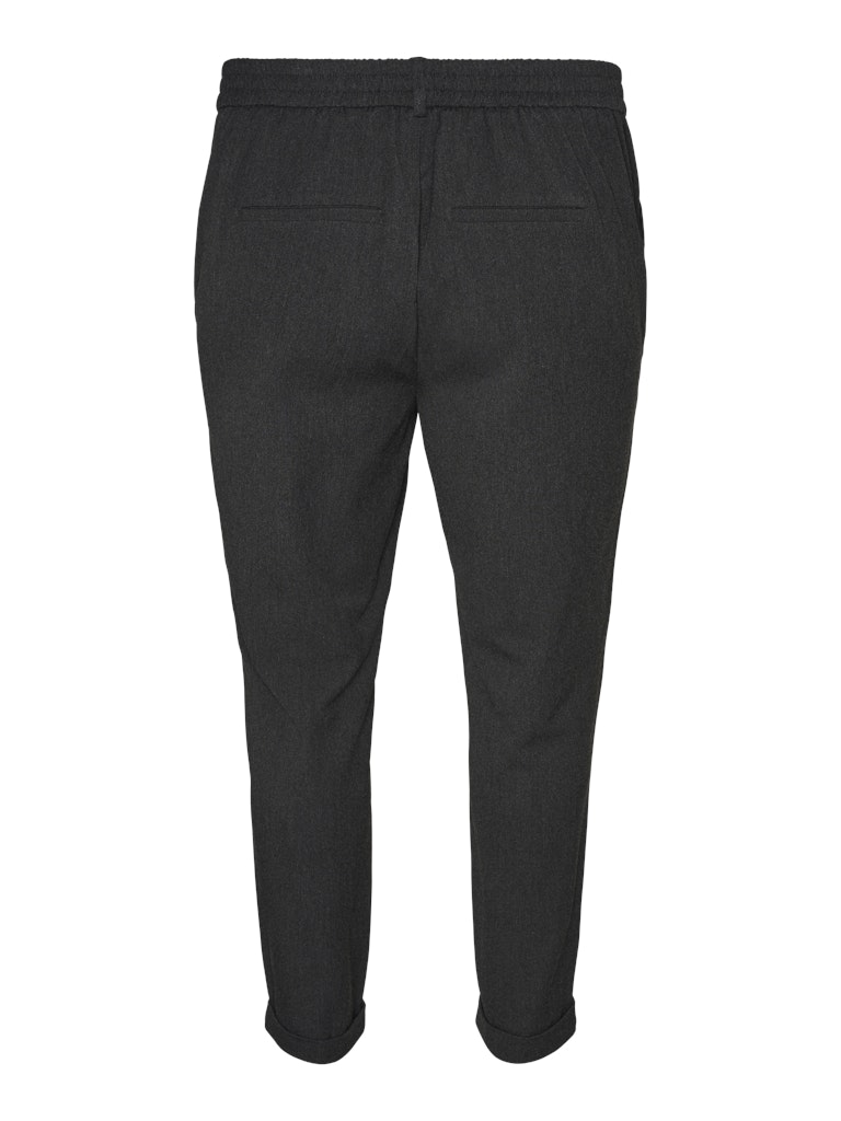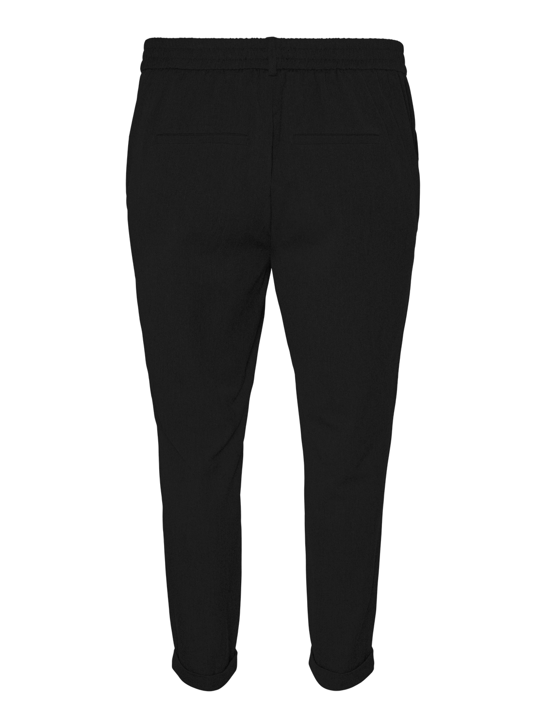 Myke bukser med elastisk midje og rette ben, sidelommer og falske lommer bak, opprullede detaljer ved bena,