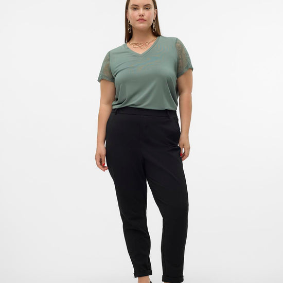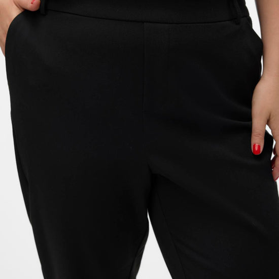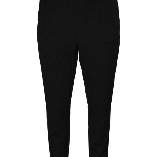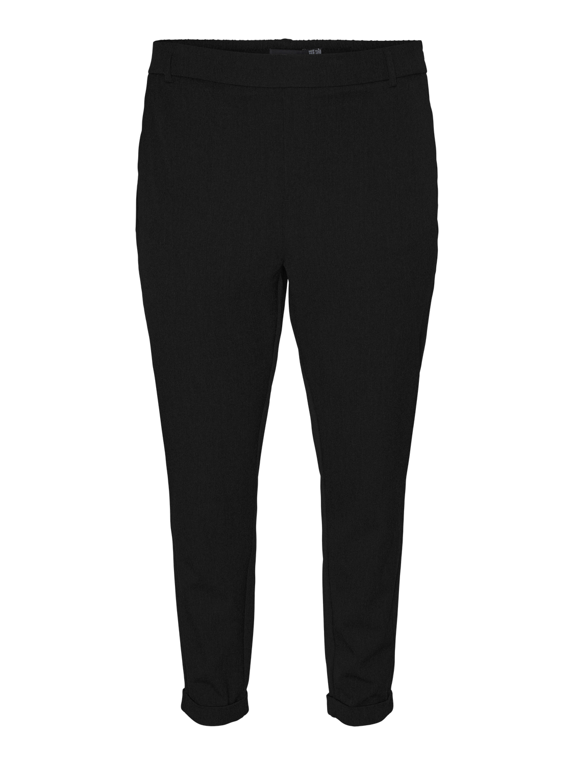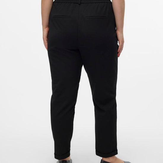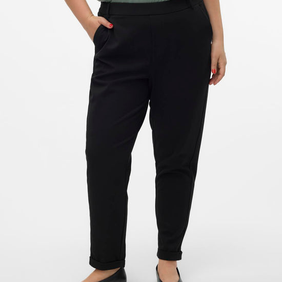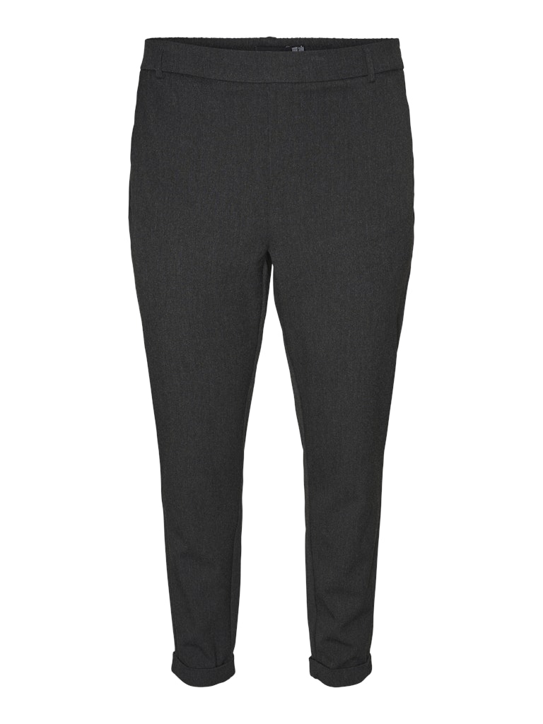 Myke bukser med elastisk midje og rette ben, sidelommer og falske lommer bak, opprullede detaljer ved bena,