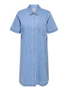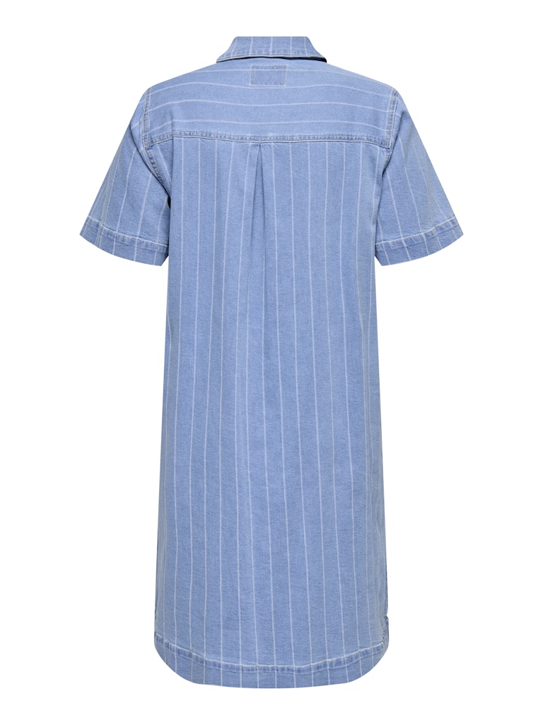 Denimkjolen er utformet med en skjortekrage og korte ermer for et klassisk og tidløst utseende. Knapplukkingen foran gir en justerbar stil, mens brystlommen tilfører et funksjonelt og dekorativt element. Laget av en bomullsblanding med litt elastan, gir kjolen både komfort og bevegelsesfrihet.