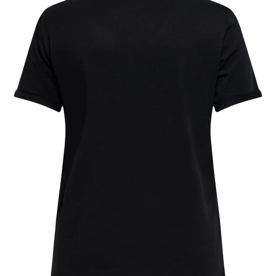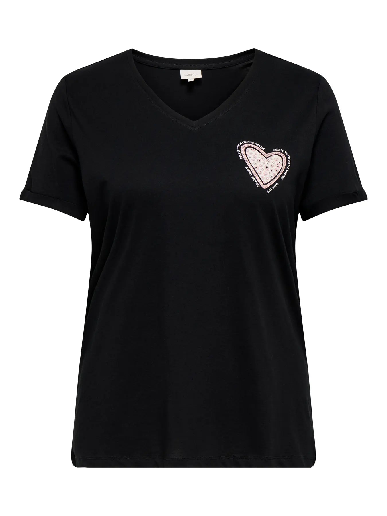 Denne sorte t-skjorten fra ONLY CARMAKOMA tilfører et herlig element til garderoben din med sitt iøynefallende trykk på brystet. Teksten "LOVE" står gjentatt i flotte, rosa nyanser som gir en fin kontrast til den mørke bakgrunnen. Modellen har en klassisk v-hals som fremhever det feminine på en elegant måte.
