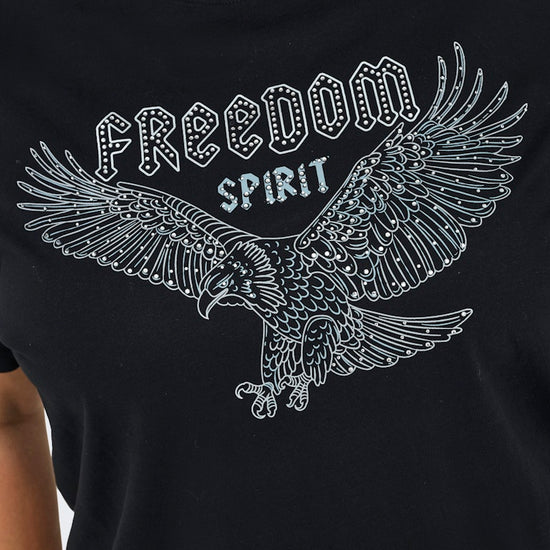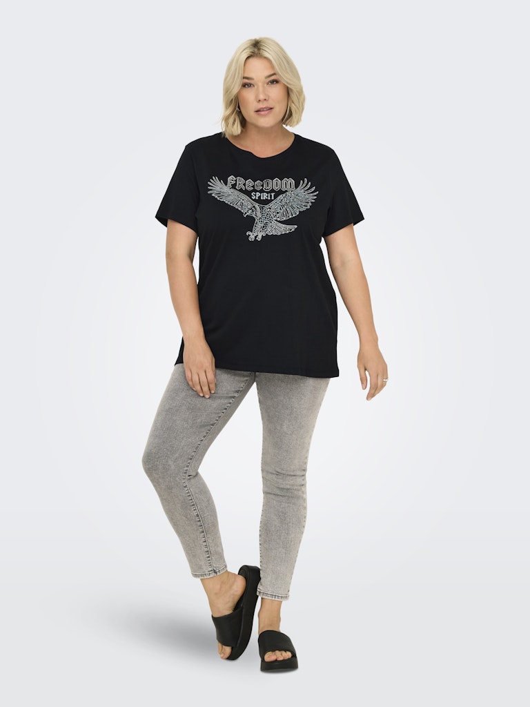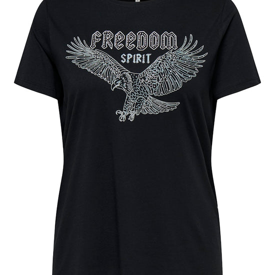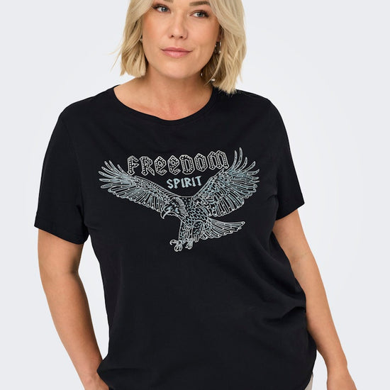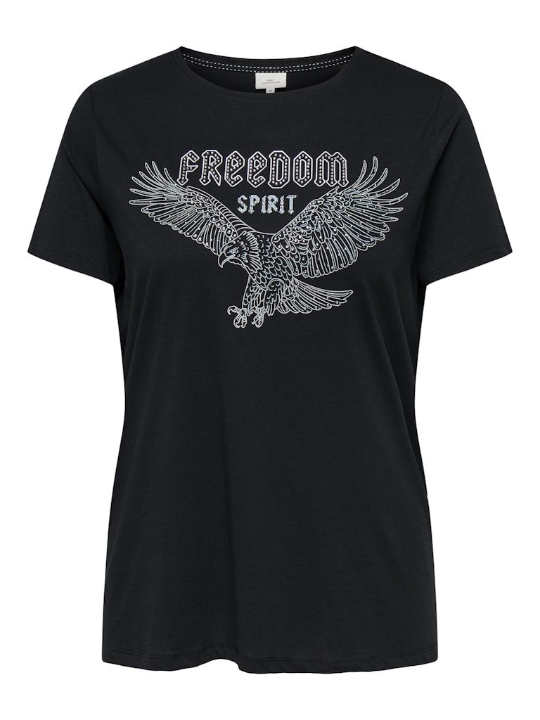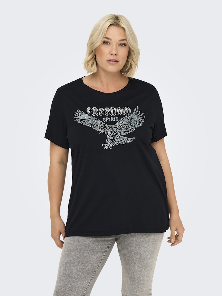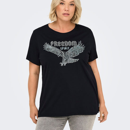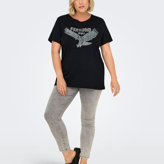 Opgrader din garderobe med denne stilfulde T-shirt fra ONLY CARMAKOMA, designet specielt til kurvede kvinder i størrelserne 42-54. Denne T-shirt er den perfekte kombination af komfort og stil, med et regular fit, der fremhæver din feminine silhuet. Den klassiske sorte farve med et iøjnefaldende "Black Eagle" print gør den let at matche med dine yndlingsoutfits, uanset om du skal på arbejde, i skole eller ud til hverdagens aktiviteter.