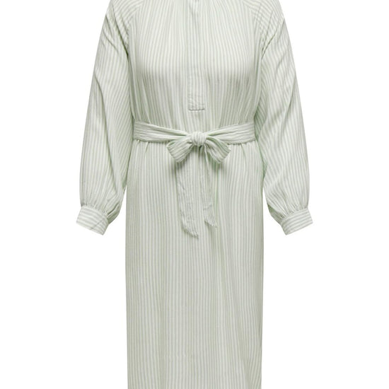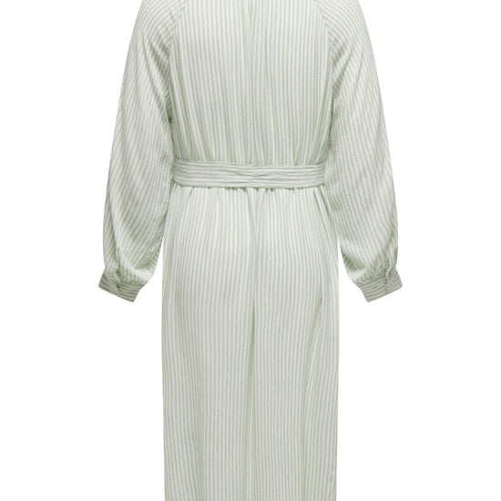 Denne tidløse skjortekjolen er det perfekte valget for både hverdag og fest. Laget av 100 % viskose, føles stoffet lett og luftig mot huden, samtidig som det har en vakker drapering og en luksuriøs finish. De fine vertikale stripene gir et klassisk preg, mens det avtakbare knytebeltet i midjen gir en feminin silhuett.