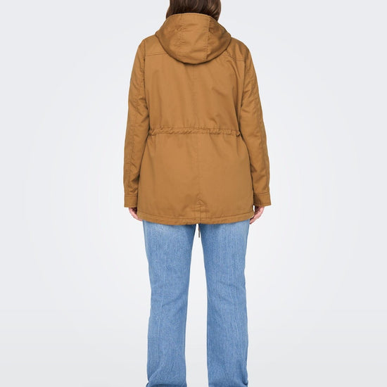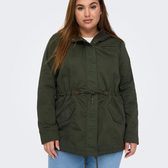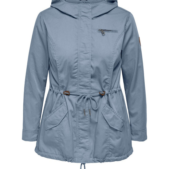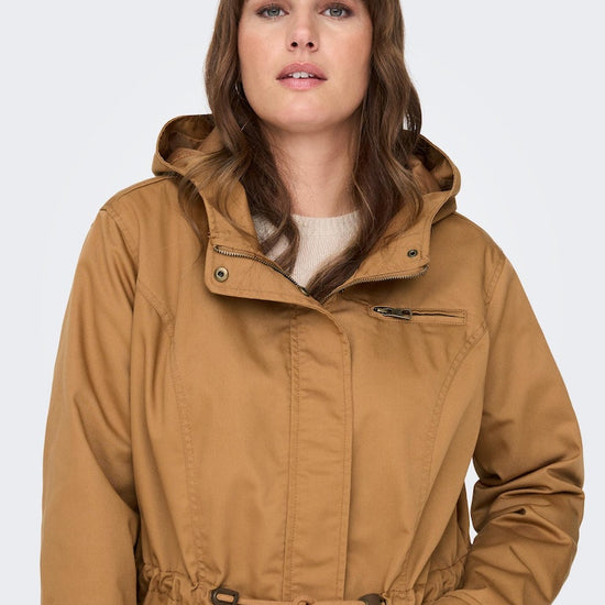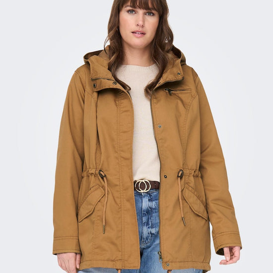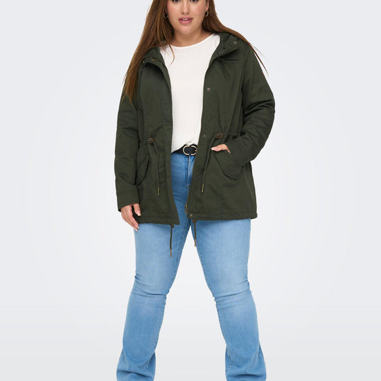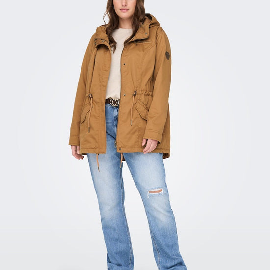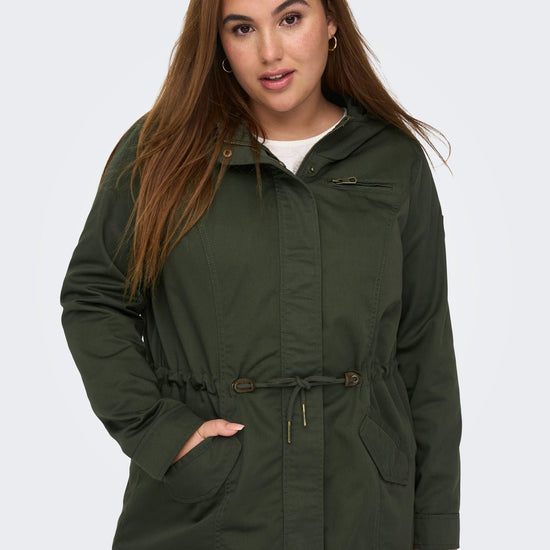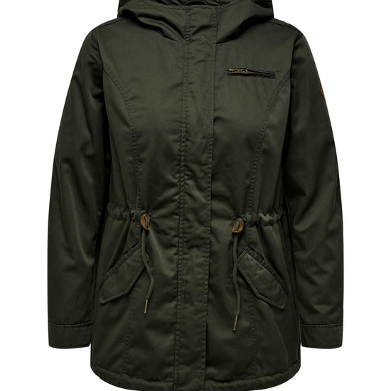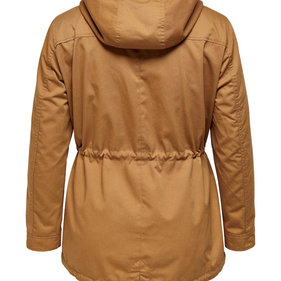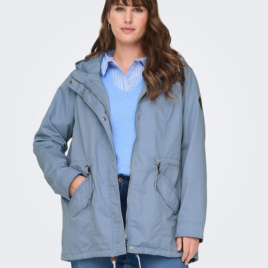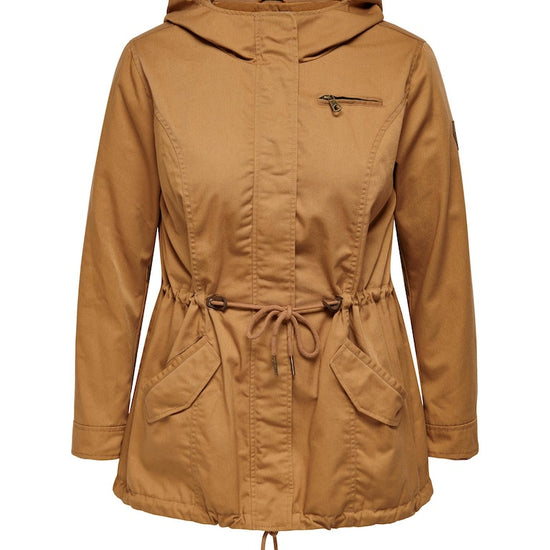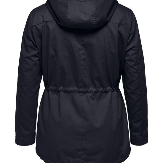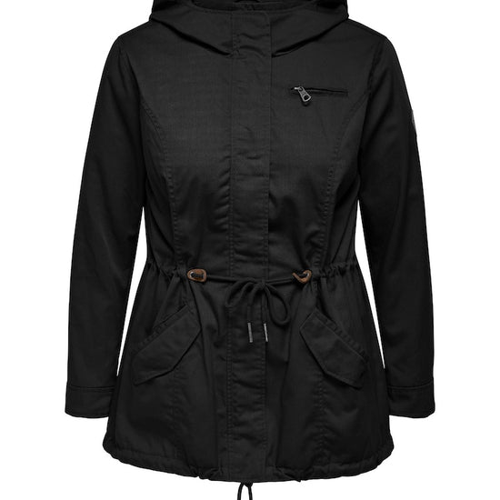 Parkajakke fra ONLY CARMAKOMA med hætte og skjult lynlåslukning foran. Jakken har brystlomme, justerbar snøring ved taljen. Den har en længde på 82 cm. i størrelse M og er lavet af et 80% polyester, 20% bomuld