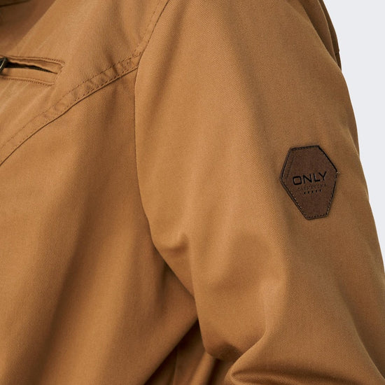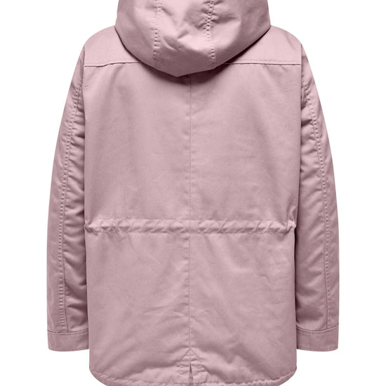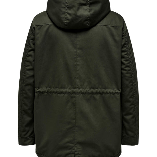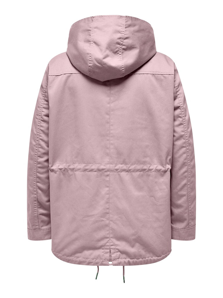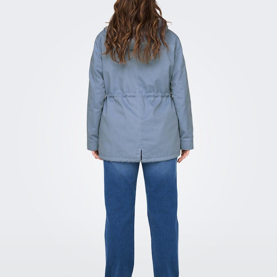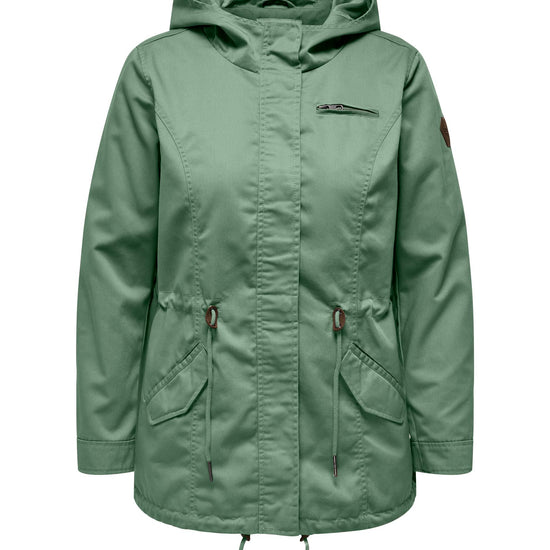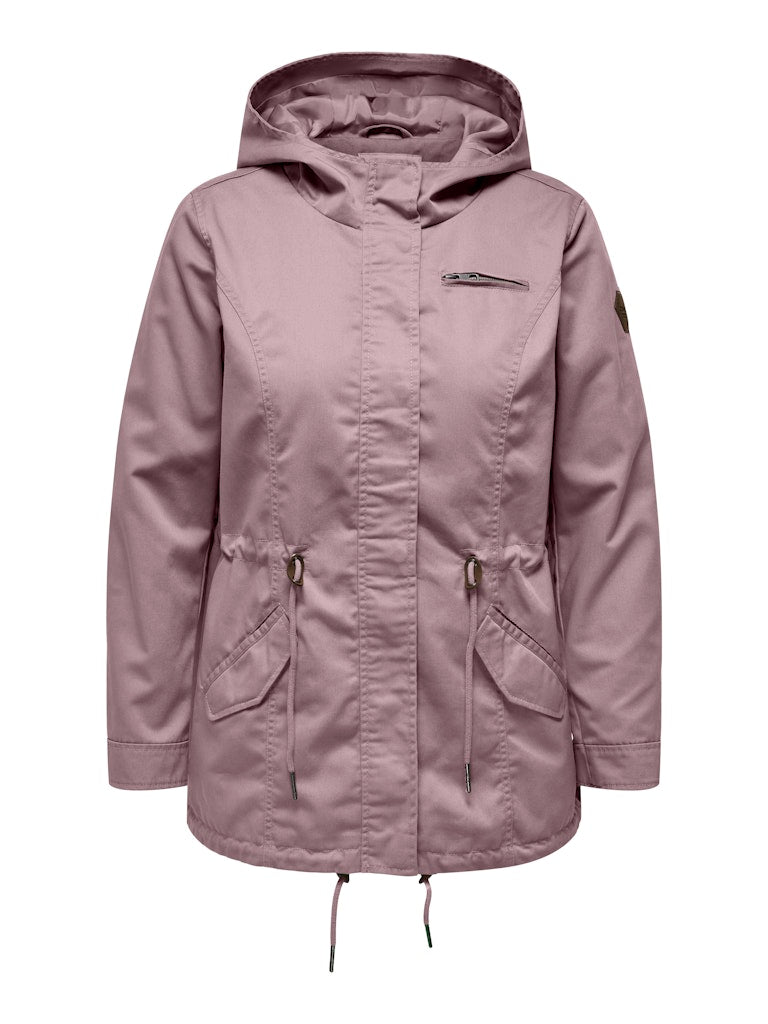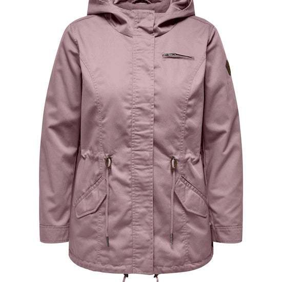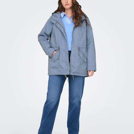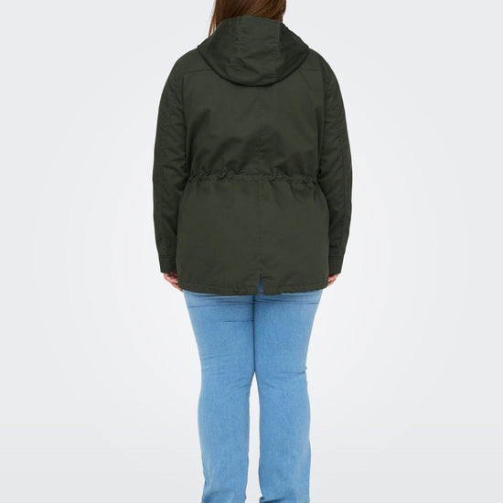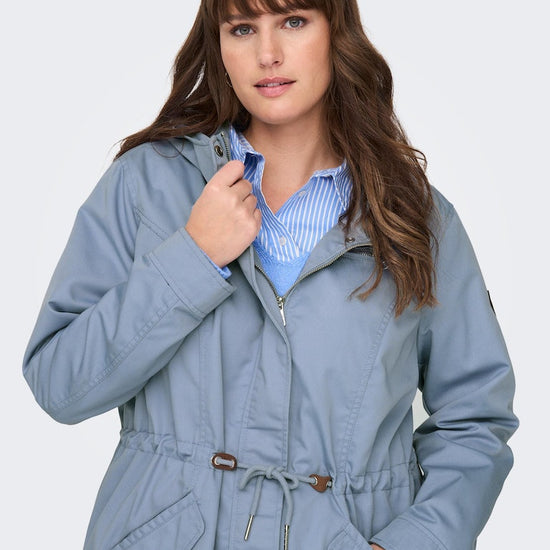 Parkajakke fra ONLY CARMAKOMA med hætte og skjult lynlåslukning foran. Jakken har brystlomme, justerbar snøring ved taljen. Den har en længde på 82 cm. i størrelse M og er lavet af et 80% polyester, 20% bomuld