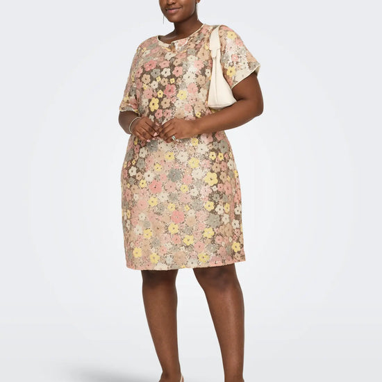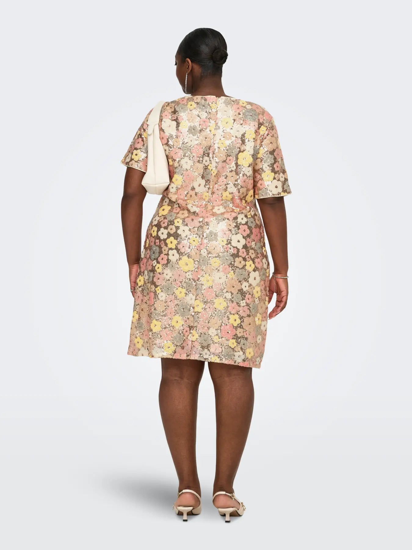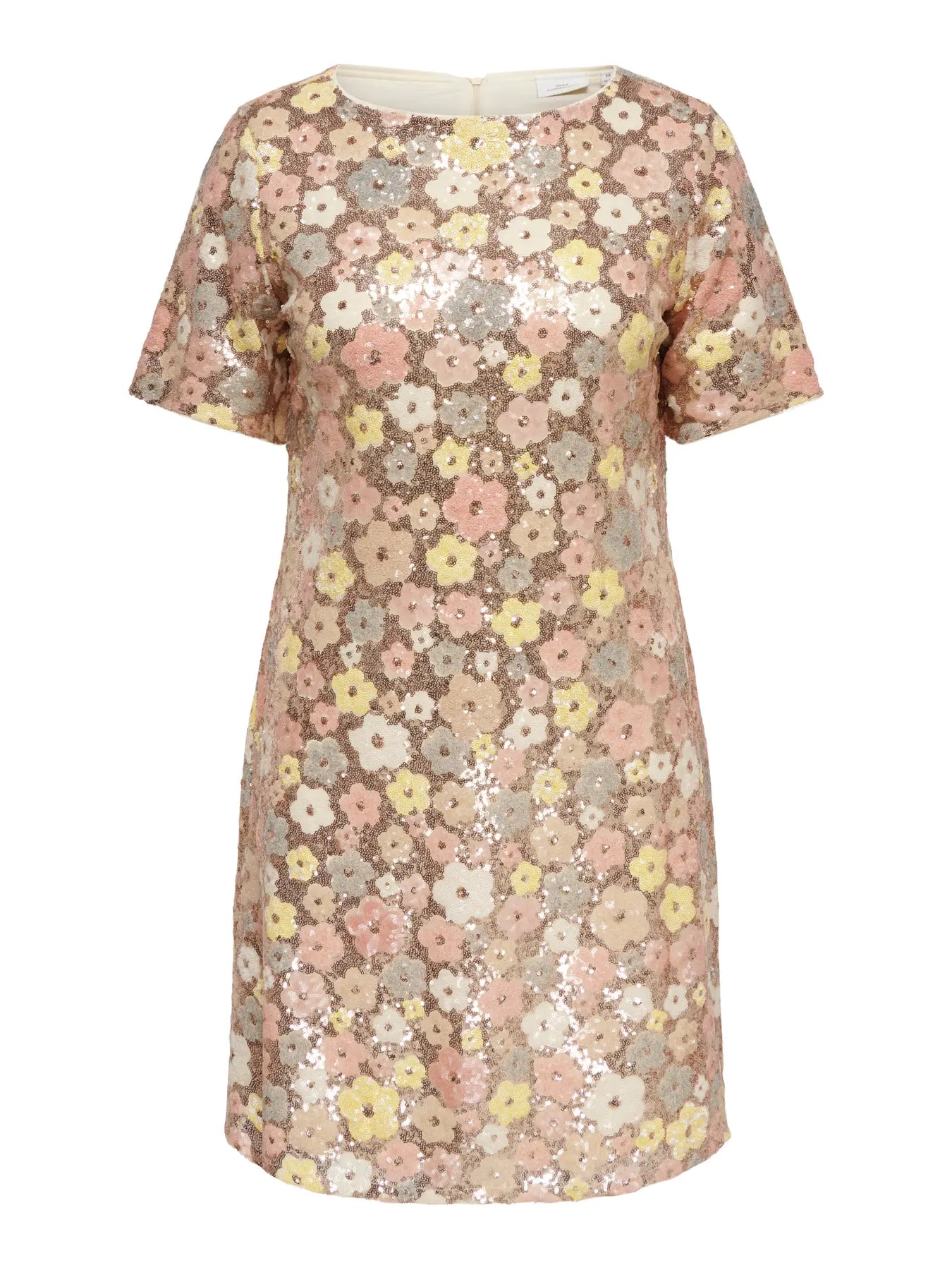 Den midi-kjole med bådudskæring og korte ærmer er designet i et let og glat polyesterstof, som giver kjolen en behagelig pasform. Den har en regular fit, der fremhæver figuren uden at stramme, og er fuldt foret for optimal komfort. Kjolen er udsmykket med fine glimmerdetaljer, der tilfører et diskret, festligt udtryk. Farven er en lys solskinstonet gul, som passer perfekt til forårets varme og lyse dage.