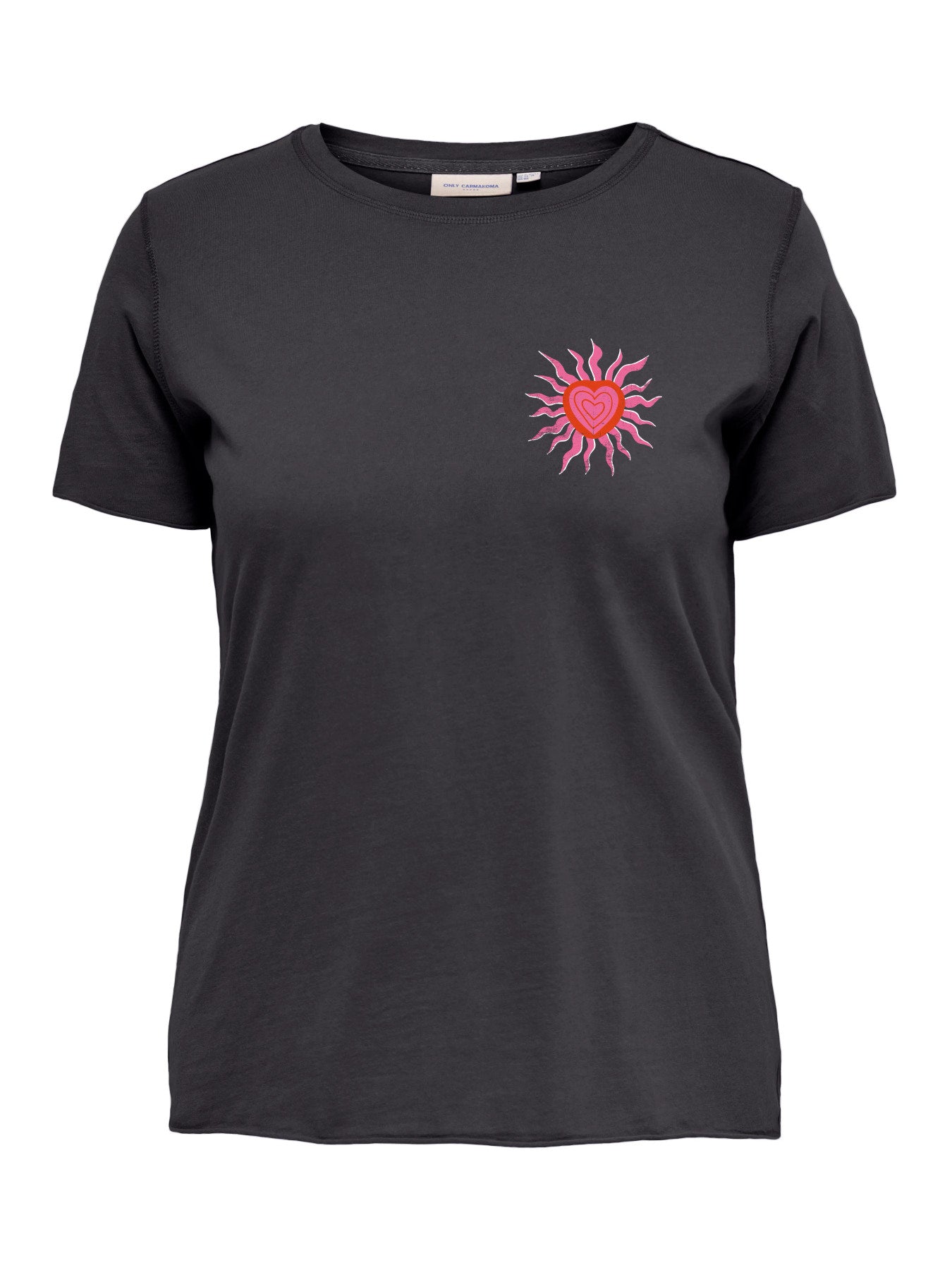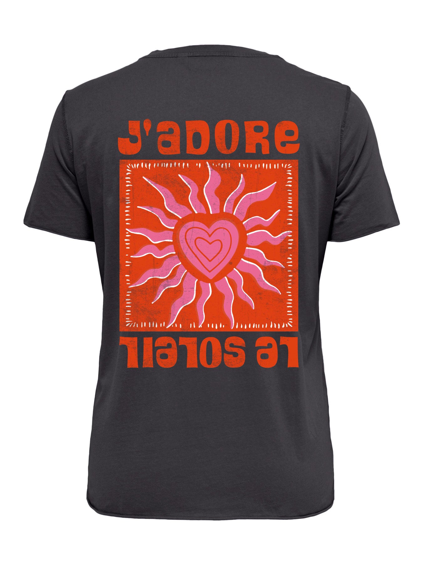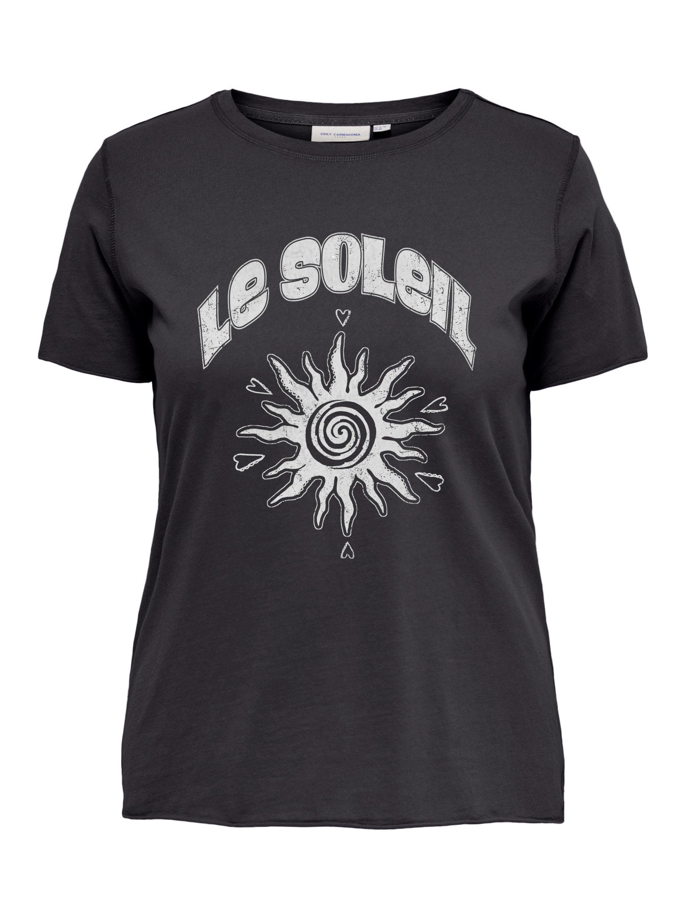 Denne t-skjorten fra Only Carmakoma skiller seg ut med sitt flotte grafiske trykk på fronten, som byr på teksten "J'adore le soleil" og et dekorativt hjerte. Den er fremstilt i en myk kvalitet av 100% bomull, noe som sikrer en behagelig følelse og god pusteevne når du har den på. Passformen er en klassisk regular fit med rund halsutskjæring, noe som gjør den anvendelig til mange anledninger.