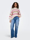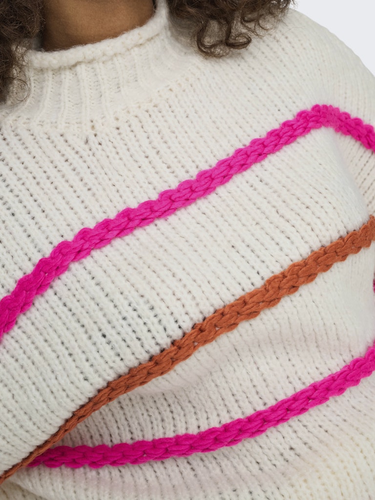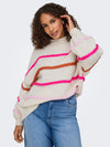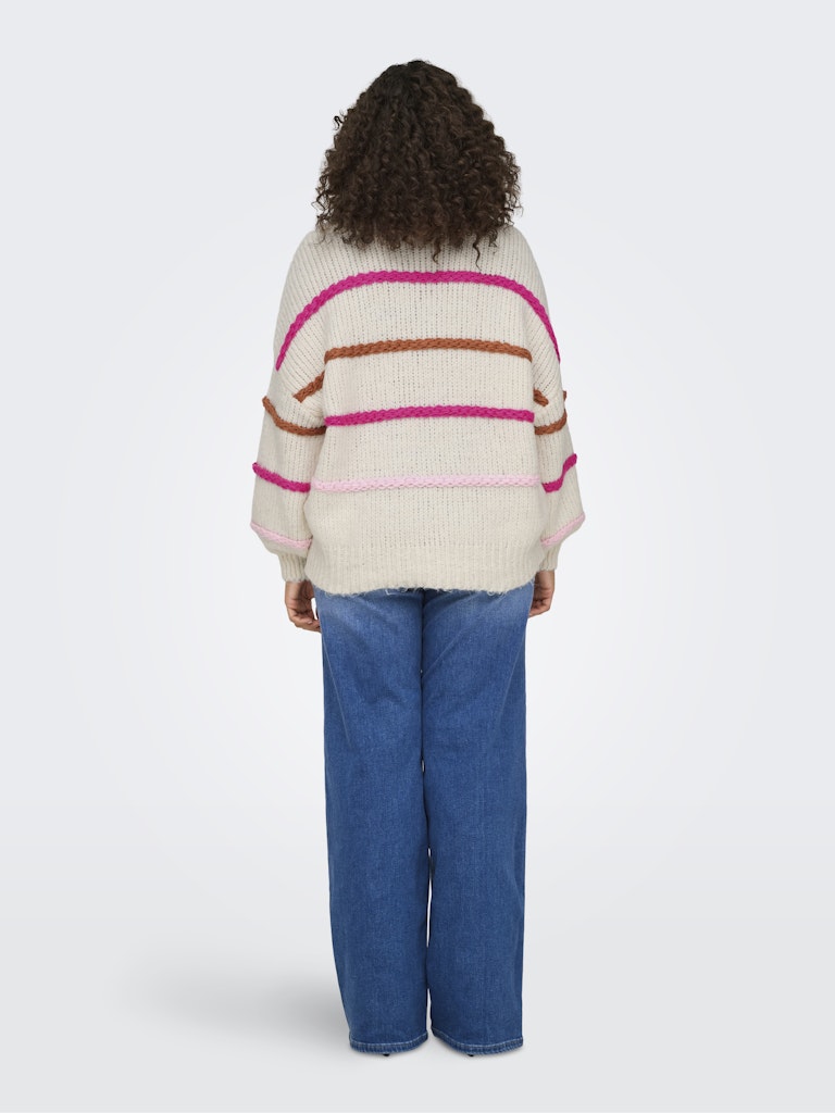 Pulloverens flate ribbestrikk sikrer et stilig utseende, mens det komfortable materialet gjør den ideell for kjølige dager. Den moderne fargekombinasjonen med striper i rosa og rødbrune nyanser gir et friskt pust til garderoben din. Kombiner denne genseren med jeans i plussstørrelse eller plussstørrelse bukser for en komplett og stilig look.