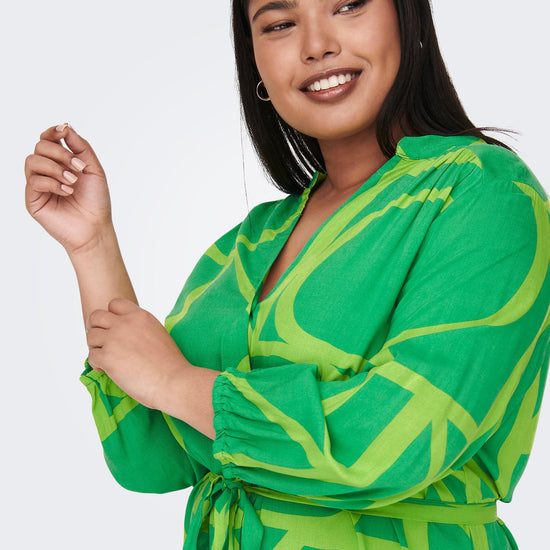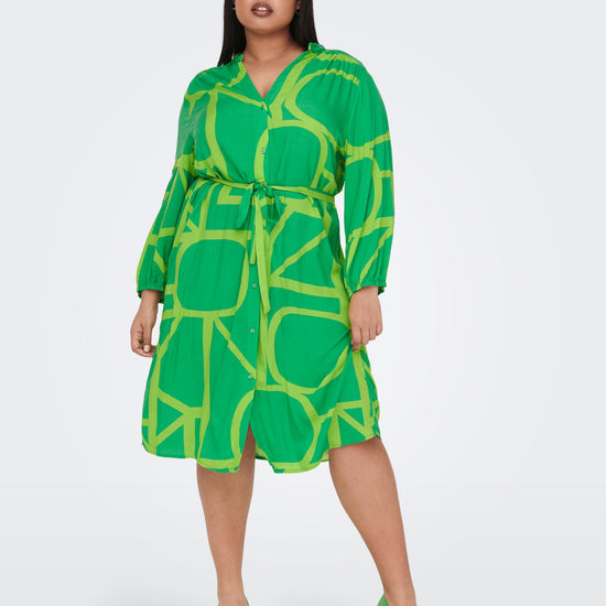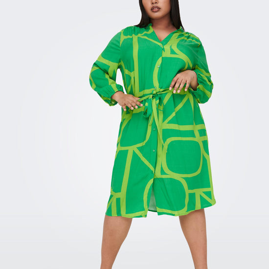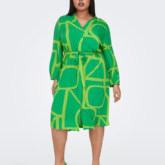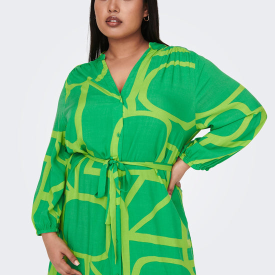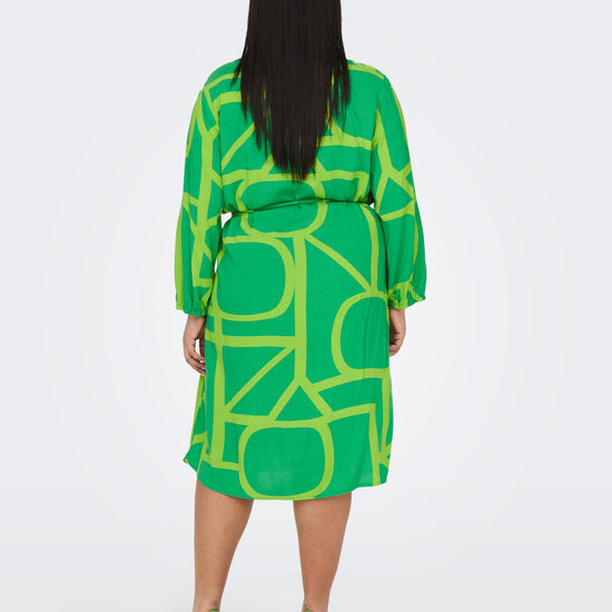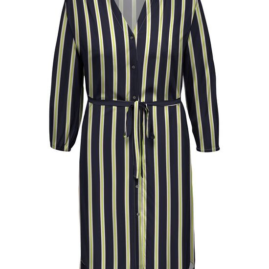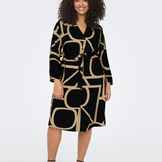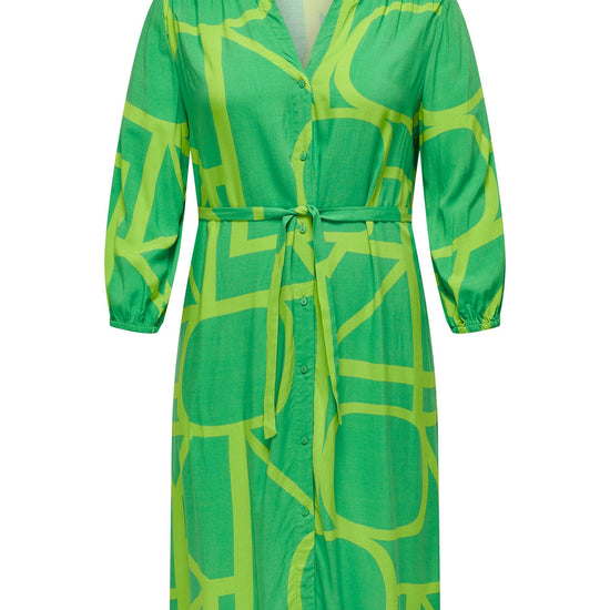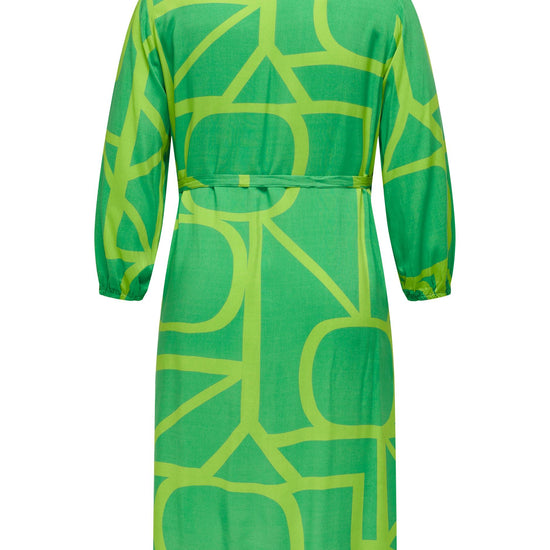 Grafisk trykt kjole med knapper og 3/4-ermer. Avtakbart belte