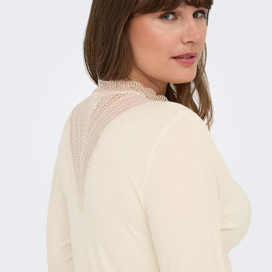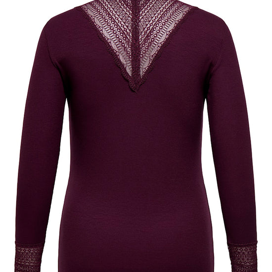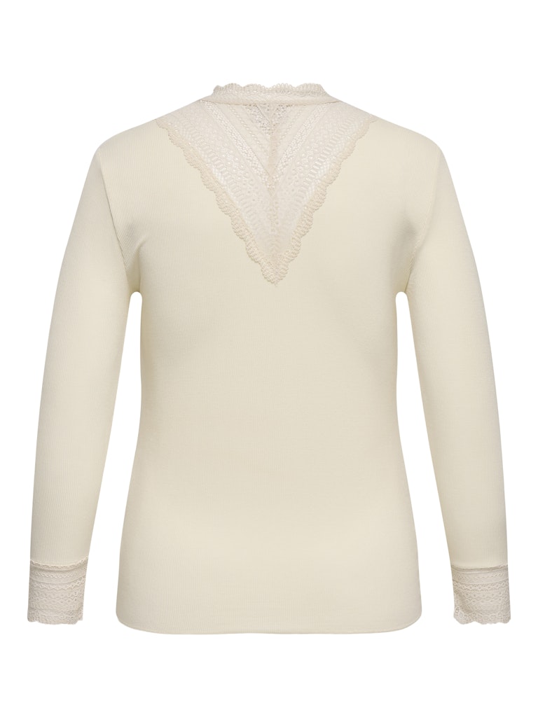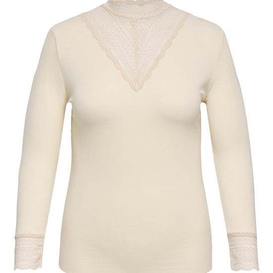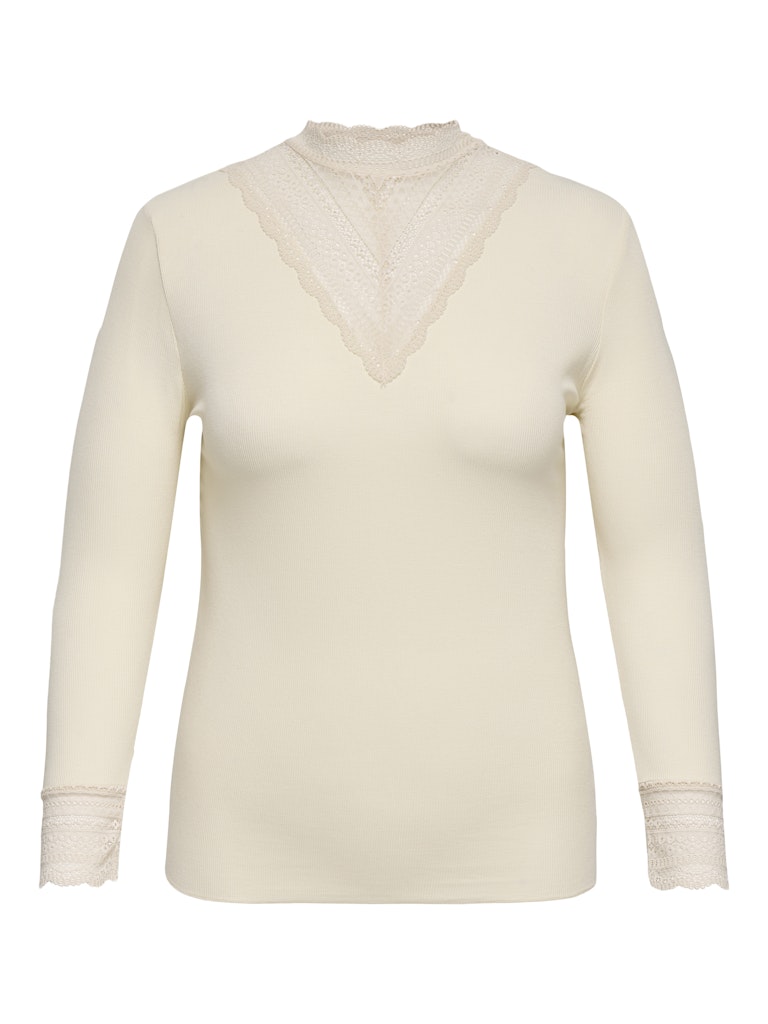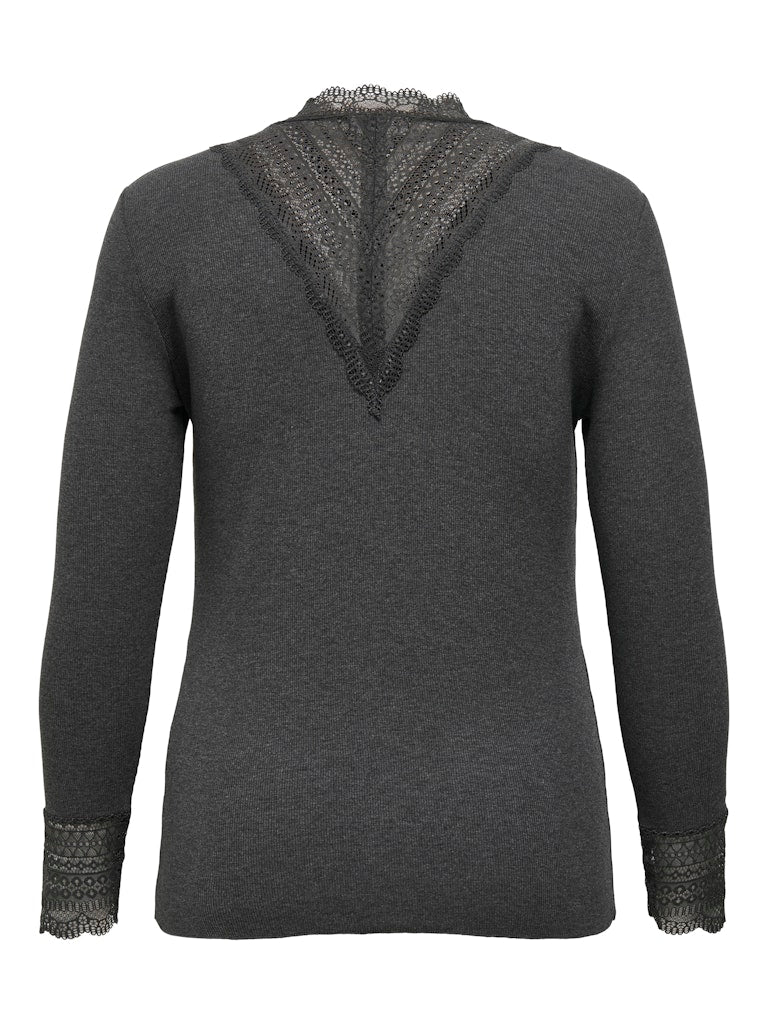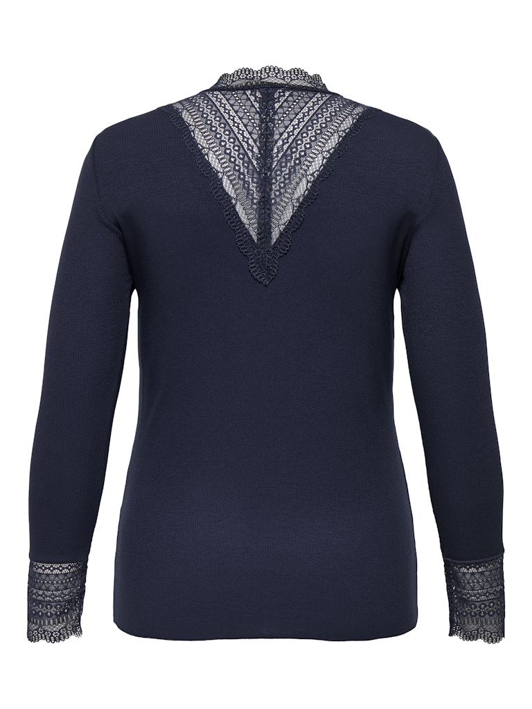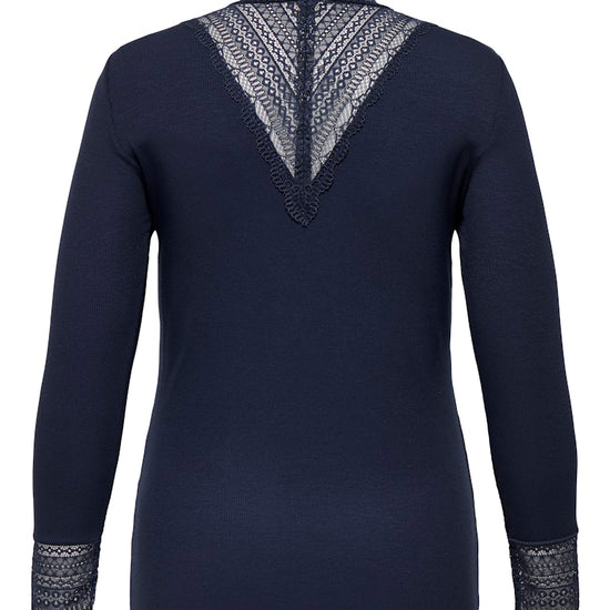 - Høy blondehals med V-hals design, som tilfører et feminint preg.