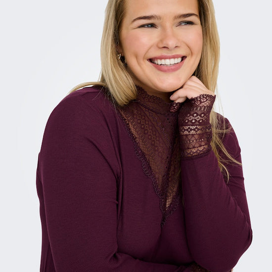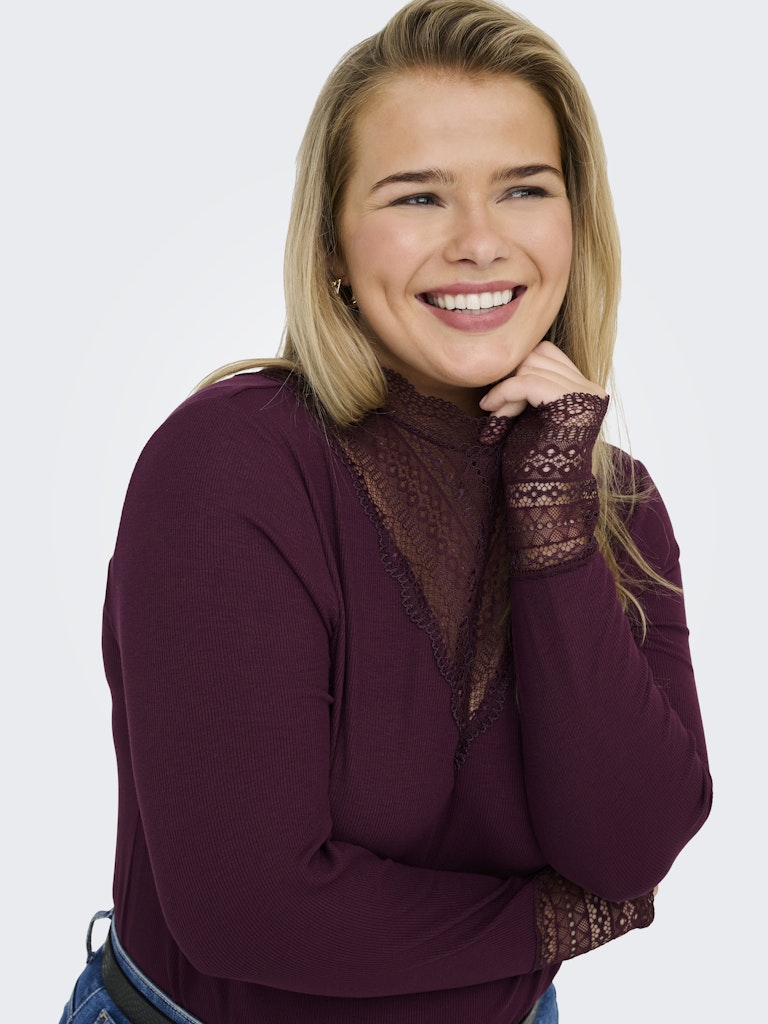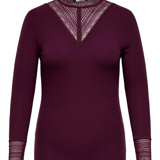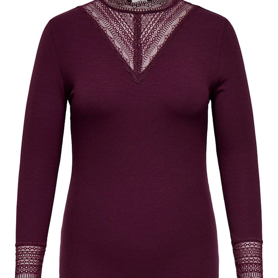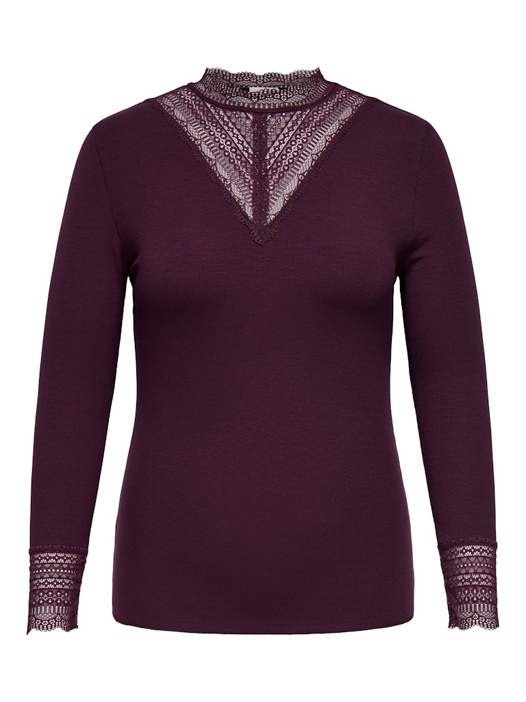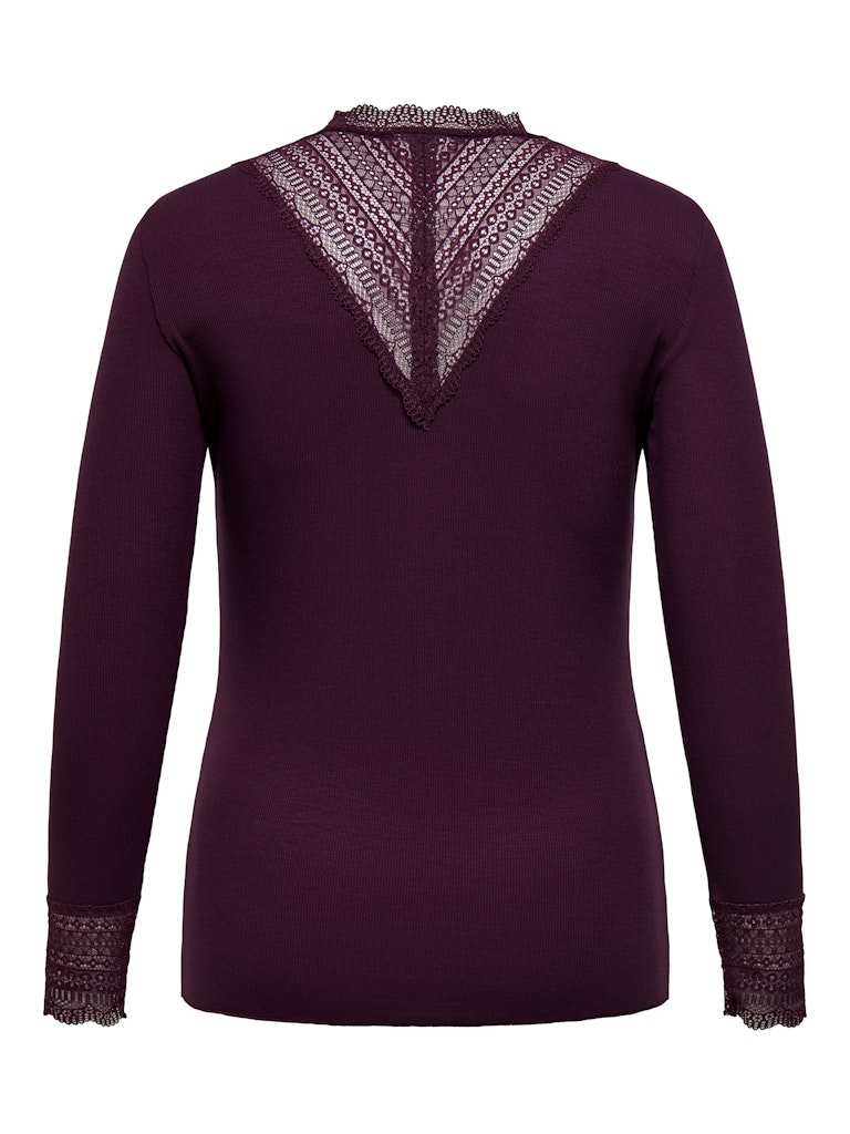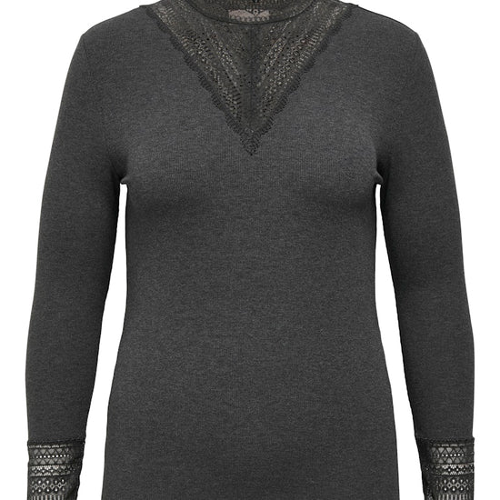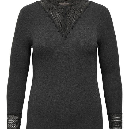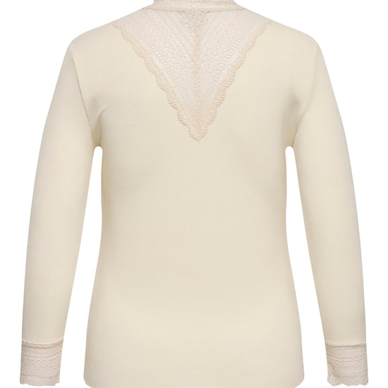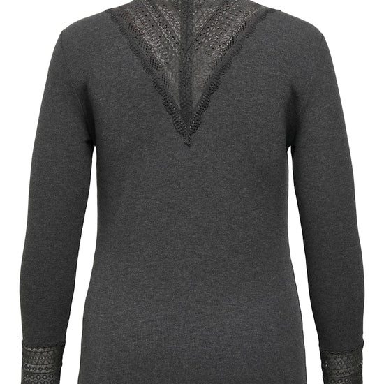 - Høy blondehals med V-hals design, som tilfører et feminint preg.