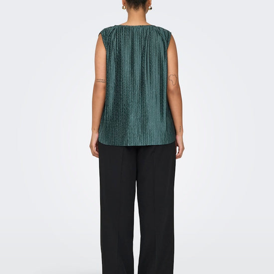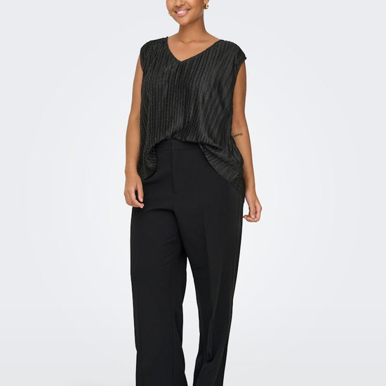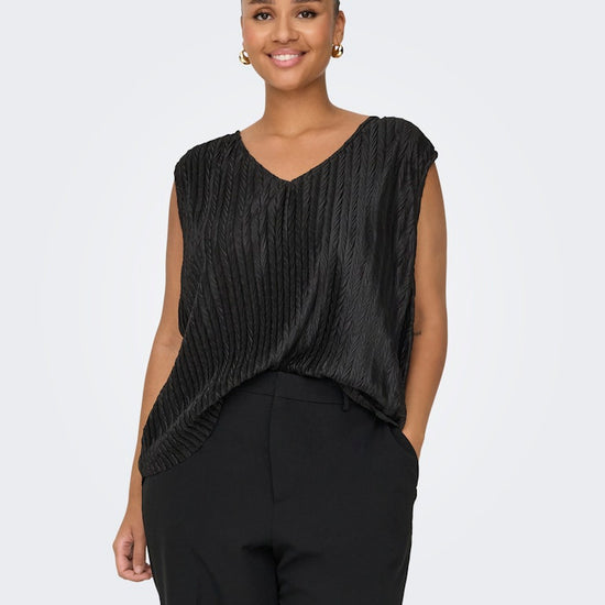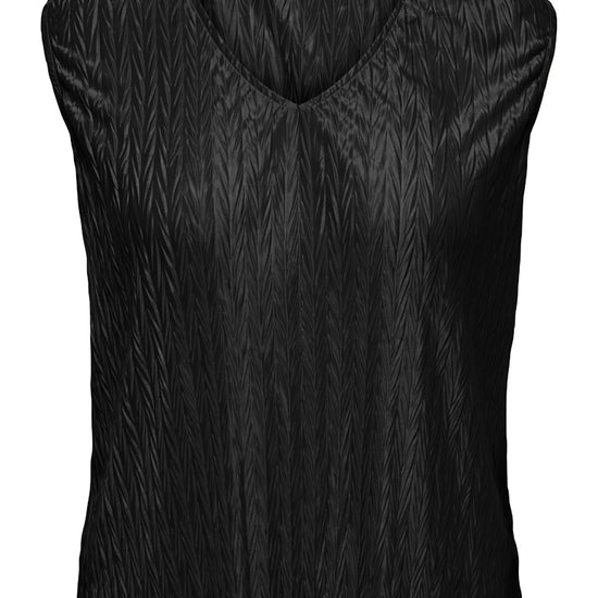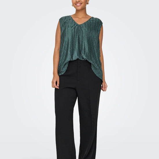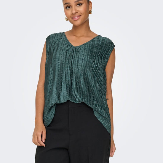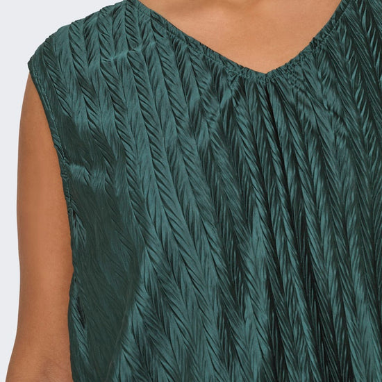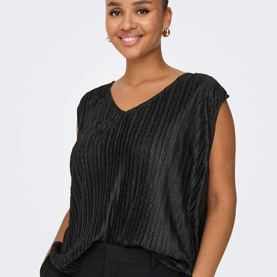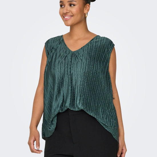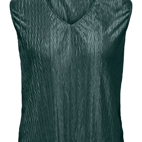 Toppen er tilgjengelig i de klassiske fargene svart og de sofistikerte Green Gables, slik at du kan velge den som passer best til din stil. Det lette plisserte stoffet med en lett skinnende finish skaper en grasiøs silhuett, mens den subtile V-utringningen gir en feminin touch.