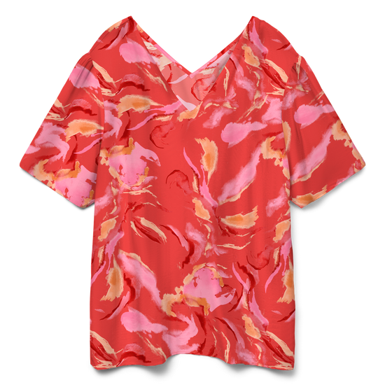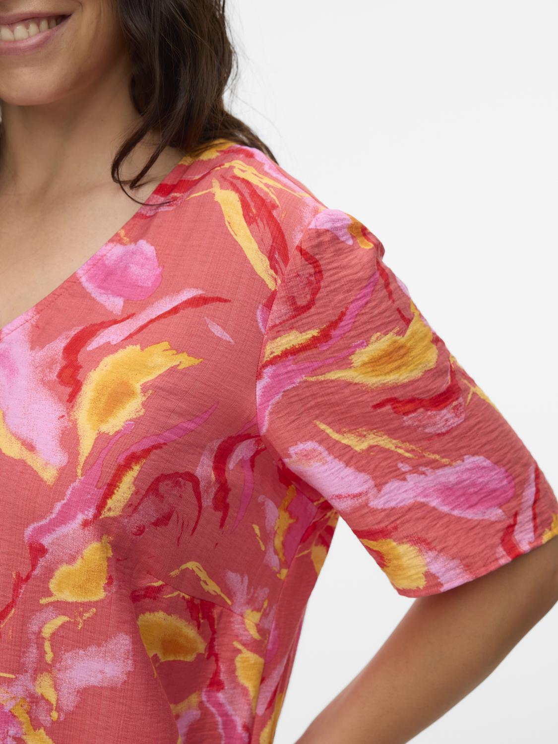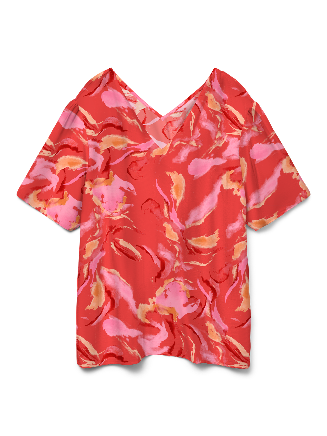 Denne top har en rund hals og 2/4 vide ærmer, der skaber et afslappet udtryk. Materialerne er bløde og bæredygtige, med en høj andel af LENZING™ ECOVERO™ viscose, der kombineres med nylon for ekstra komfort og holdbarhed. Toppen har en regular fit, der passer naturligt til kroppen uden at stramme, og den får din hverdagsstil til at føles både behagelig og smart. Den røde farve med all-over print giver et frisk og iøjefaldende look.