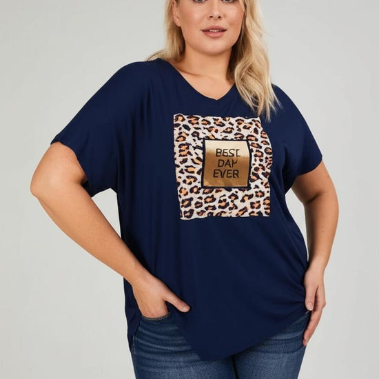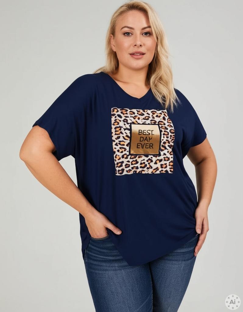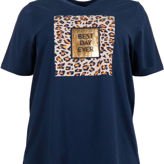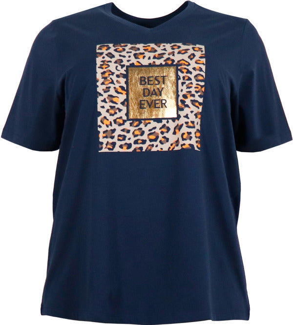 Den centrale firkantede printdetalje med leopardmønster og gylden tekst tilføjer et trendy twist til T-shirten. Denne detalje gør den til et iøjnefaldende valg for dem, der ønsker at udtrykke en positiv attitude gennem deres tøjvalg.