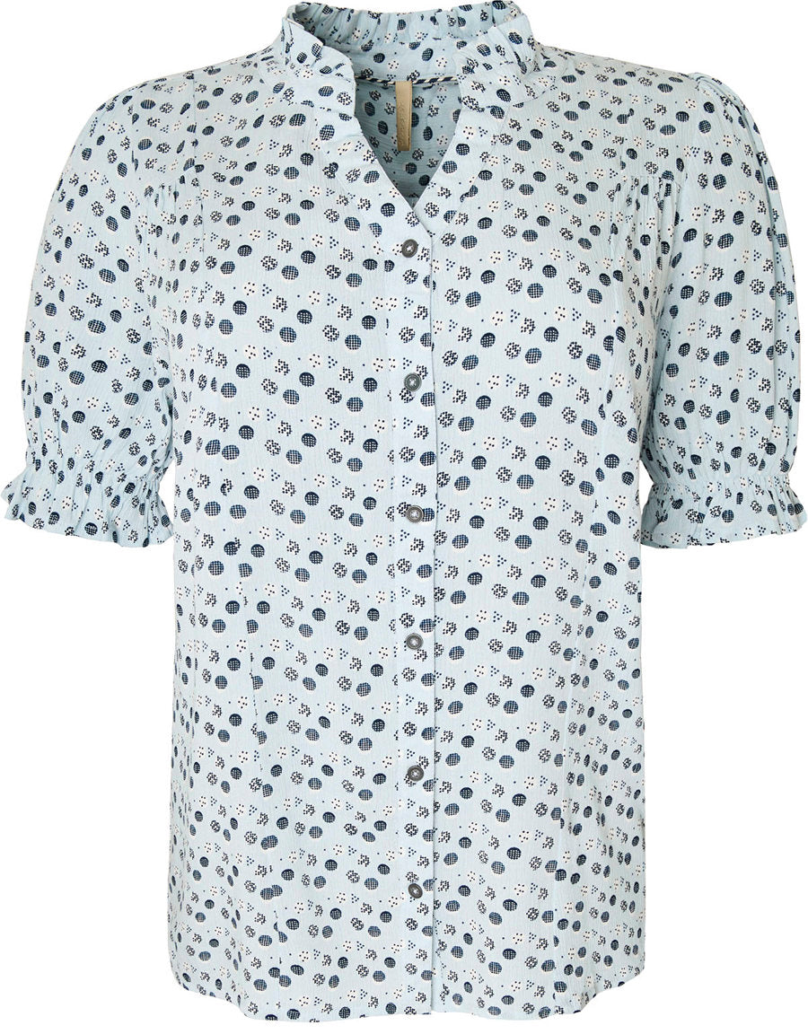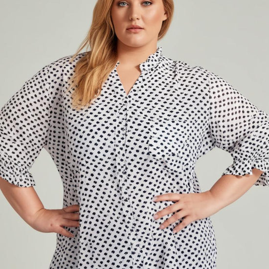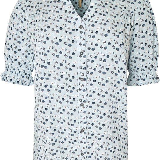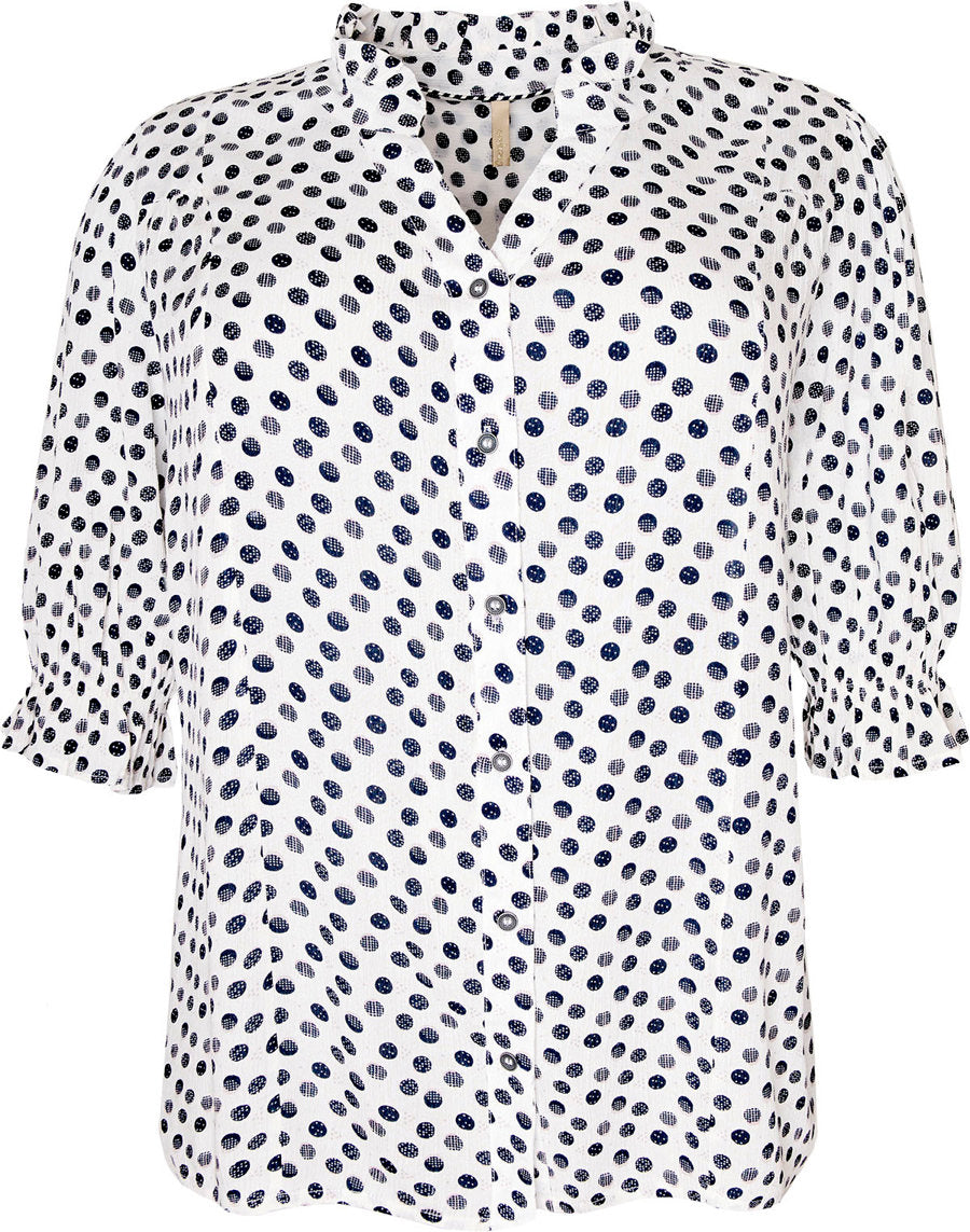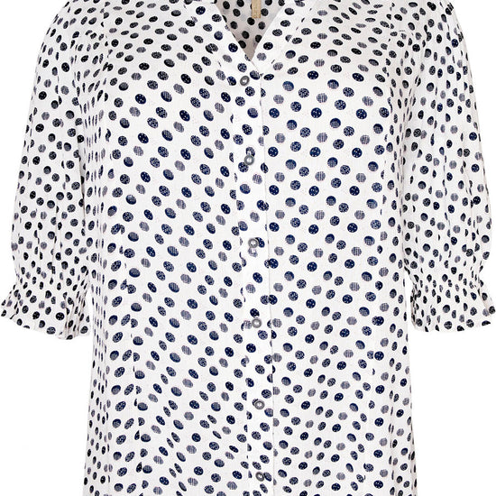 Opplev den elegante og moderne prikkete skjorten fra Cassiopeia, som kombinerer komfort og stil på beste vis. Denne skjorten er laget i en lett kvalitet av crepe viskose, som gjør den behagelig å ha på hele dagen. Med sitt gjennomknappede design kan du enkelt justere hvordan du vil bære den. Skjorten har en vakker flæsekrage og en flatterende V-hals som tilfører et feminint preg til antrekket ditt.