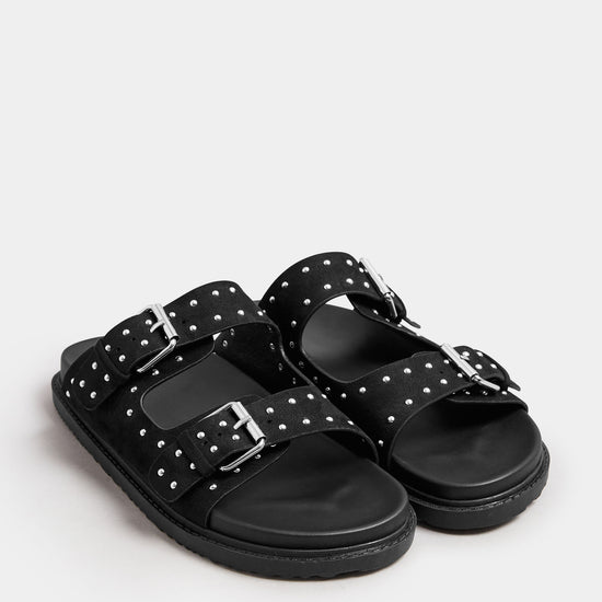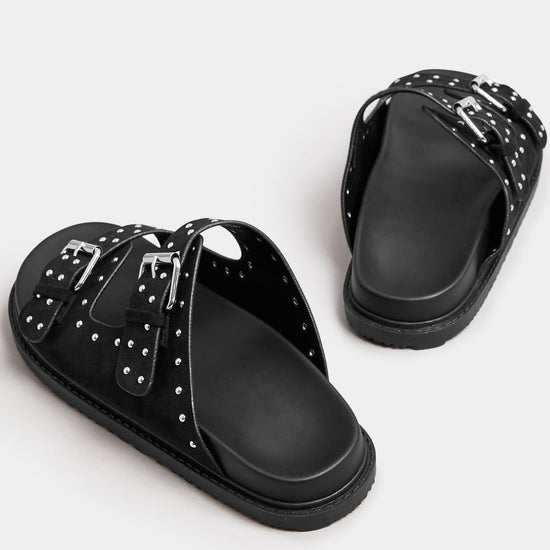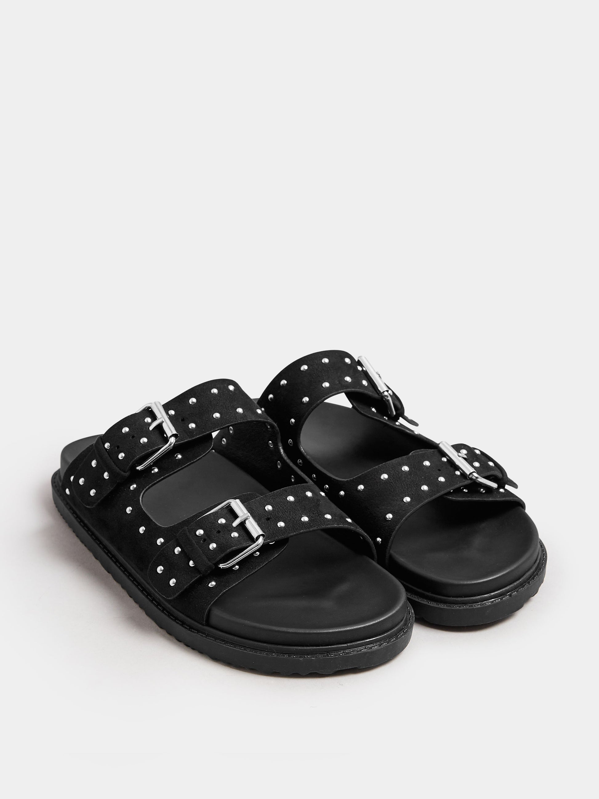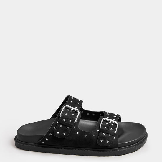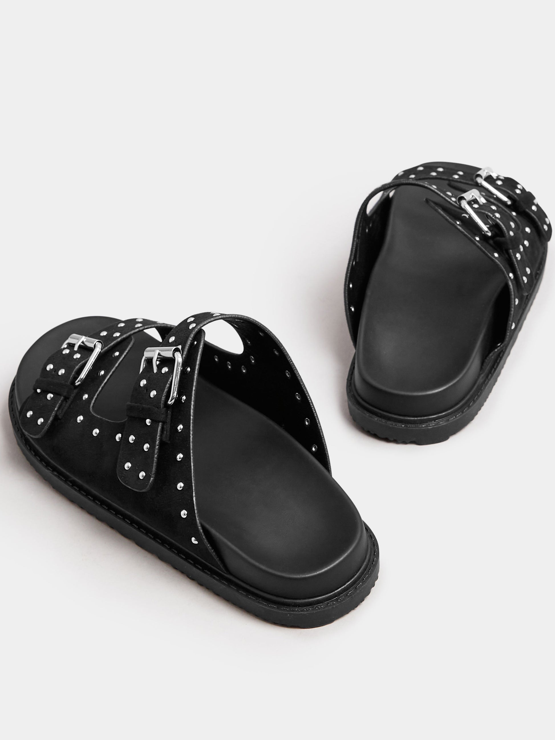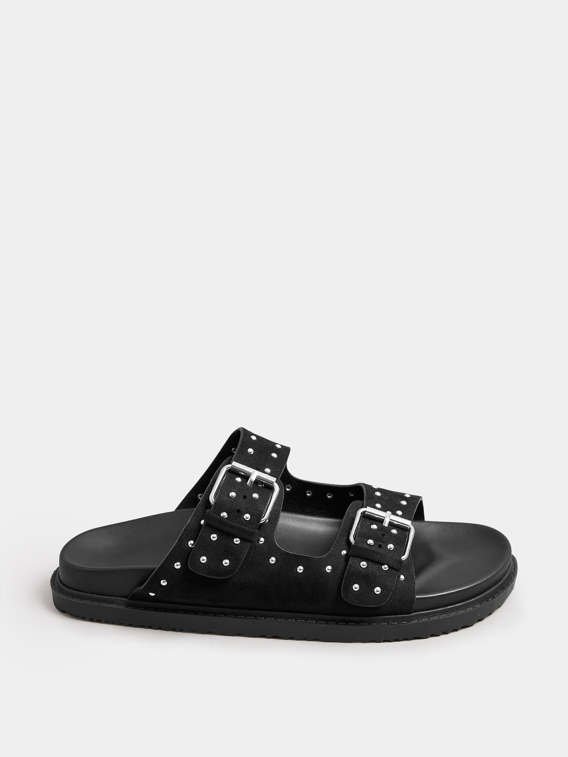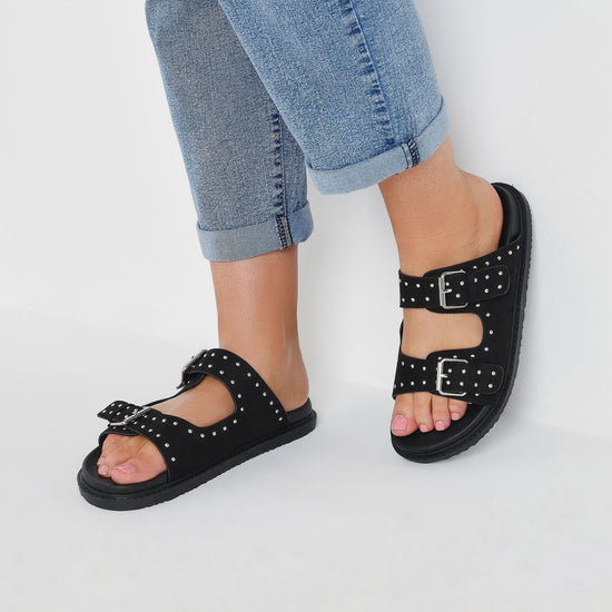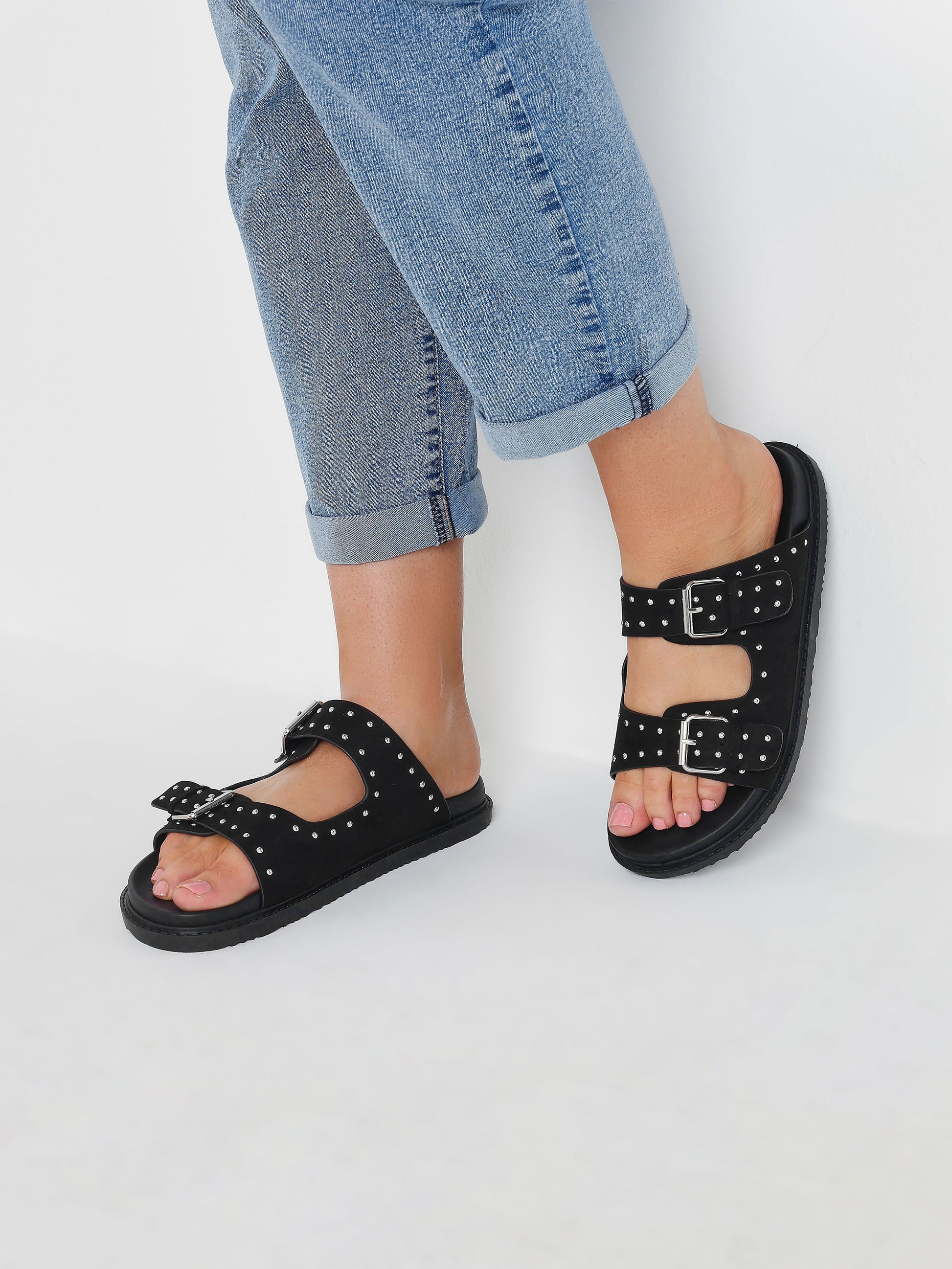 Opplev ultimat komfort og stil med disse sorte, nittebesatte sandalene fra merket Yours. Designet med ekstra bredde (EEE), er de perfekte for dem som søker både plass og støtte. Sandalene har en åpen rund tå og en formstøpt fotseng som sikrer en behagelig passform hele dagen.