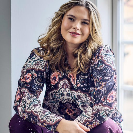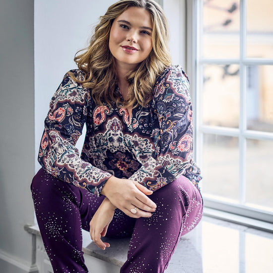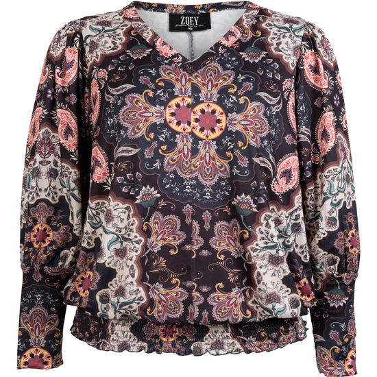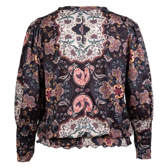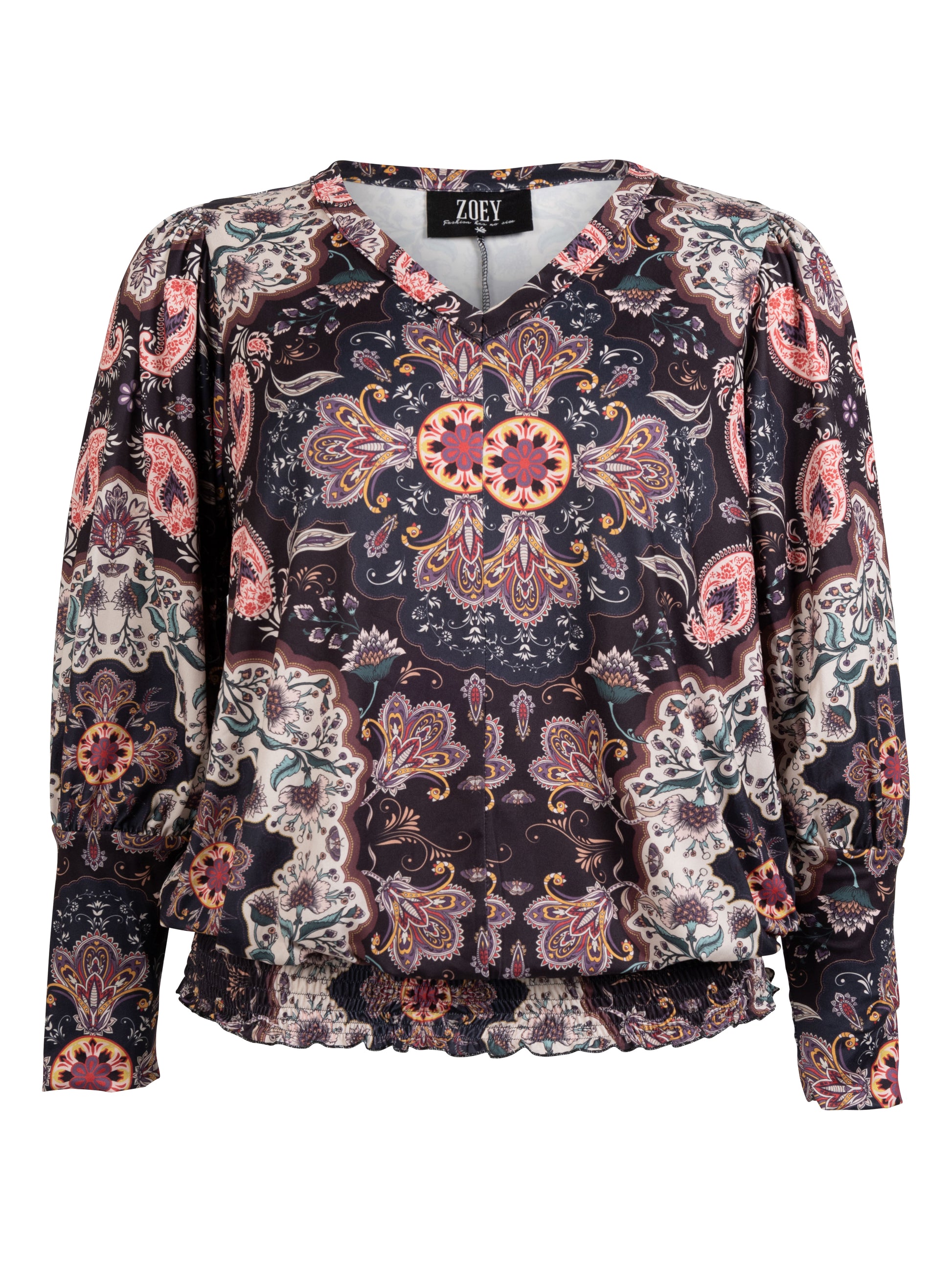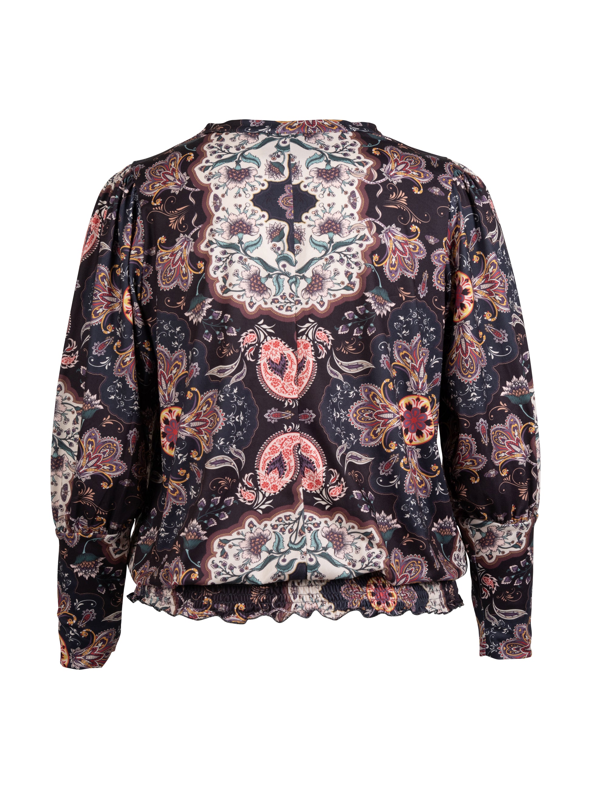 Opplev maksimal komfort og stil med denne blusen fra ZOEY, laget i mykt, elastisk jersey-stoff. Det flotte paisley-inspirerte mønsteret i svart, bordeaux og grønne toner gir et unikt uttrykk, mens elastikkanten nederst gir en avslappet og flatterende passform.