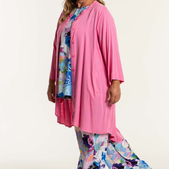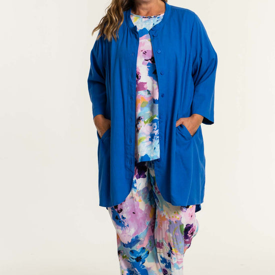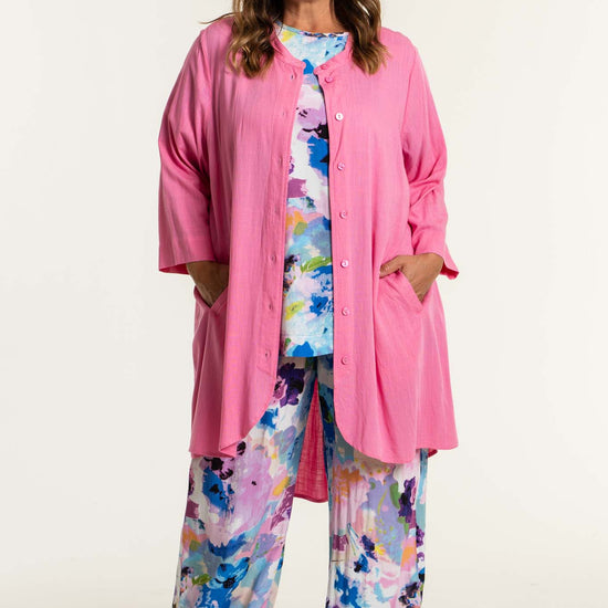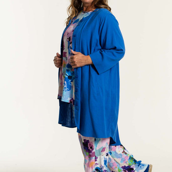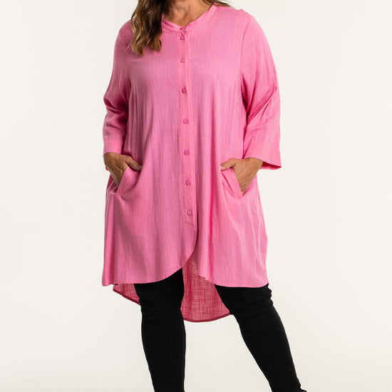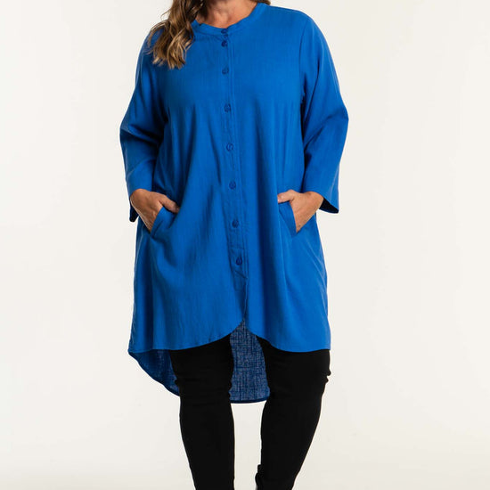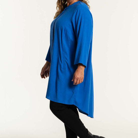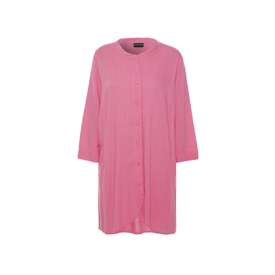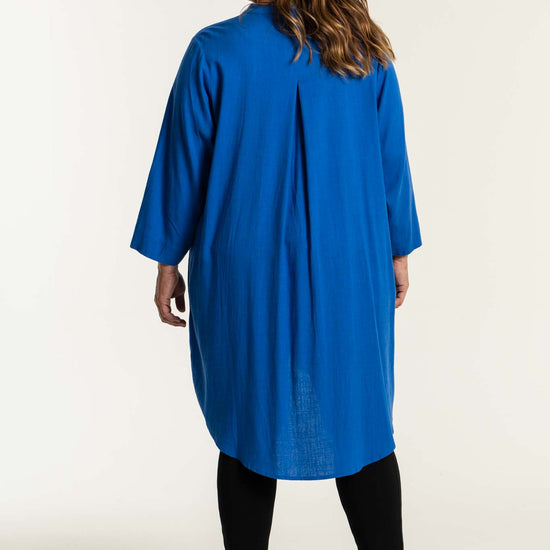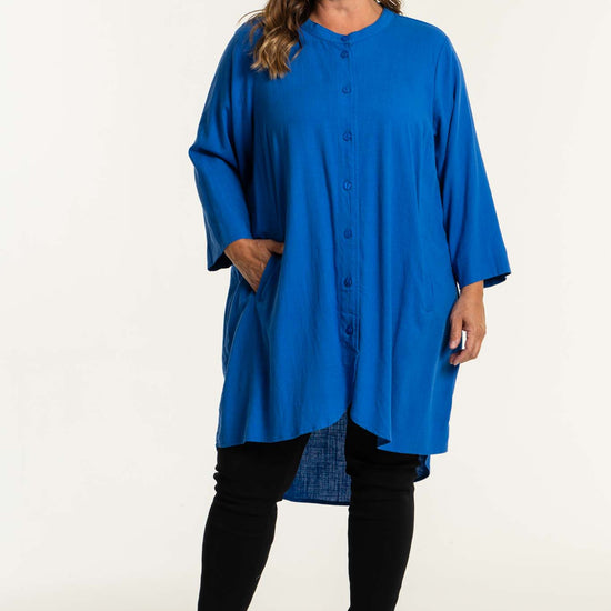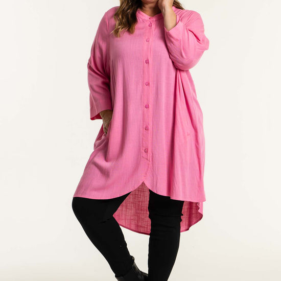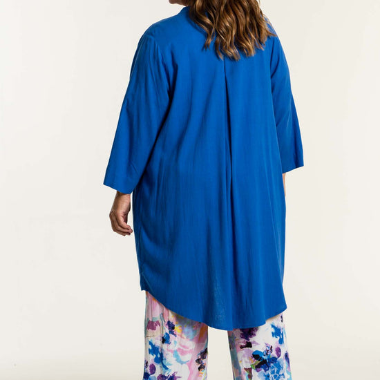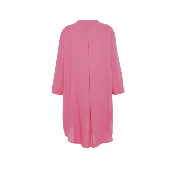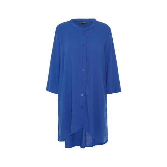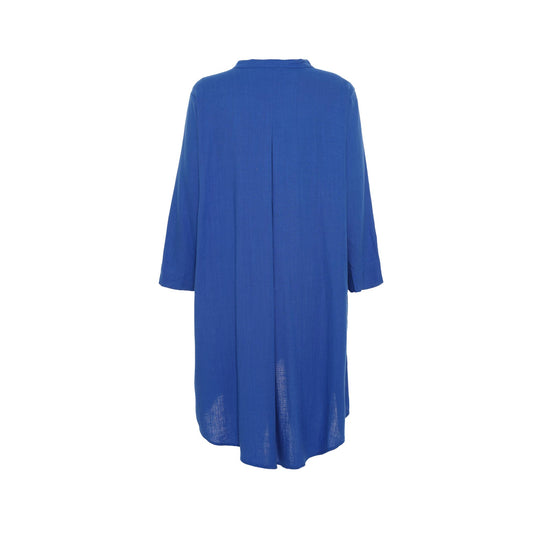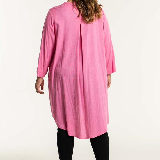 Denne vakre tunikaen er laget av en blanding av 70 % viskose og 30 % lin, som sikrer en myk og behagelig passform. Designet er både tidløst og moderne med A-form, rund hals med knapper og løse 7/8-ermer som gir et avslappet preg.