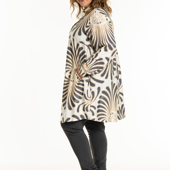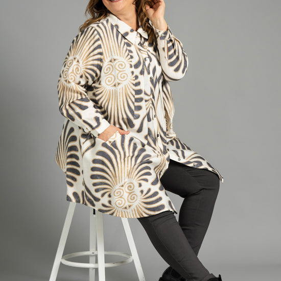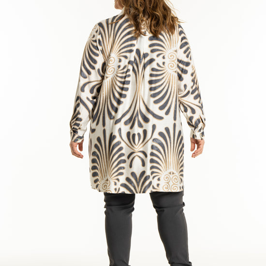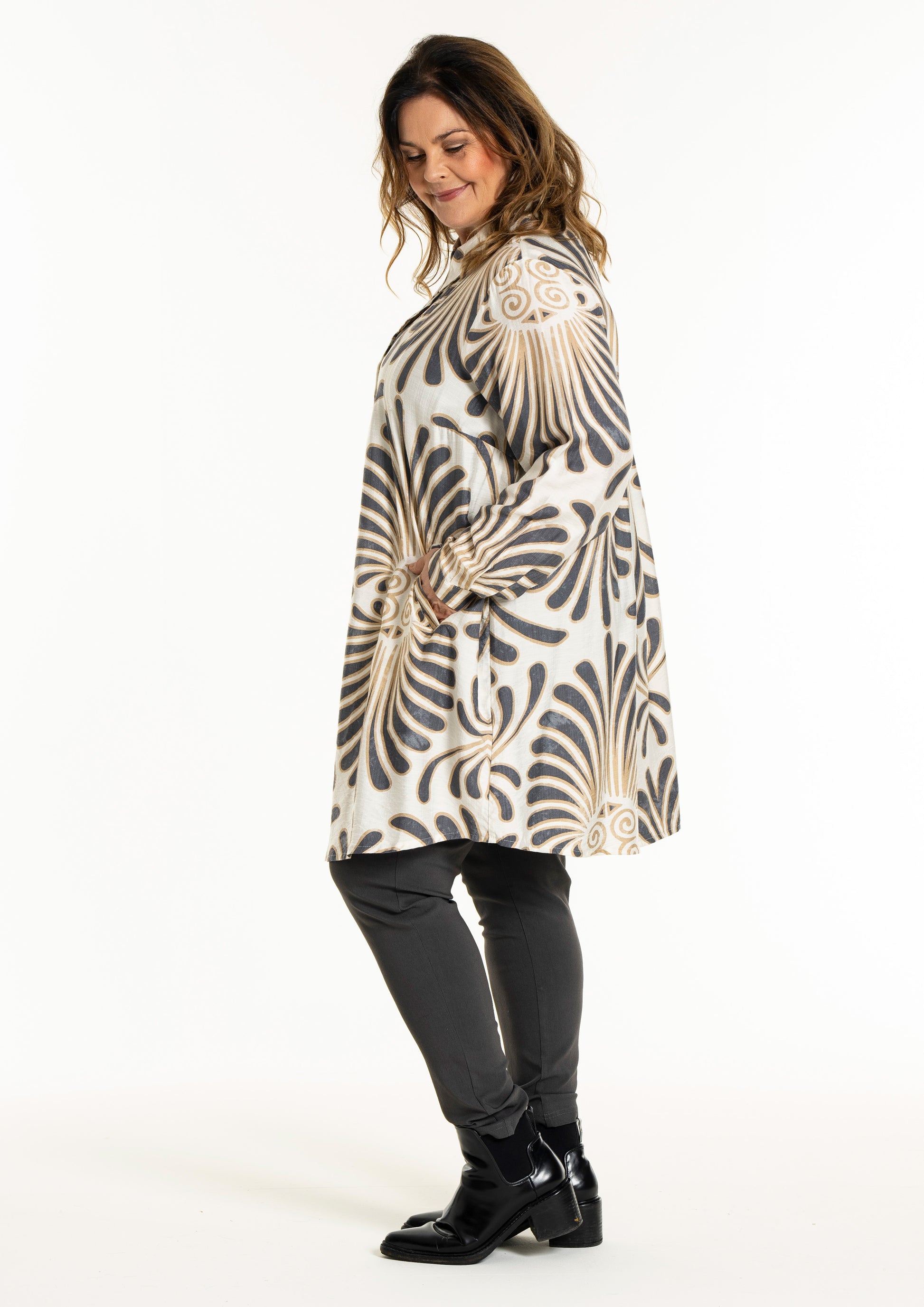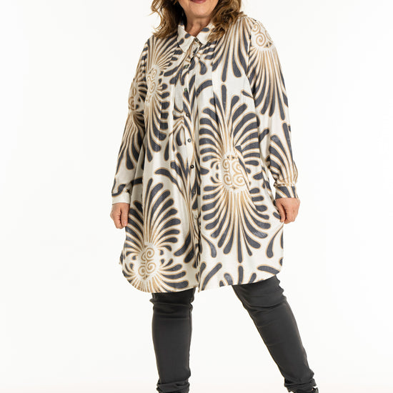 Opplev den stilfulle tunikaen fra Gozzip Woman, som kombinerer eleganse og komfort. Med en løs A-formet passform og et klassisk skjortekragedesign er denne tunika perfekt for både hverdagsbruk og festlige anledninger. Laget av 90% viskose og 10% nylon, tilbyr den en myk og lett følelse. Det store, grafiske printet i nøytrale sand- og gråtoner gir et trendy og moderne utseende.