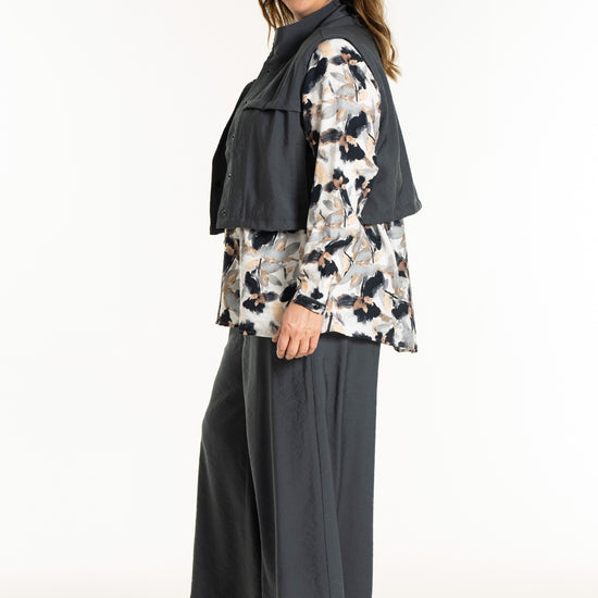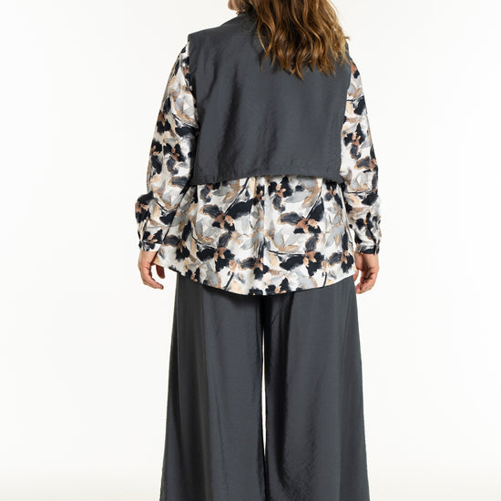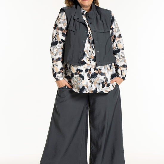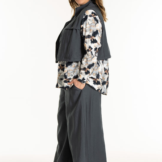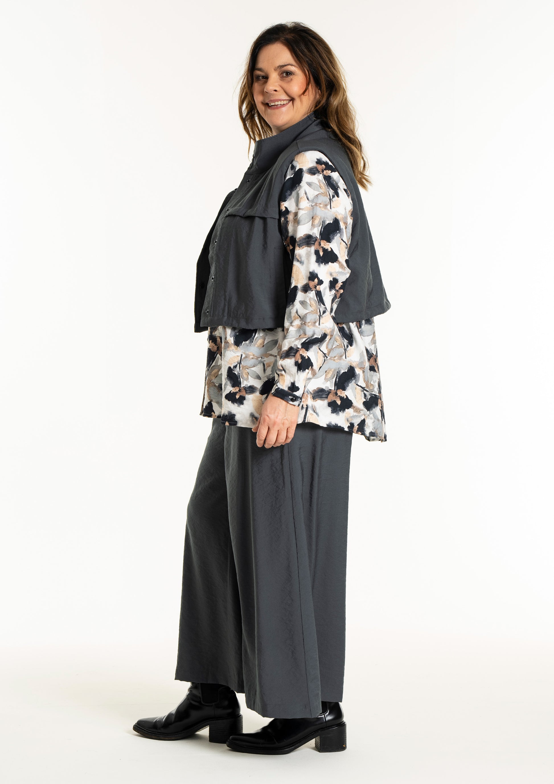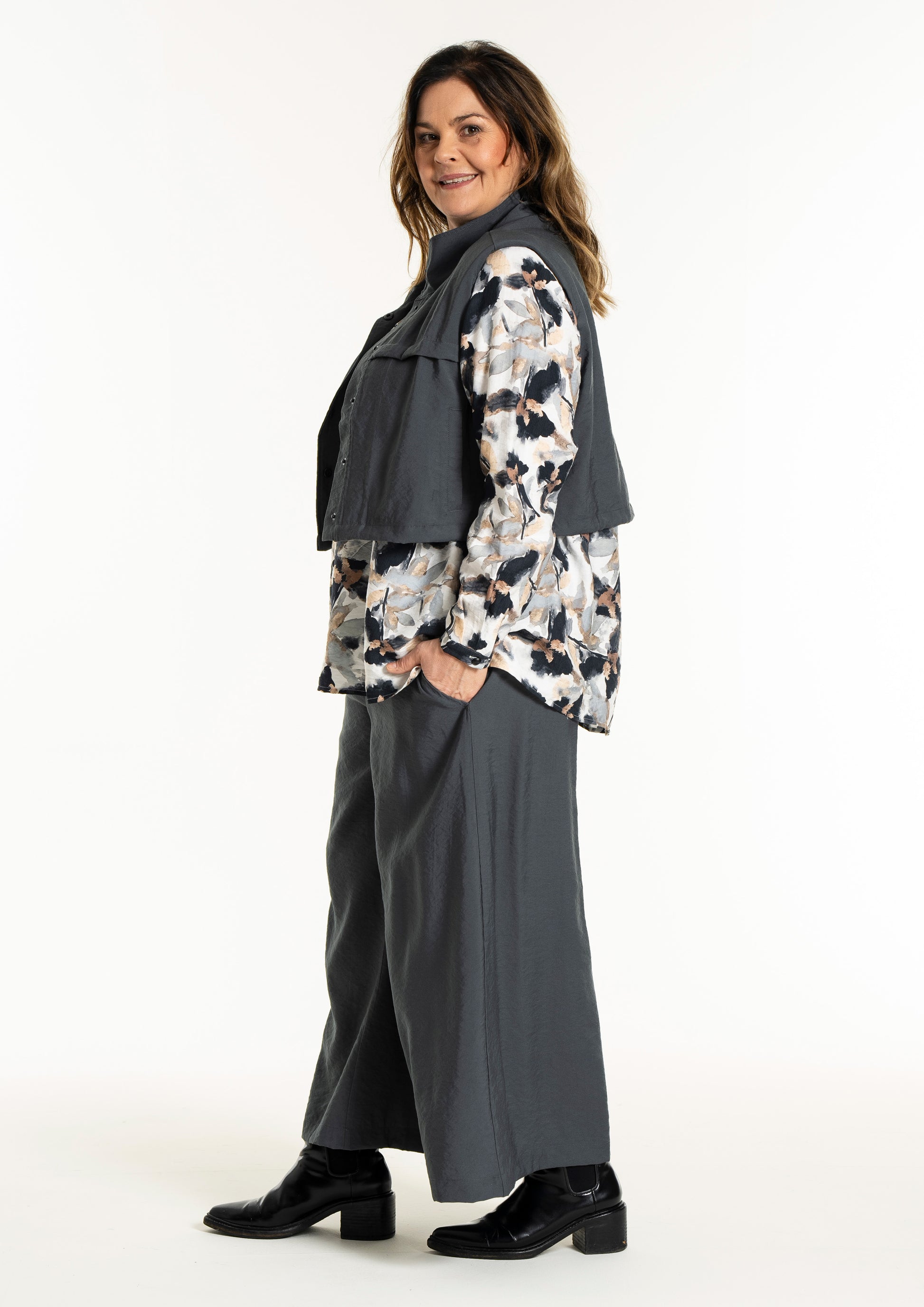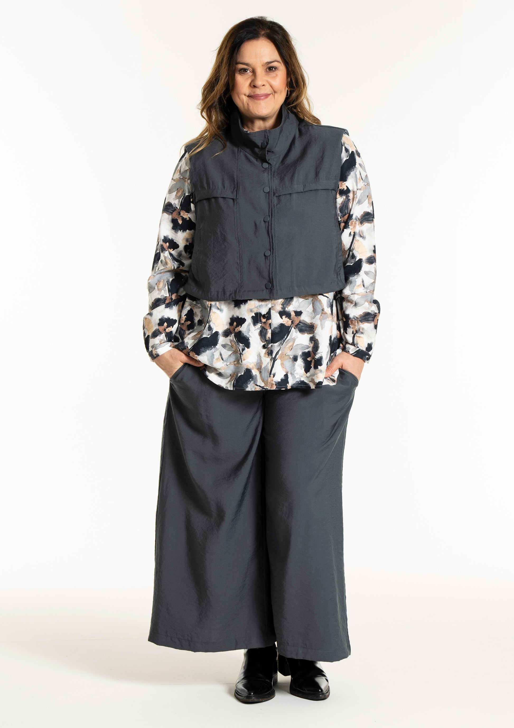 Denne vesten er helt ideell for å skape en spennende lag-på-lag-look, hvor du for eksempel kan bruke den åpen over en mønstret stil for å bryte opp antrekket. De brede skuldrene og det ensfargede uttrykket tilfører kant til en feminin kjole, akkurat slik man ser på modellen. De praktiske skrålommene i siden og trykknappene sørger for at funksjonaliteten står i stil med det sterke designet.