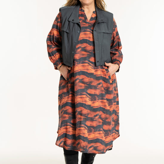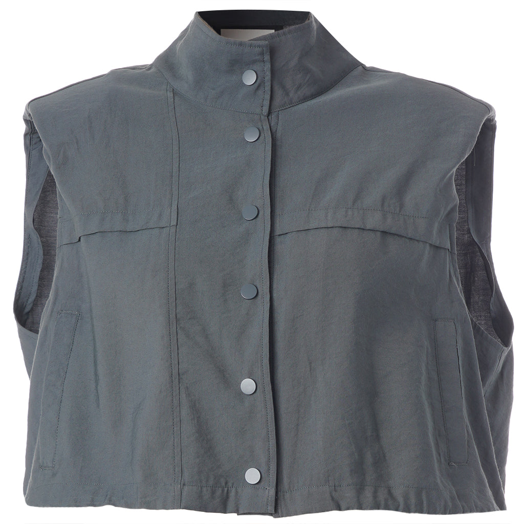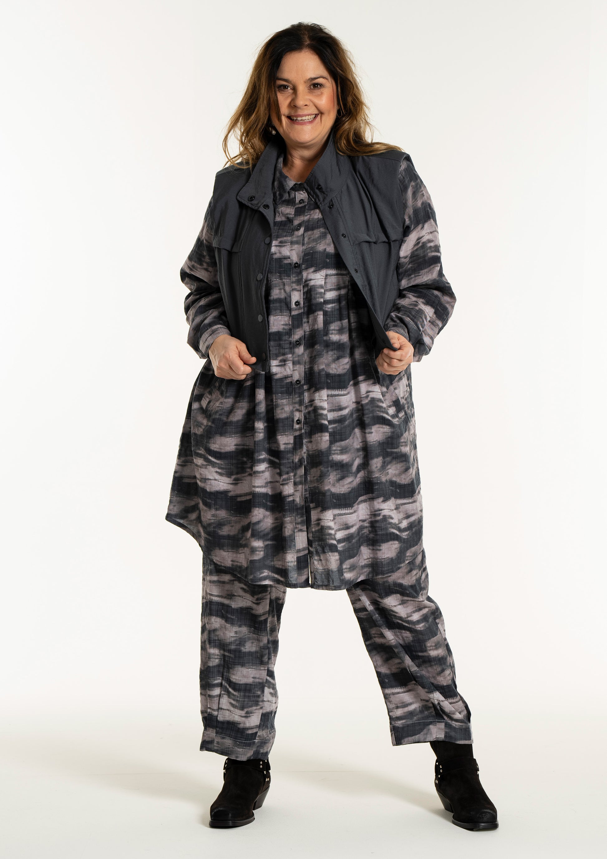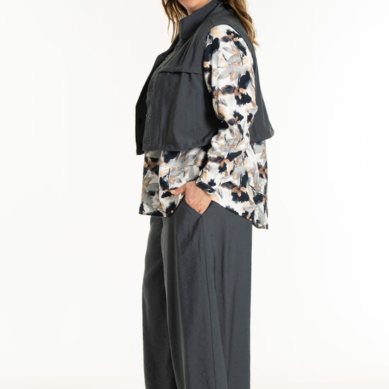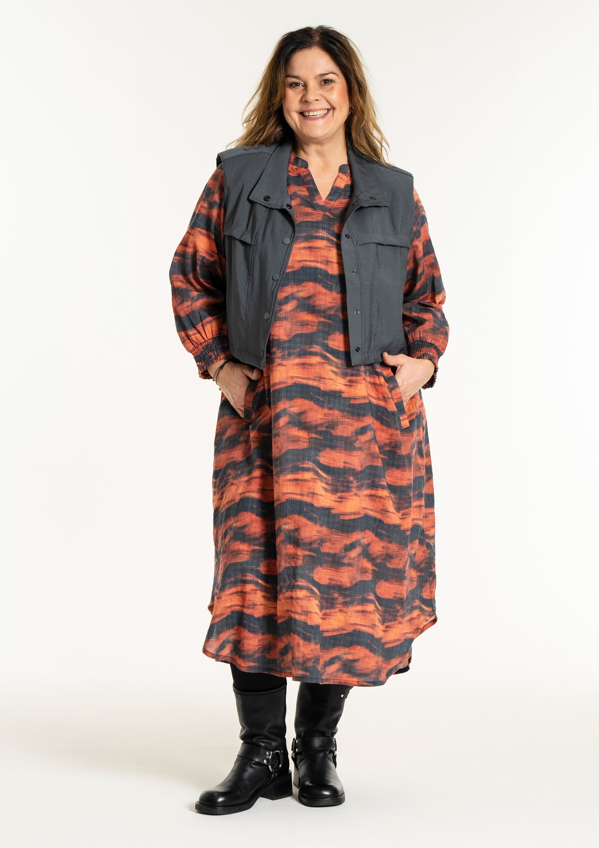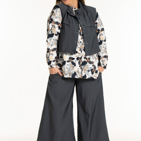 Denne vesten er helt ideell for å skape en spennende lag-på-lag-look, hvor du for eksempel kan bruke den åpen over en mønstret stil for å bryte opp antrekket. De brede skuldrene og det ensfargede uttrykket tilfører kant til en feminin kjole, akkurat slik man ser på modellen. De praktiske skrålommene i siden og trykknappene sørger for at funksjonaliteten står i stil med det sterke designet.