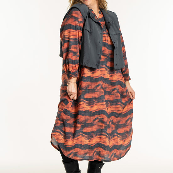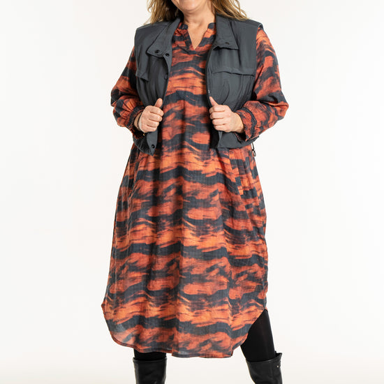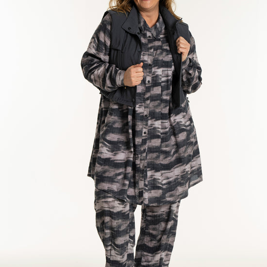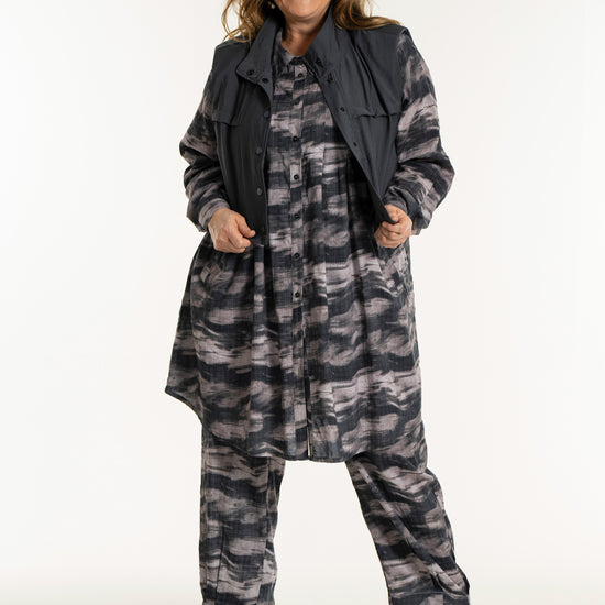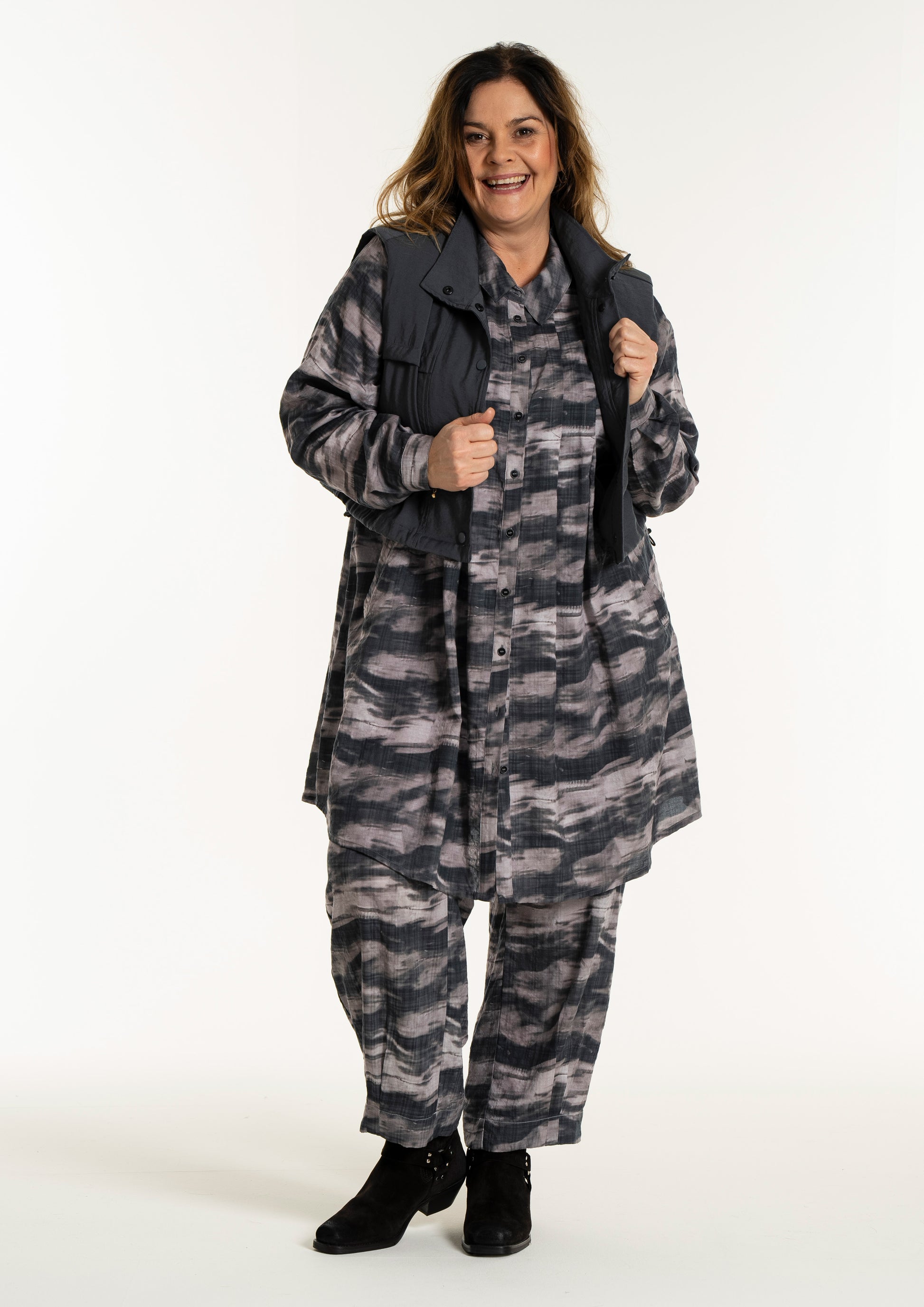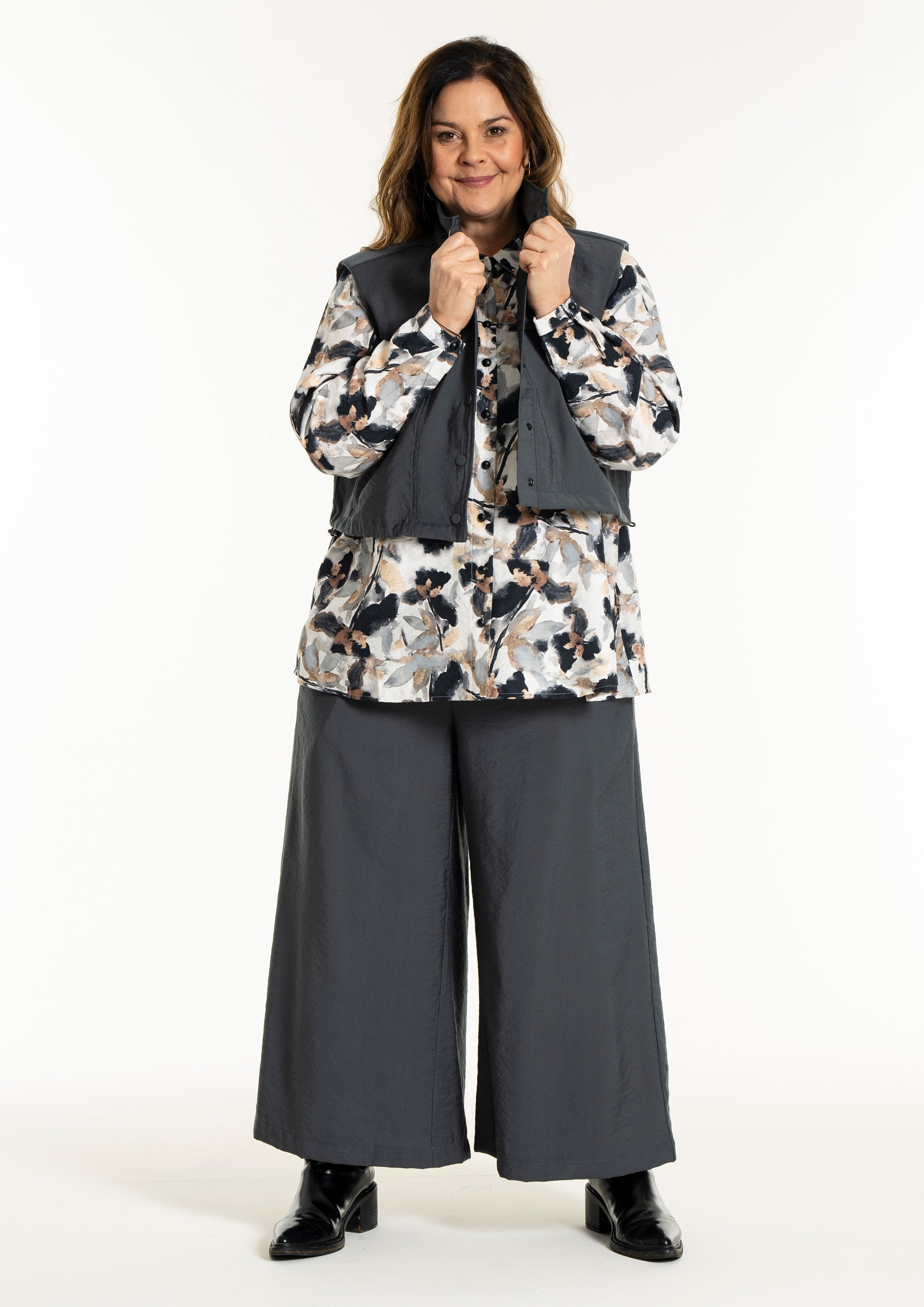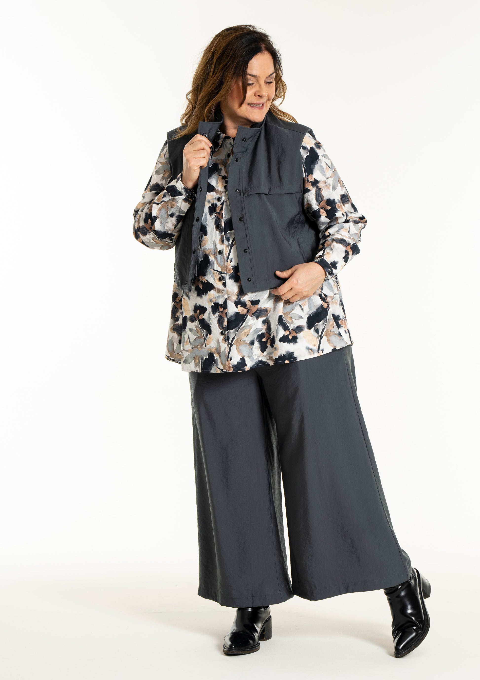 Denne vesten er helt ideell for å skape en spennende lag-på-lag-look, hvor du for eksempel kan bruke den åpen over en mønstret stil for å bryte opp antrekket. De brede skuldrene og det ensfargede uttrykket tilfører kant til en feminin kjole, akkurat slik man ser på modellen. De praktiske skrålommene i siden og trykknappene sørger for at funksjonaliteten står i stil med det sterke designet.