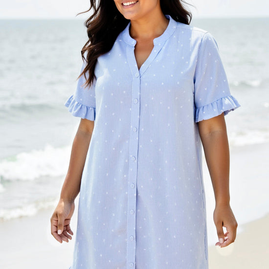 - Design: Knaplukning foran og dekorative flæsekanter på ærmer og bund
