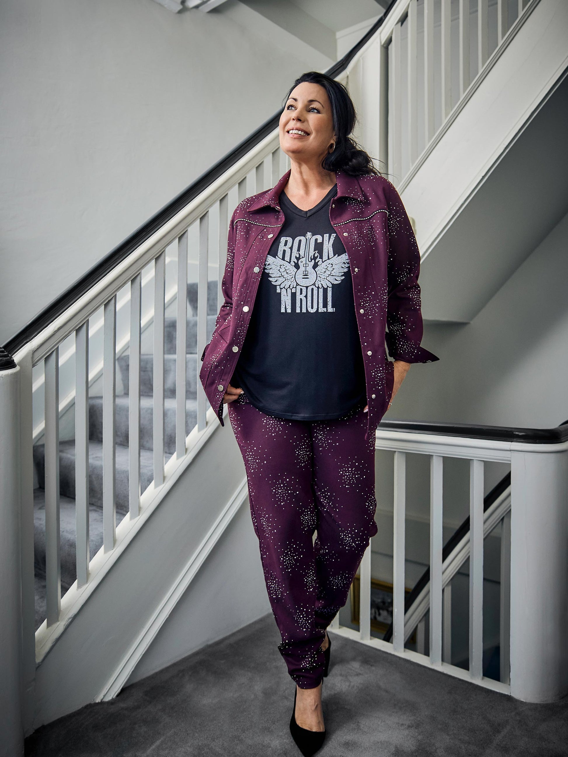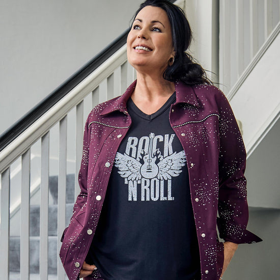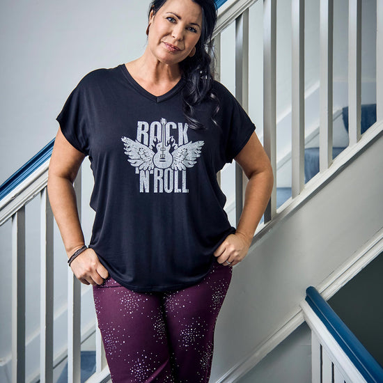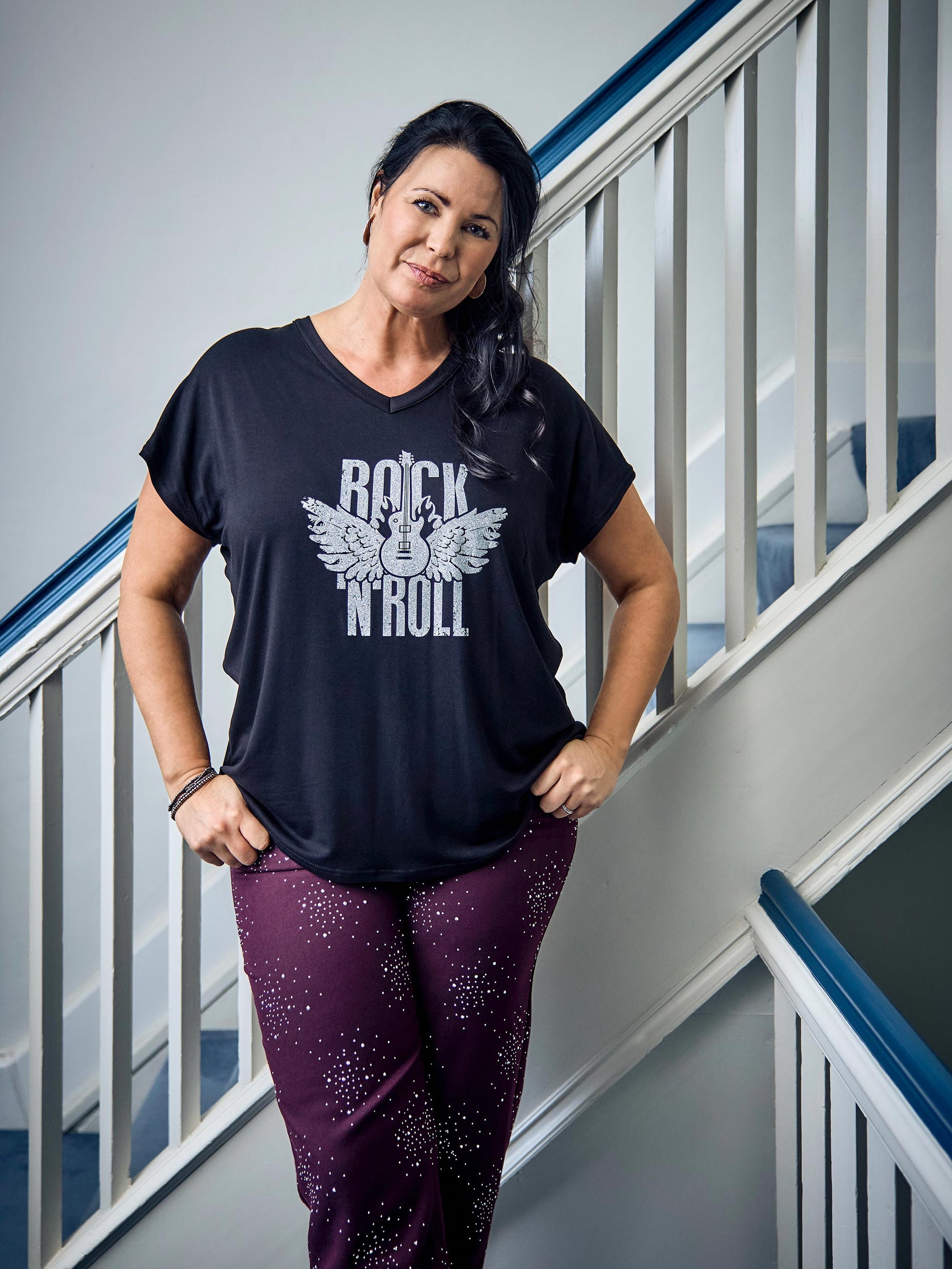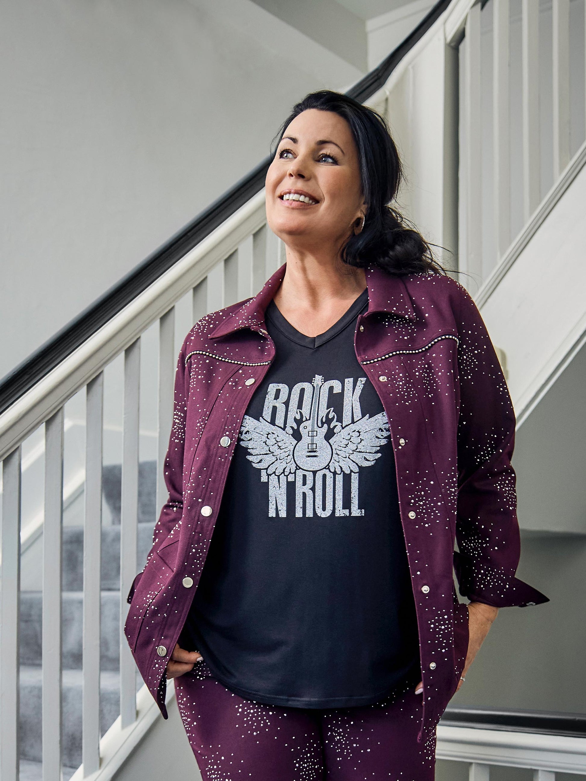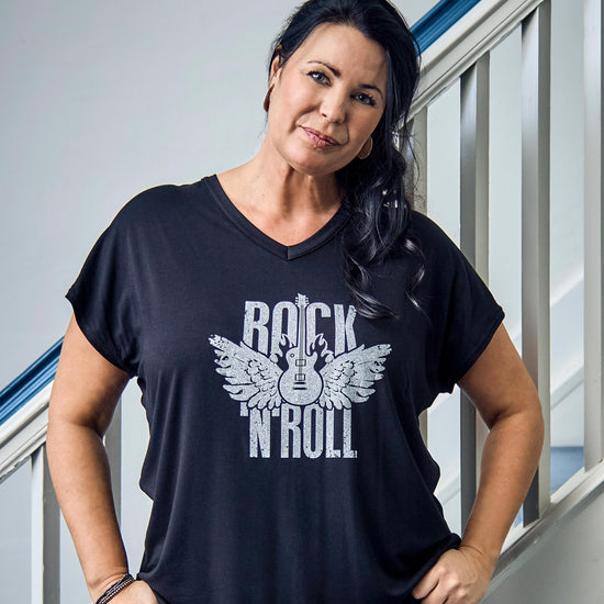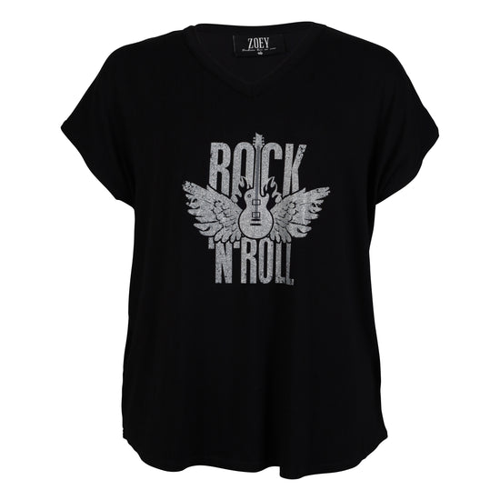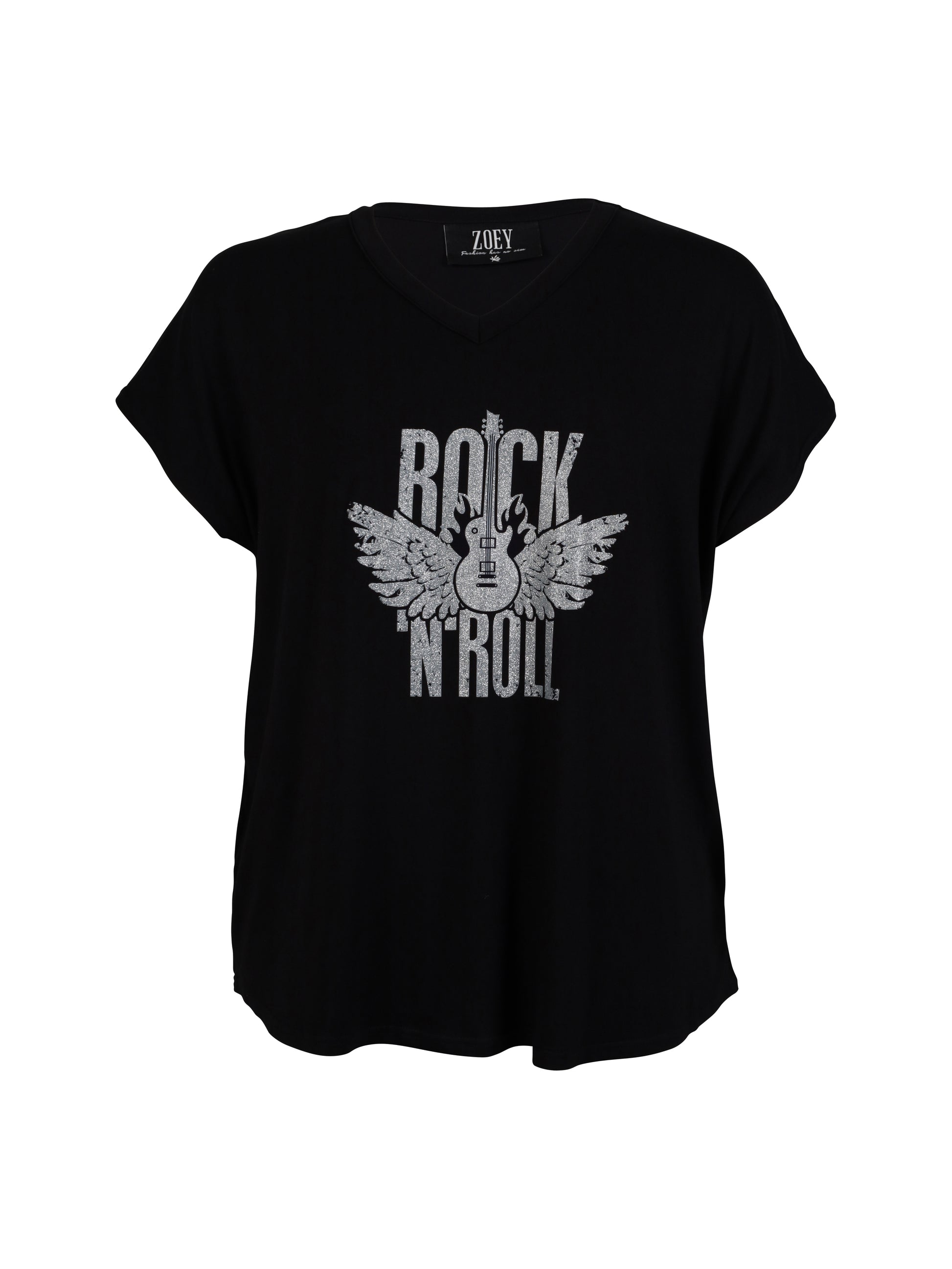 Giv din garderobe et cool twist med denne sorte T-shirt fra ZOEY. T-shirten har et unikt “ROCK N' ROLL” frontprint med grafiske detaljer som elguitar og vinger, der signalerer attitude og personlighed. Det bløde materiale sikrer maksimal komfort, mens den lette V-udskæring og det løse fit giver et afslappet, feminint look.