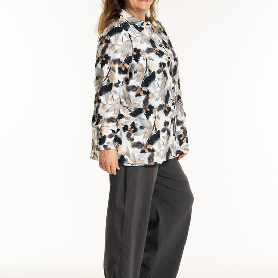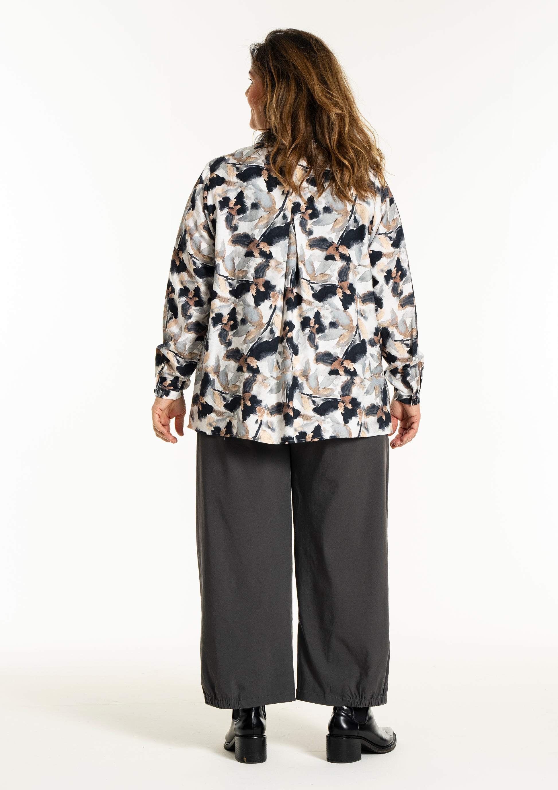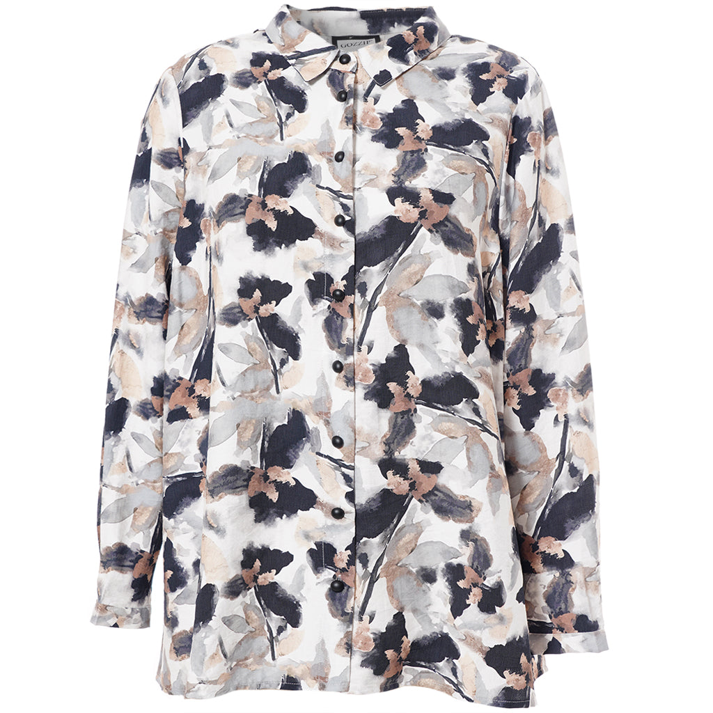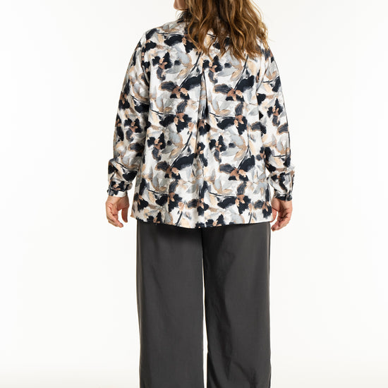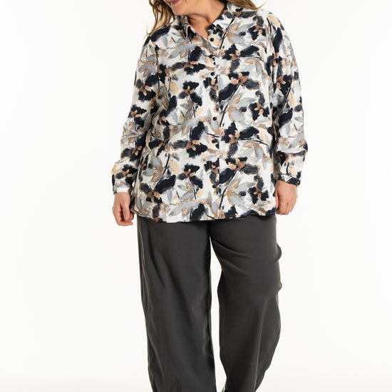 Denne sjarmerende plus size skjorten er designet med et kunstnerisk trykk i dempede nyanser som gir et sofistikert og moderne uttrykk. Med sin klassiske krage og gjennomgående knappelukking er den ideell til både hverdagsbruk og finere anledninger, mens kvaliteten er en lett vevd blanding med et lett krøllet utseende.- 80% viskose og 20% nylon