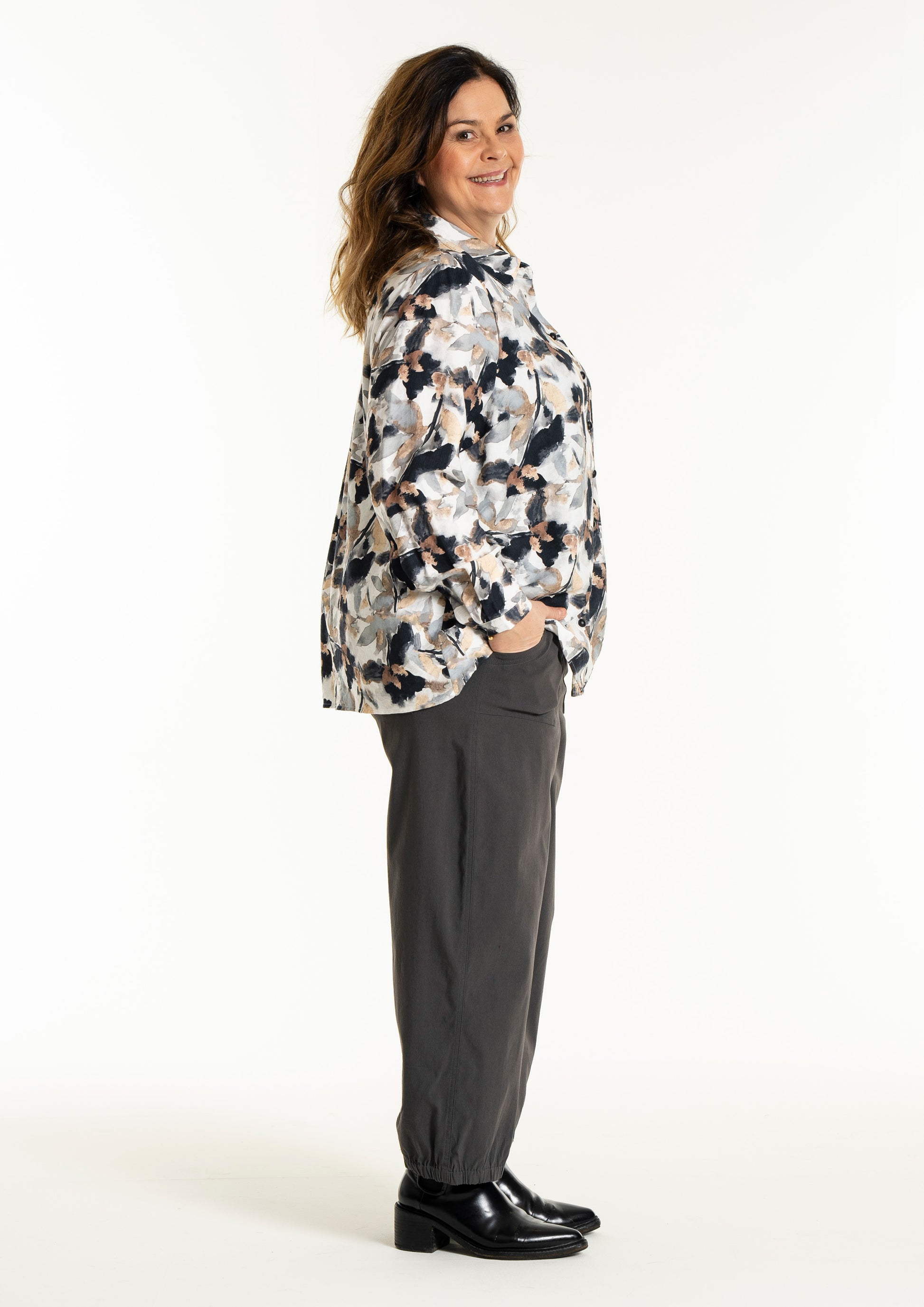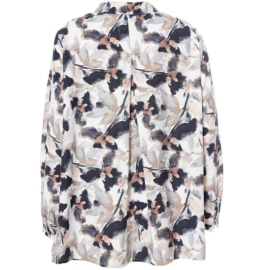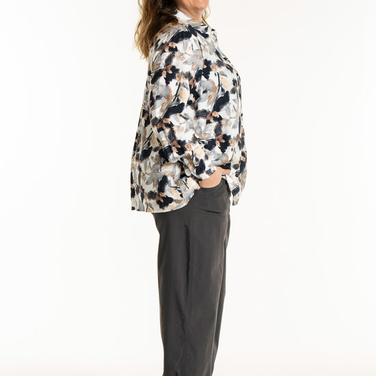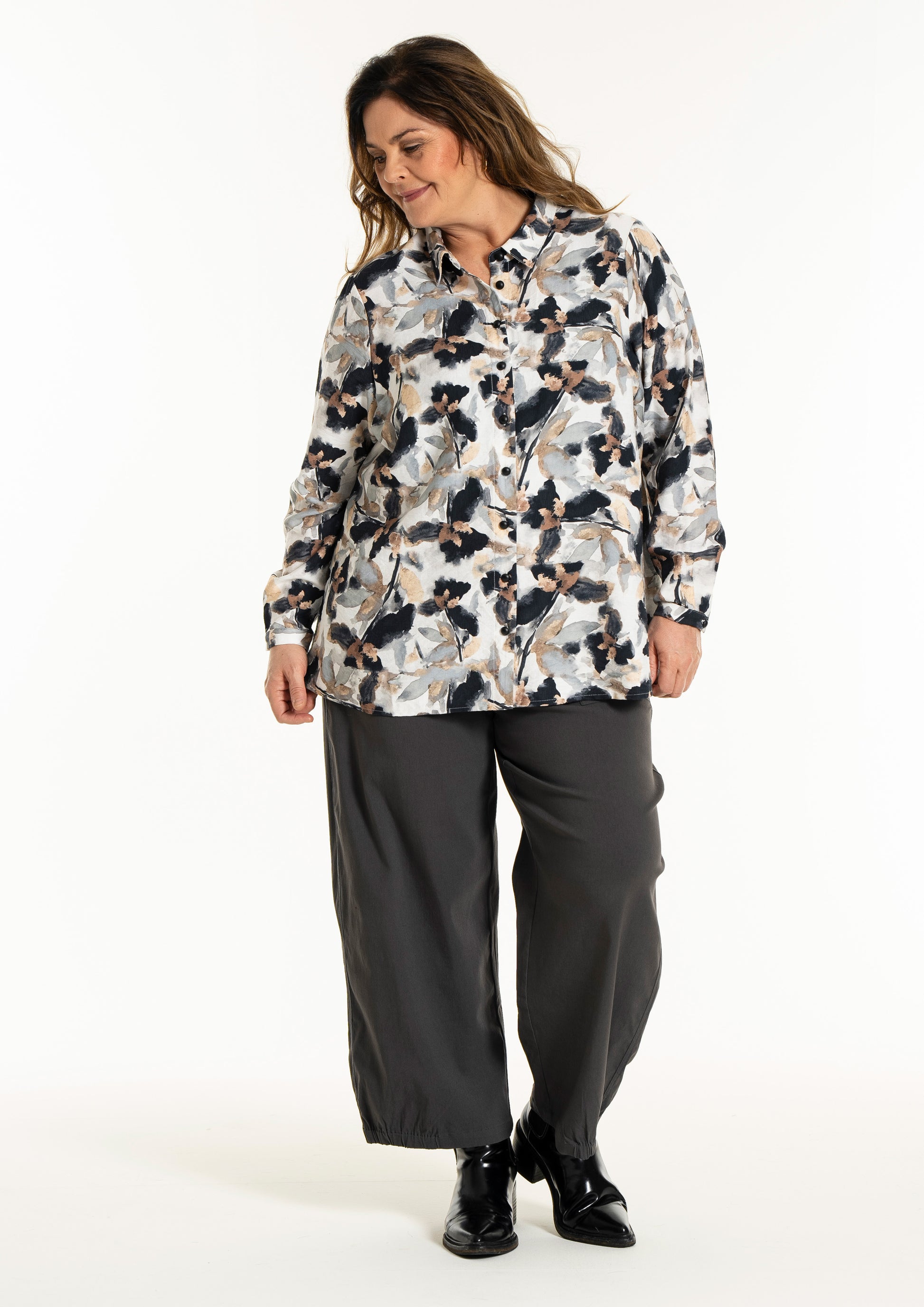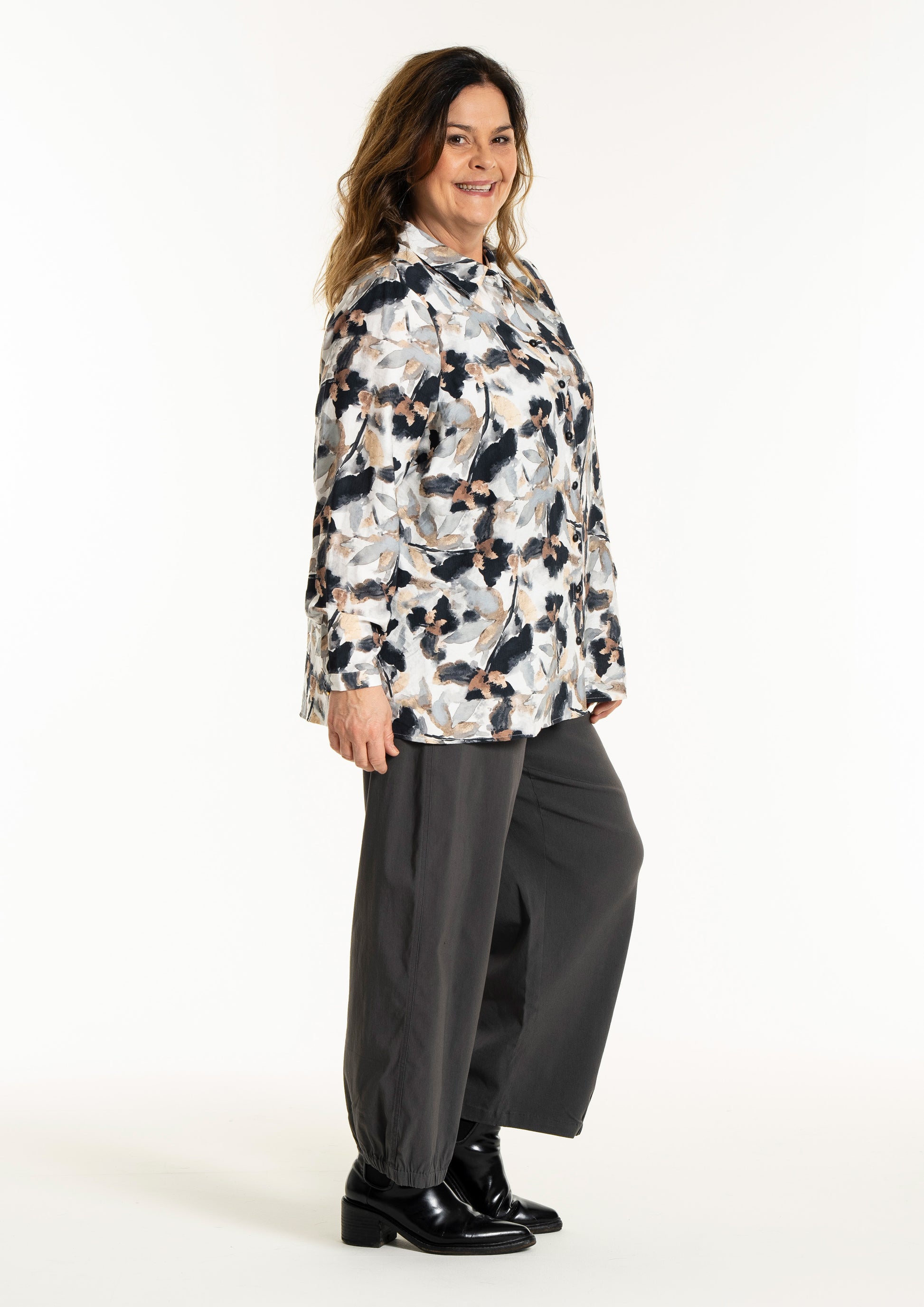 Denne sjarmerende plus size skjorten er designet med et kunstnerisk trykk i dempede nyanser som gir et sofistikert og moderne uttrykk. Med sin klassiske krage og gjennomgående knappelukking er den ideell til både hverdagsbruk og finere anledninger, mens kvaliteten er en lett vevd blanding med et lett krøllet utseende.- 80% viskose og 20% nylon