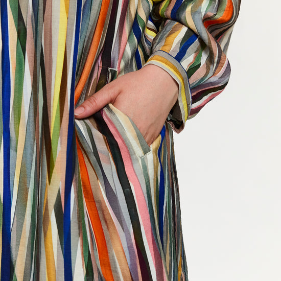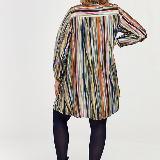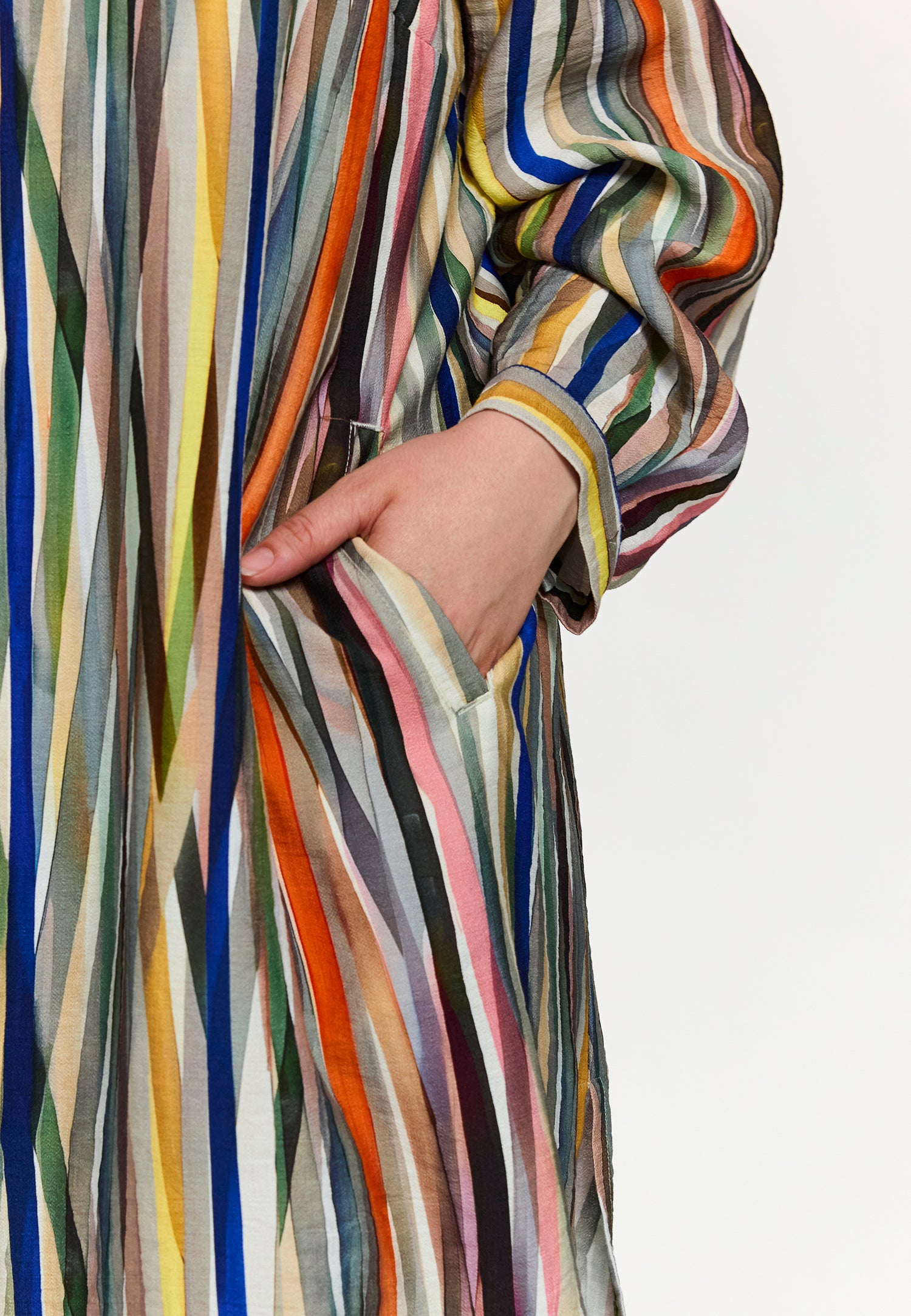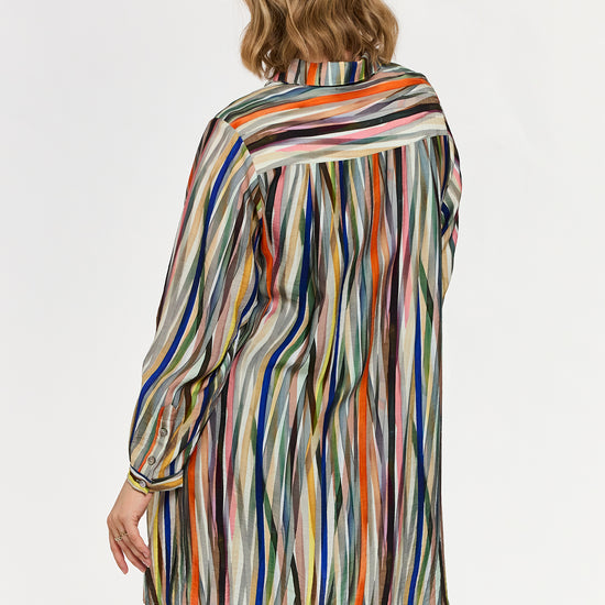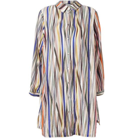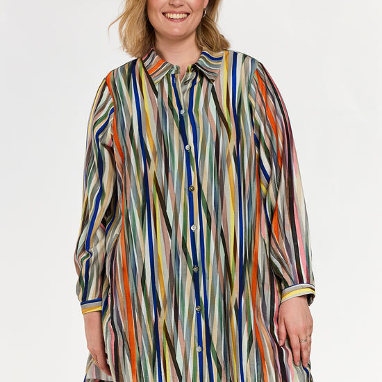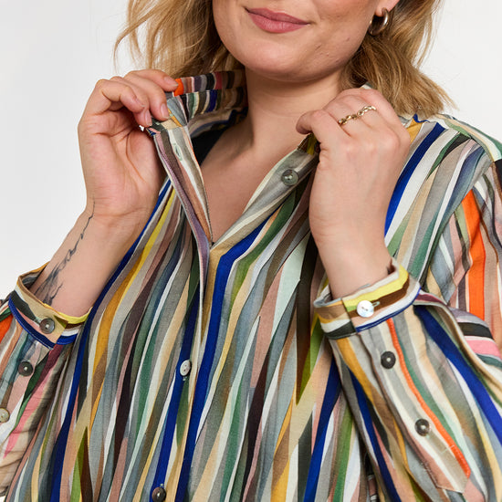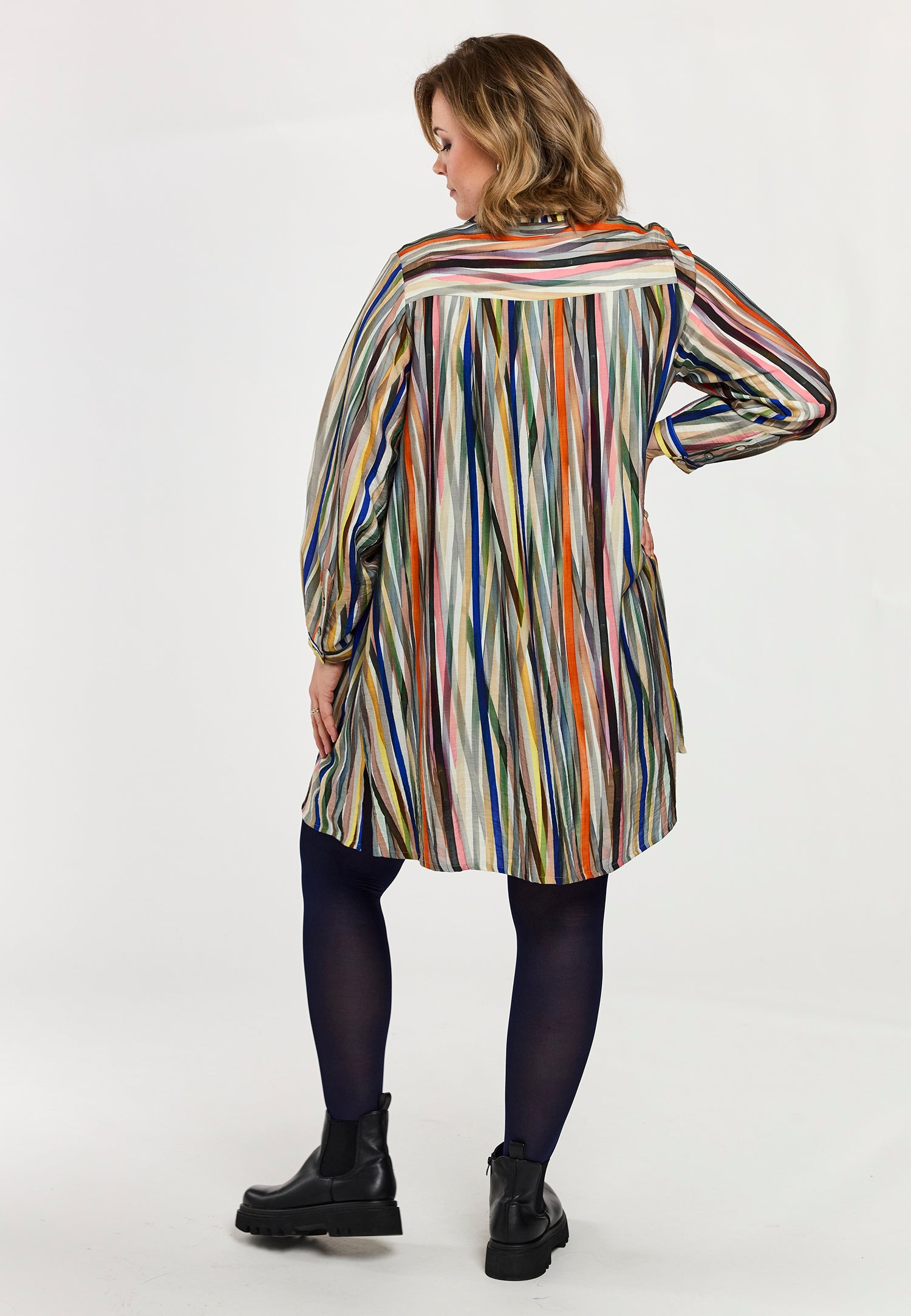 Gled deg over denne stilrene skjorten fra Gozzip Woman, laget i en lett miks av viskose og nylon for optimal komfort og bevegelsesfrihet. Den har en avslappet, ekstra lang passform, klassisk skjortekrave og et livlig, flerfarget stripeprint som gir et friskt og moderne uttrykk.