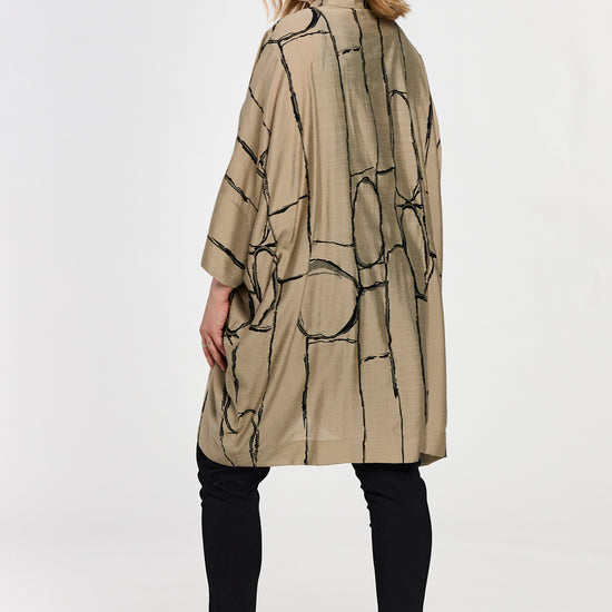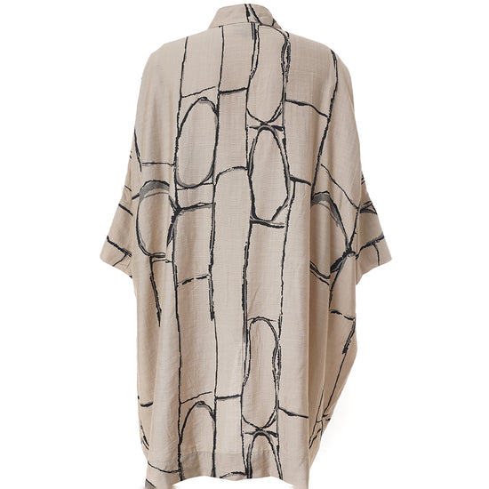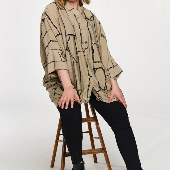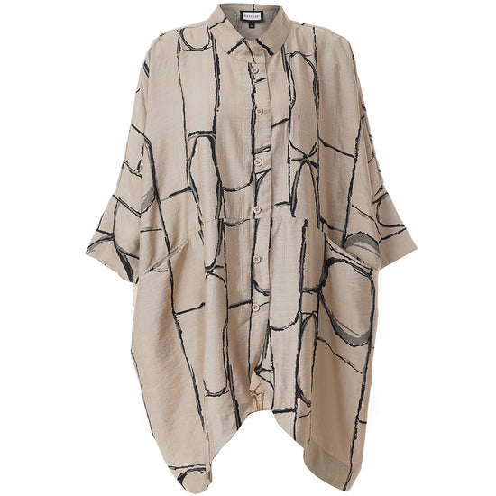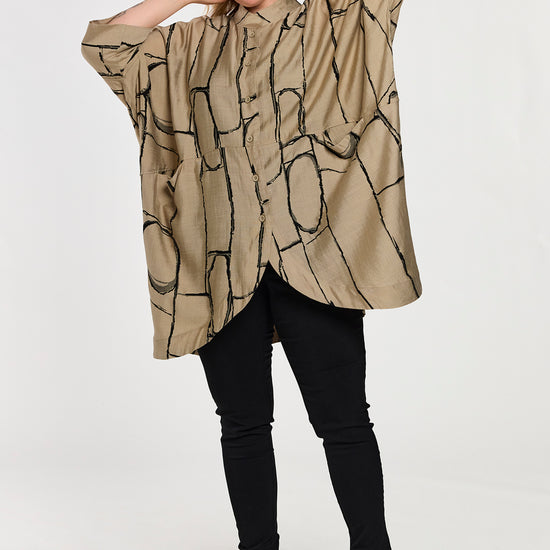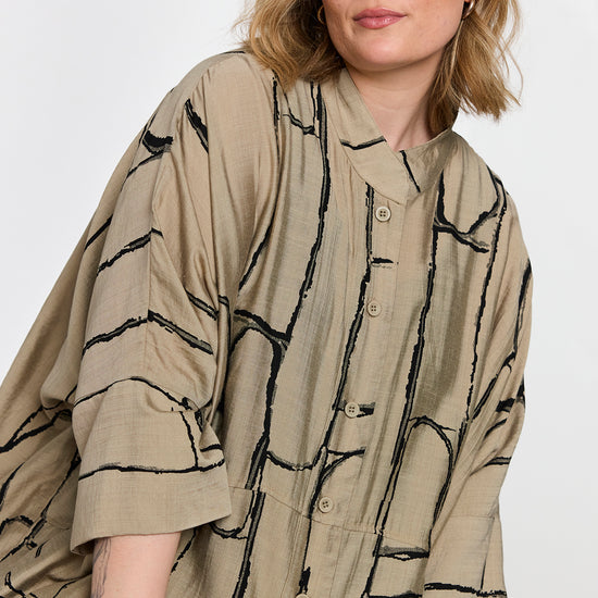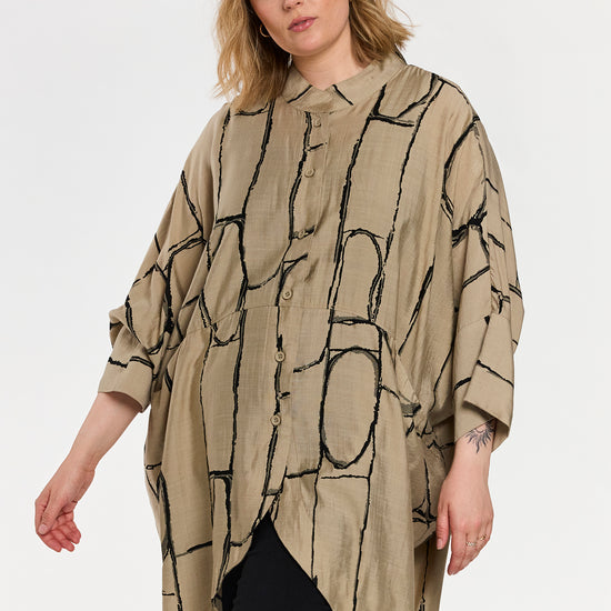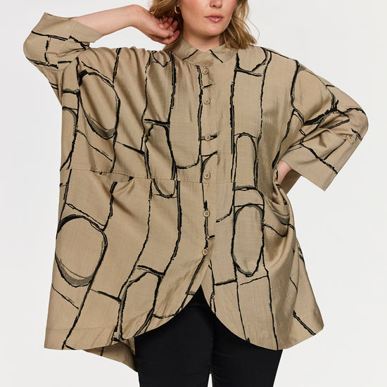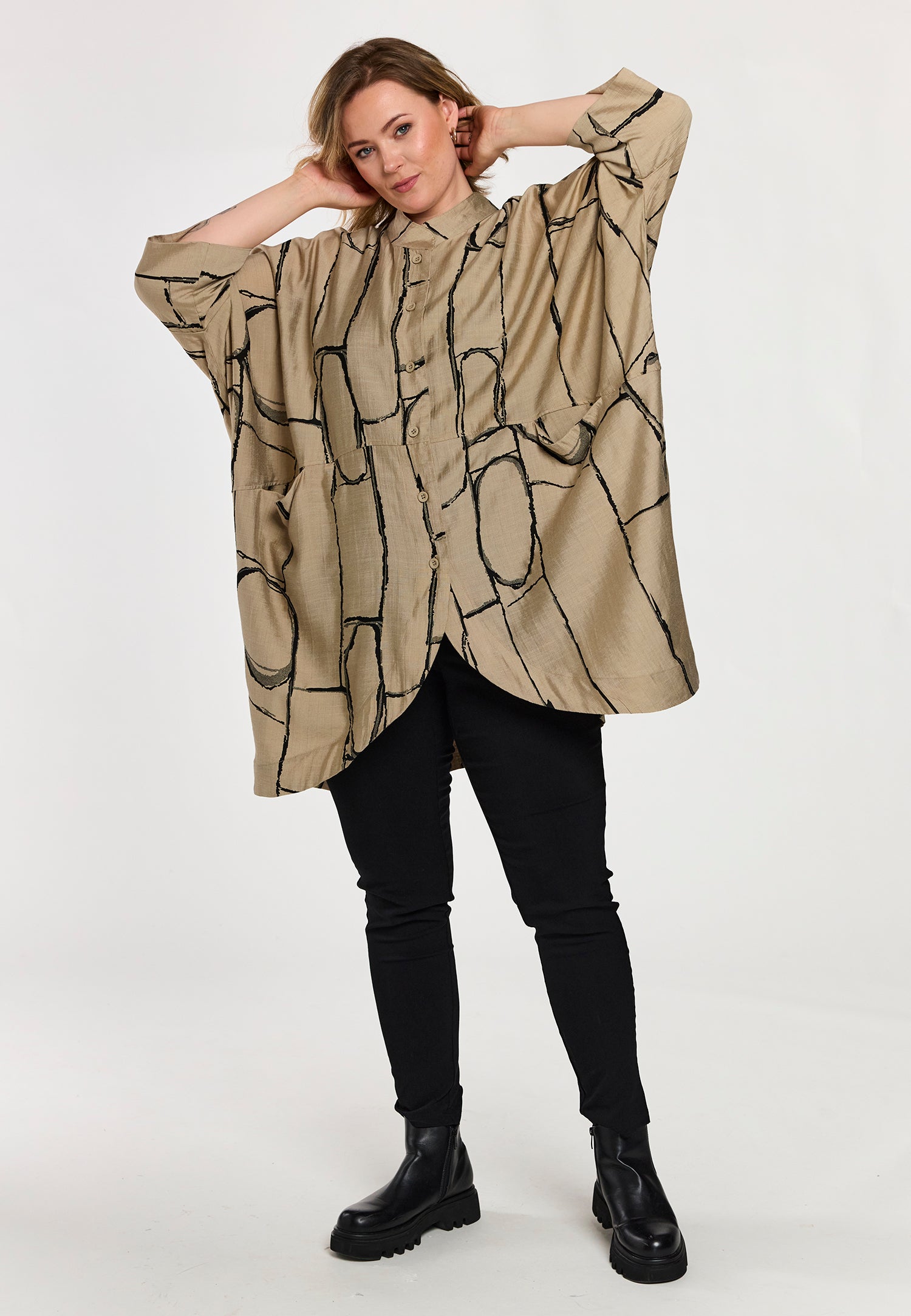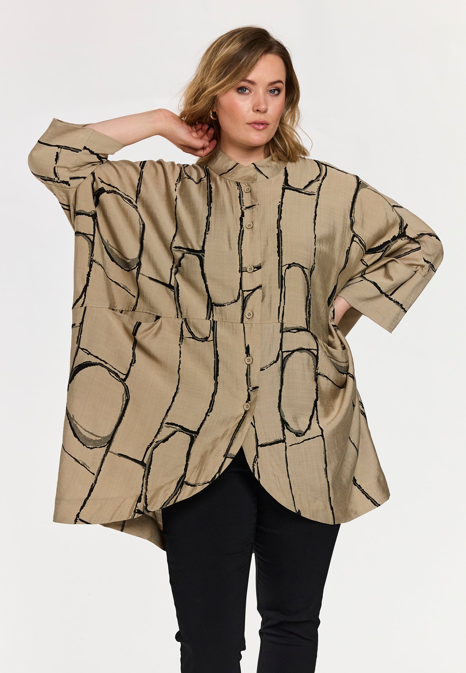Oppgrader garderoben med denne blusen fra Gozzip Woman. Blusen er laget i en lett og luftig kvalitet av 80% viskose og 20% polyester, og har et unikt grafisk print i sort på beige/sandfarget bakgrunn.