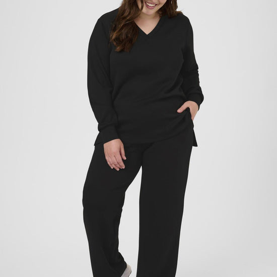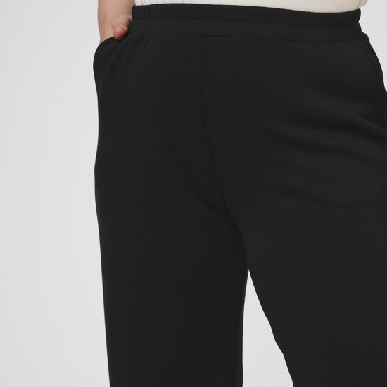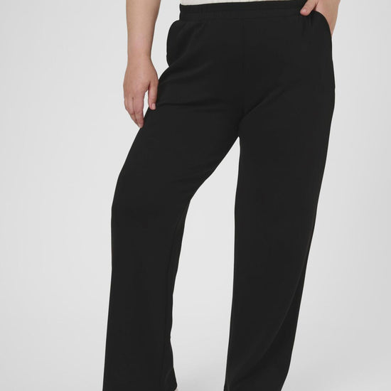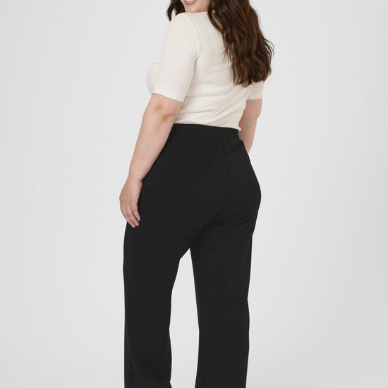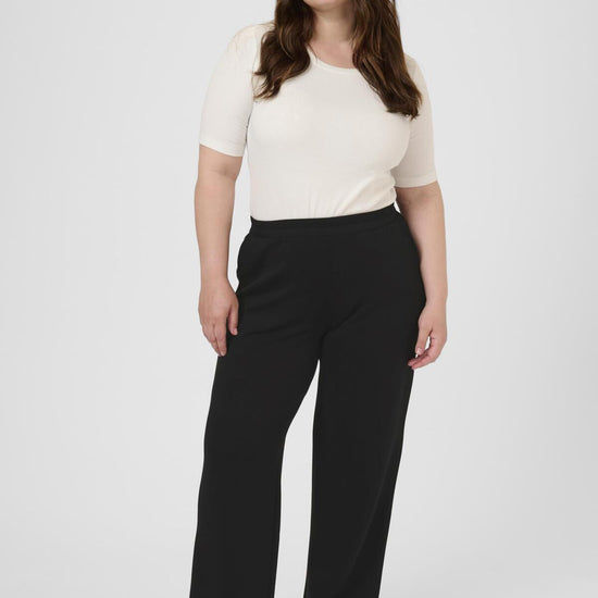 Disse sorte bukser fra Kaffe Curve gir deg en flott balanse mellom komfort og klassisk design. Passformen er løs med brede ben og elastisk linning, noe som sikrer bevegelsesfrihet og en flatterende silhuett til hverdags og kontor.