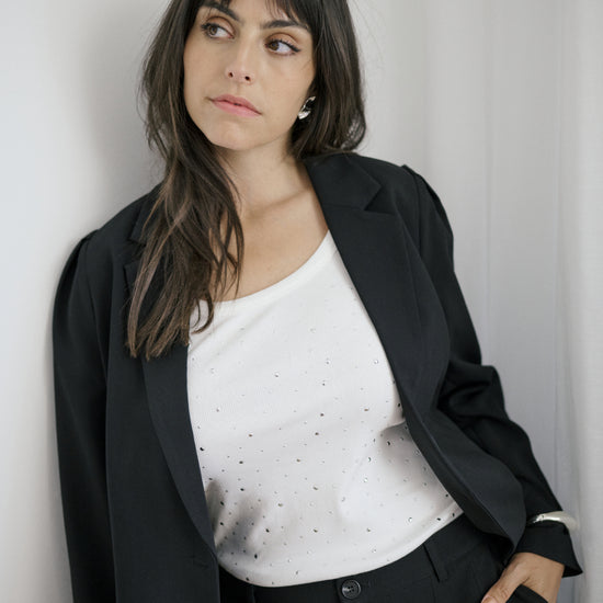 Med sitt enkle snitt og de elegante detaljene er denne toppen utrolig enkel å style inn i din eksisterende garderobe uansett anledning. Som det ses på bildet, fungerer den perfekt under en blazer, hvor de fine steinene gir et flott motspill til den mer formelle stilen. Du kan også bruke den alene på varme dager eller under en lett cardigan for et behagelig lag-på-lag uttrykk.
