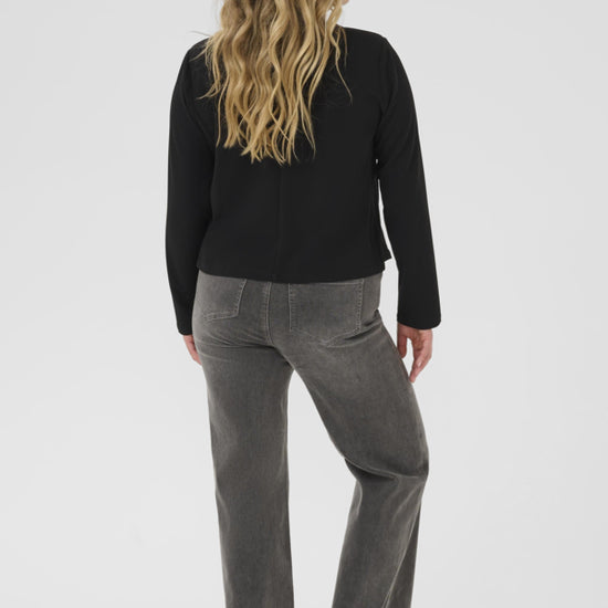 Cardiganen er laget i et vevd materiale som sikrer et flott fall og en behagelig passform. Den er ideell for å skape et lag-på-lag-utseende og kan enkelt kombineres med andre bluser eller topper fra vår kolleksjon. Med sin klassiske svarte farge og stilrene design vil denne cardiganen uten tvil bli et allsidig og uunnværlig element i garderoben din.