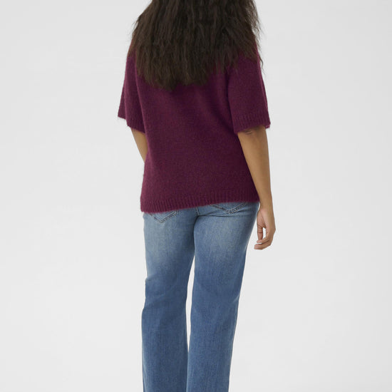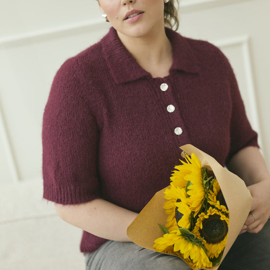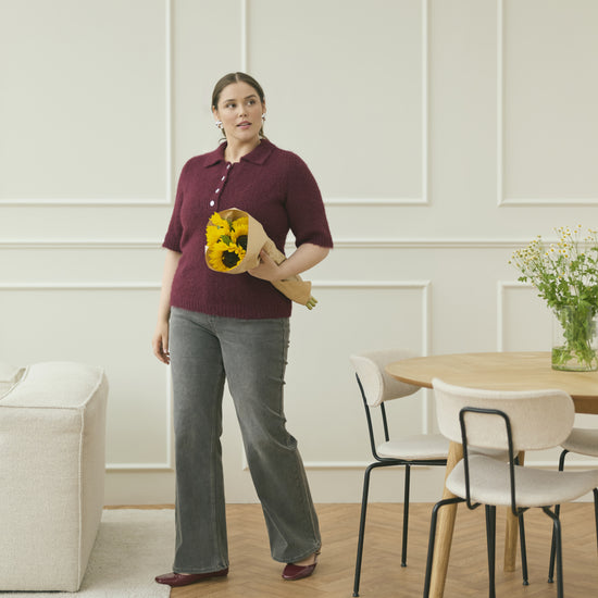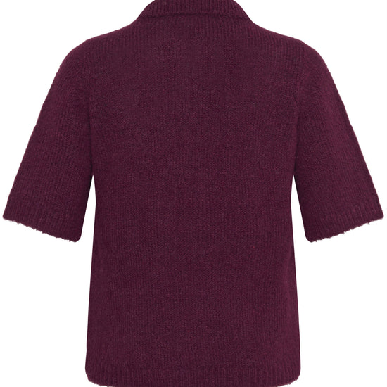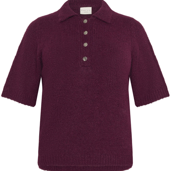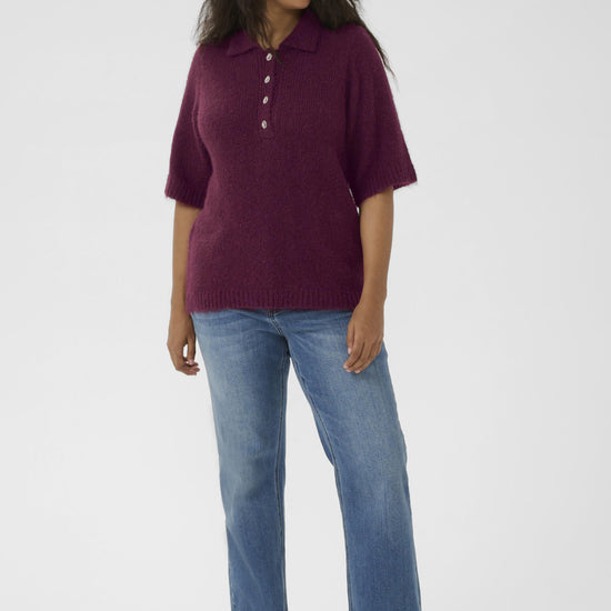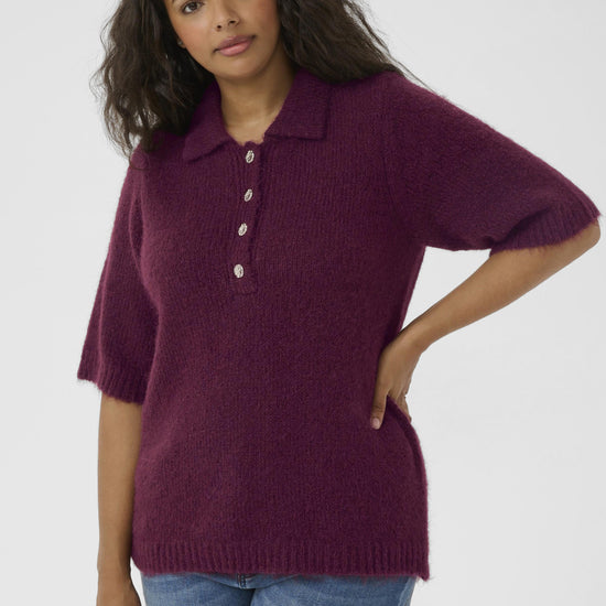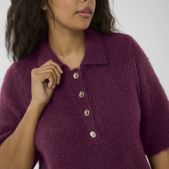 Gjør garderoben komplett med denne myke og elegante strikkegenseren fra Kaffe Curve i den dype fargen Windsor Wine. Genseren har en klassisk polokrage og halv knappestolpe med fire dekorative knapper, som gir et feminint og eksklusivt uttrykk. Materialet består av en luksuriøs blanding av resirkulert polyester, ull og alpaka, noe som gir en ekstra behagelig og myk følelse mot huden.