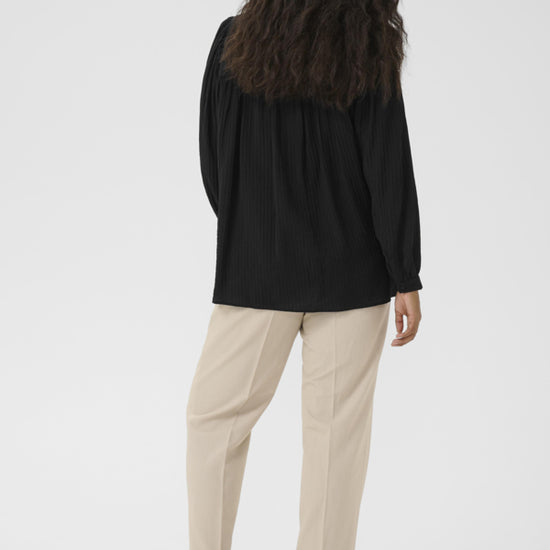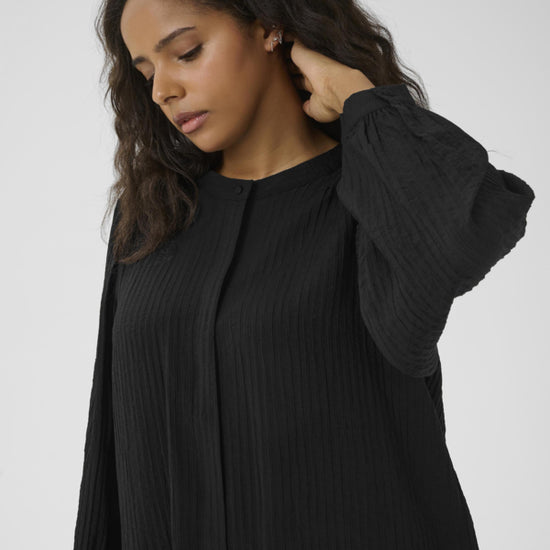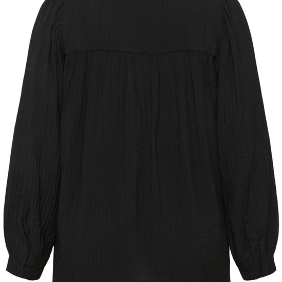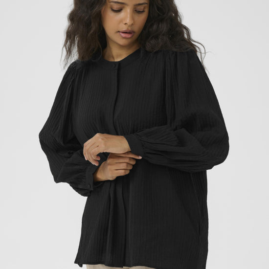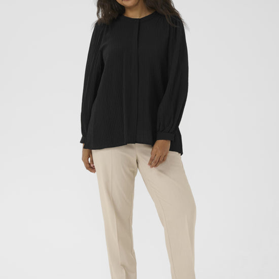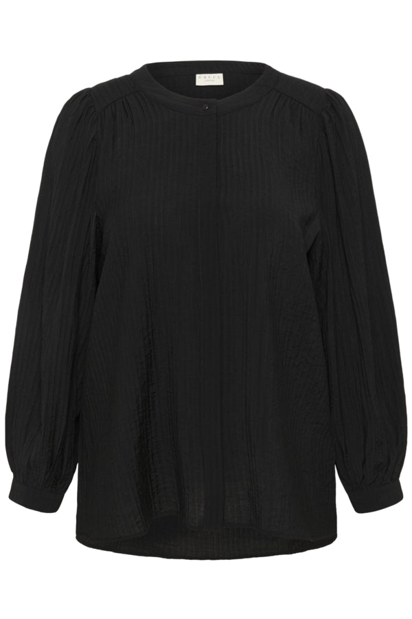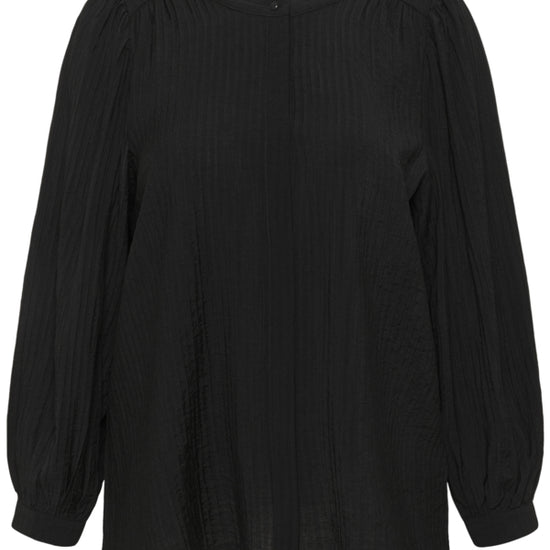 Blusens subtile tekstur og puffede ermer gir en moderne dimensjon til det klassiske designet. Den runde halsutskjæringen og de diskrete knappene sikrer et stilrent utseende.