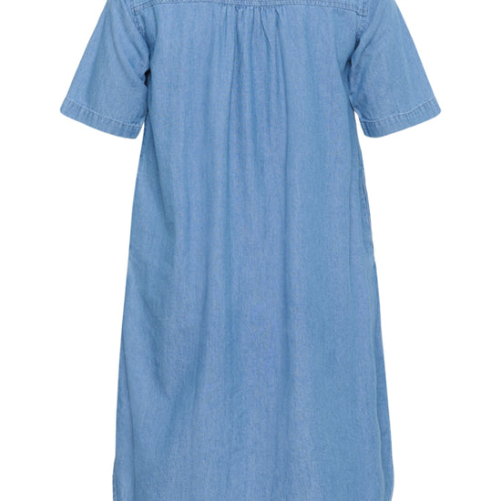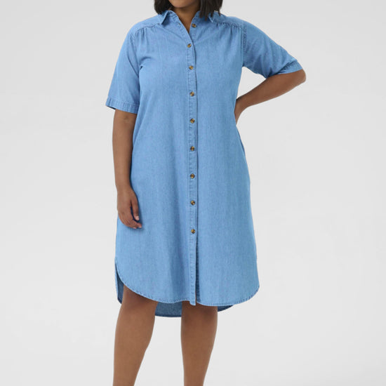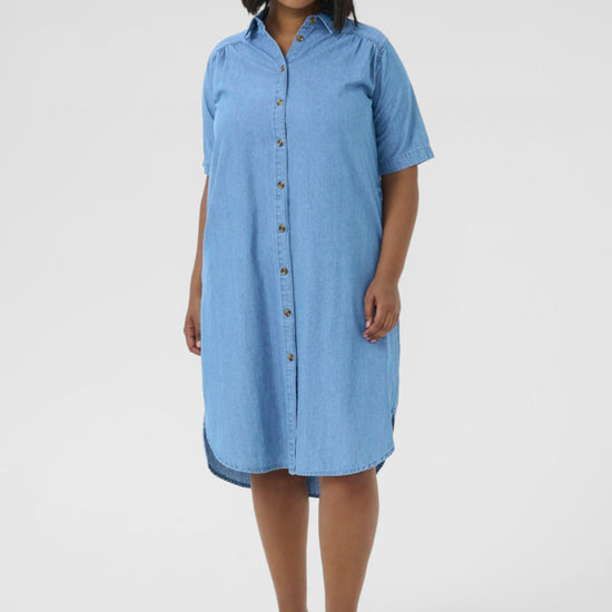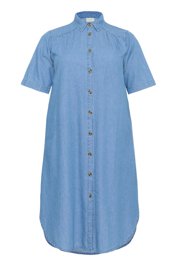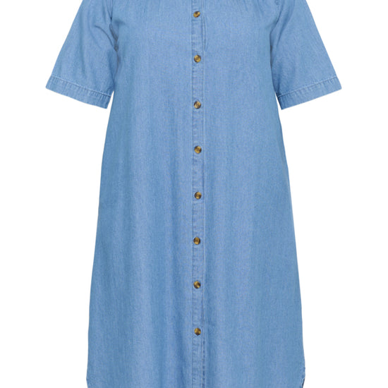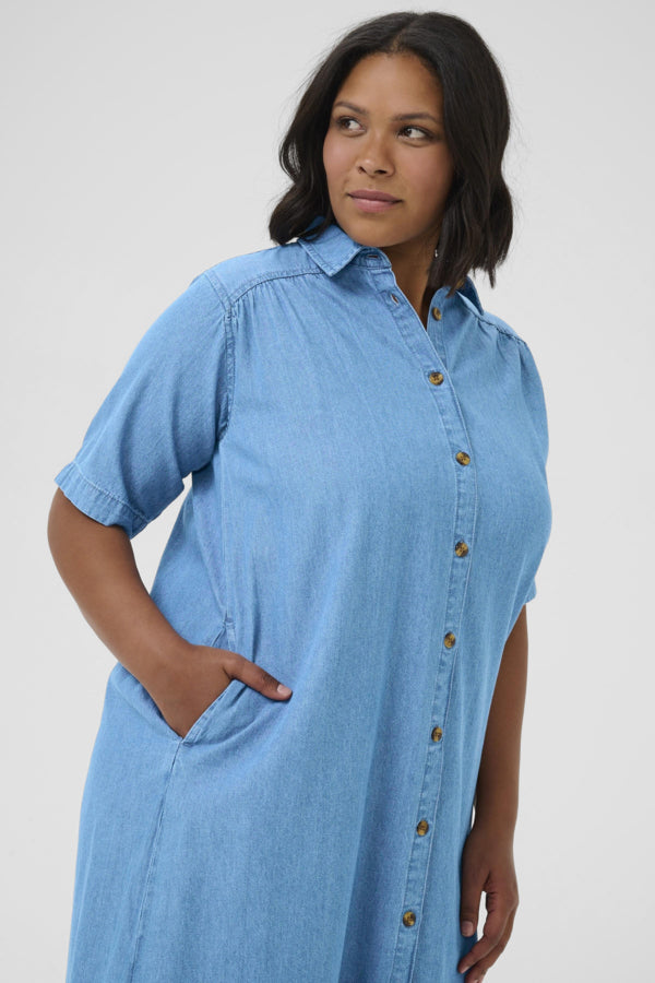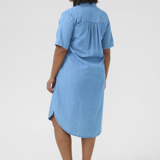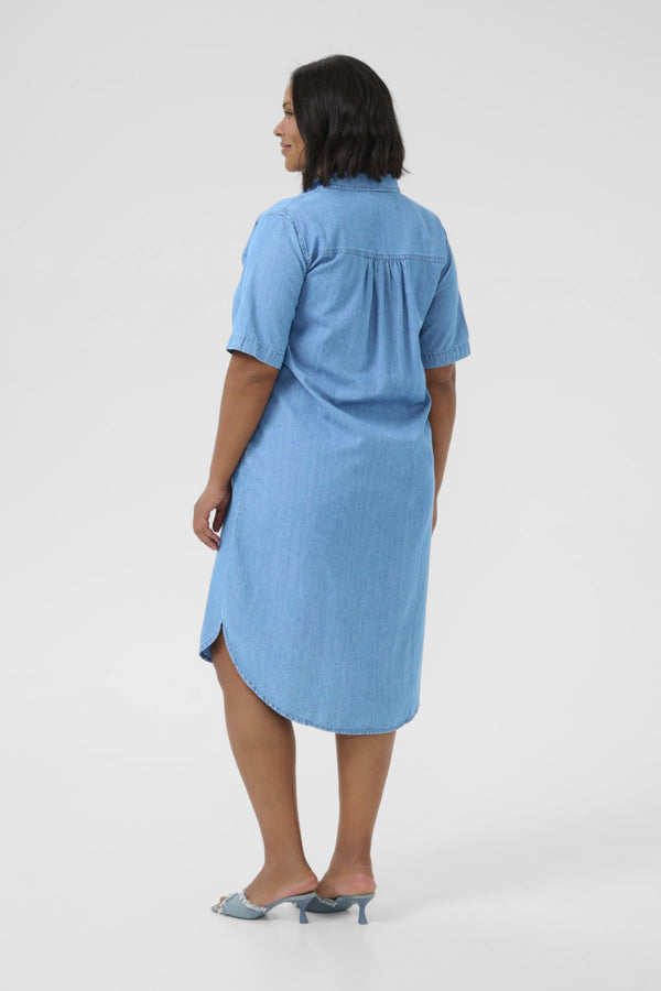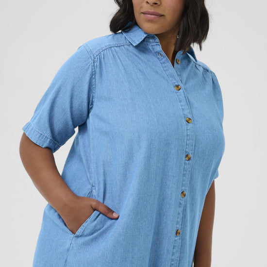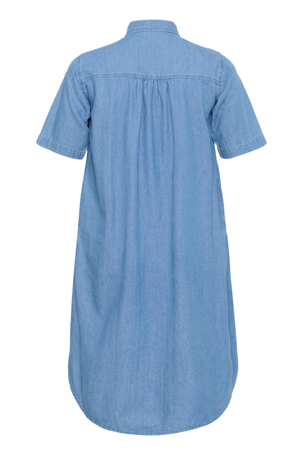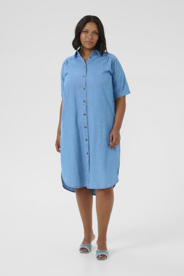 Opplev den perfekte kombinasjonen av stil og komfort med denne vakre kjolen fra Kaffe Curve. Kjolen er laget av 100% bomull, noe som sikrer en myk og pustende opplevelse hele dagen. Designet er vevd, noe som gir en lett og luftig struktur som faller vakkert på kroppen. Den klassiske medium blå chambray-fargen gjør kjolen allsidig og tidløs, perfekt for enhver anledning.